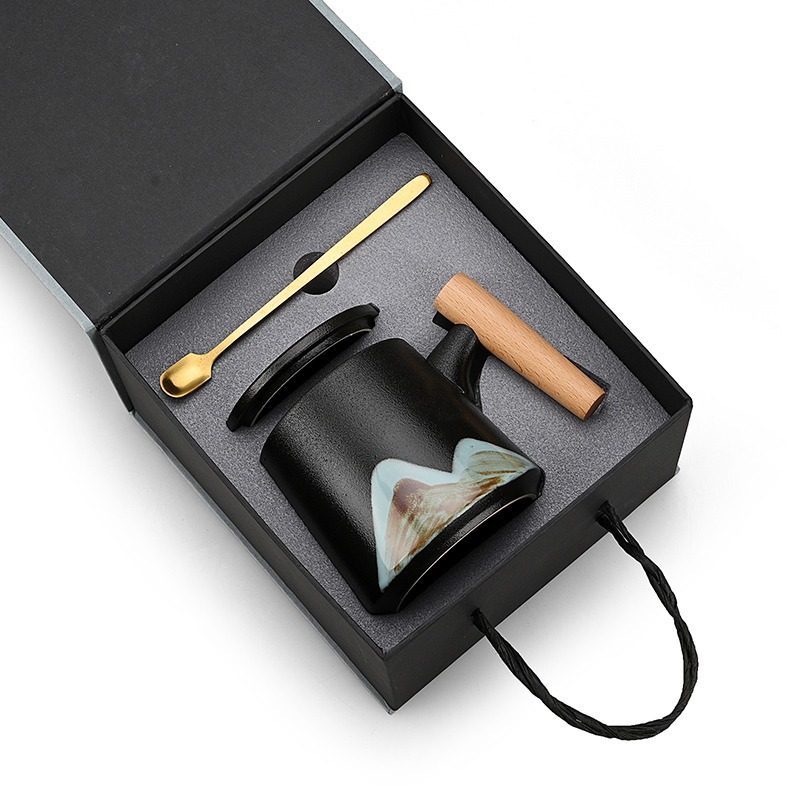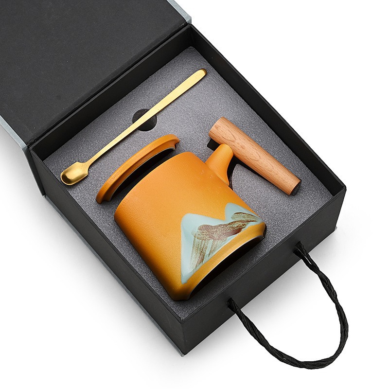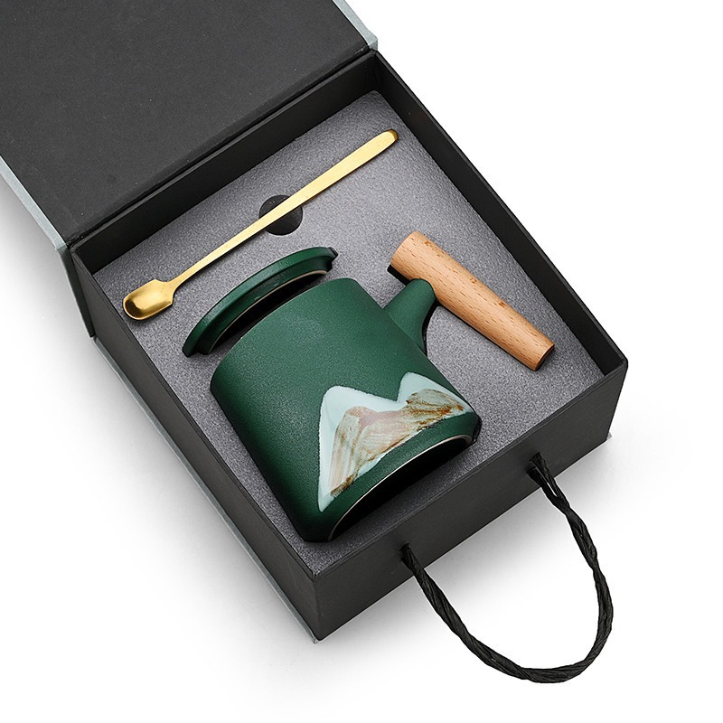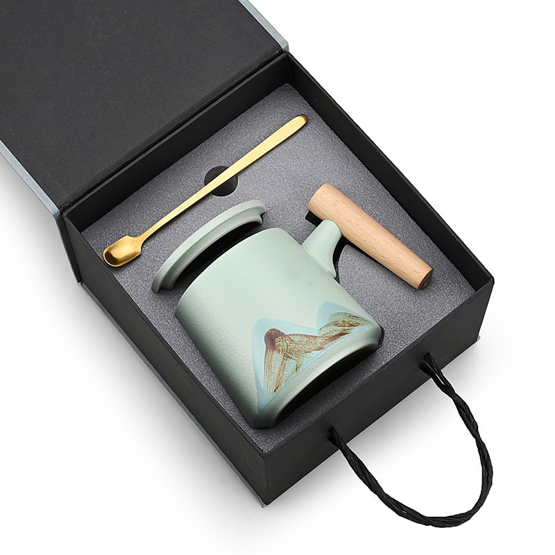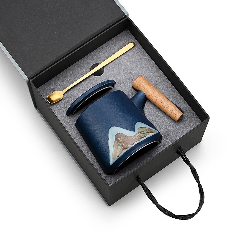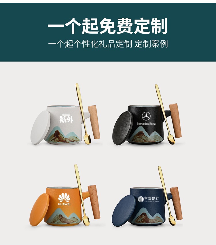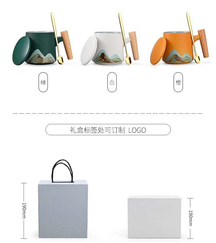 手绘远山木柄陶瓷咖啡马克杯带盖勺粗陶杯子办公水杯茶水带盖勺杯