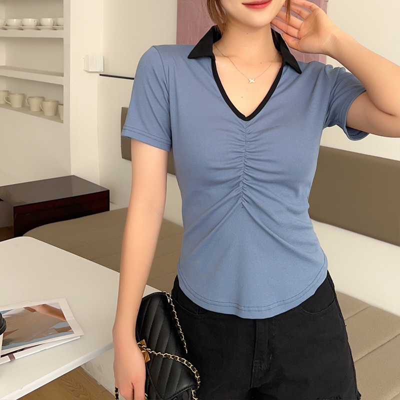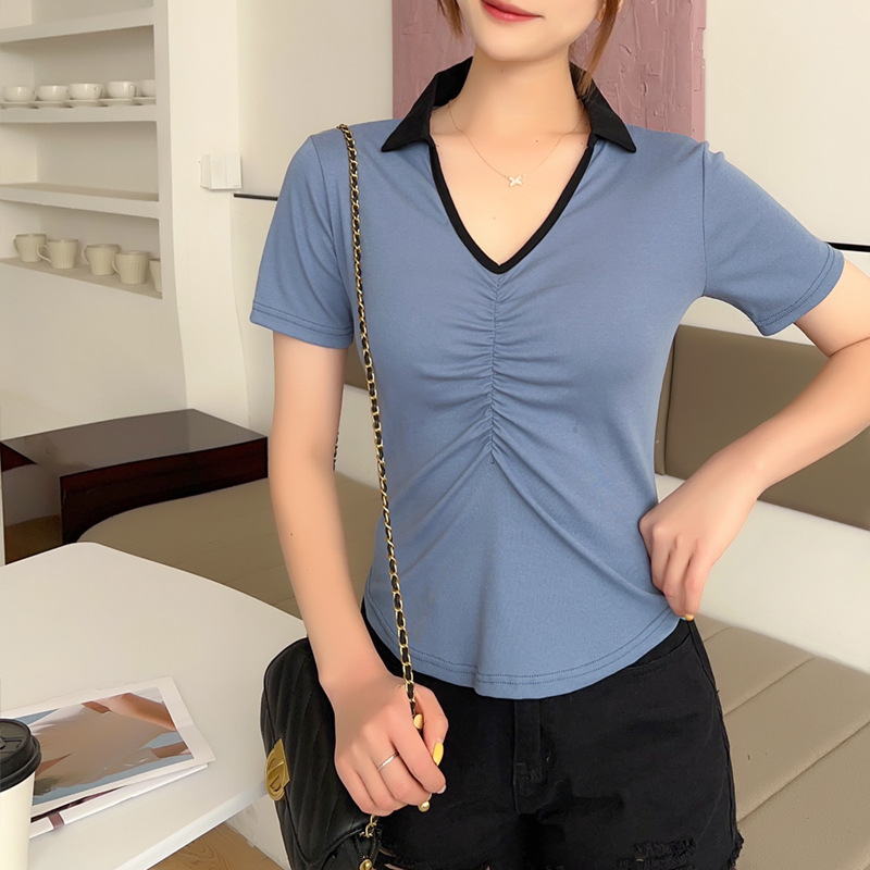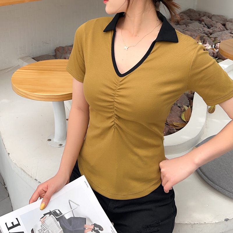 화이트 반팔 티셔츠 여성용 여름 신형 한국식 서양식 슬림핏 POLO 칼라 반팔 티셔츠 브이넥 탑 트렌디스토어 가기