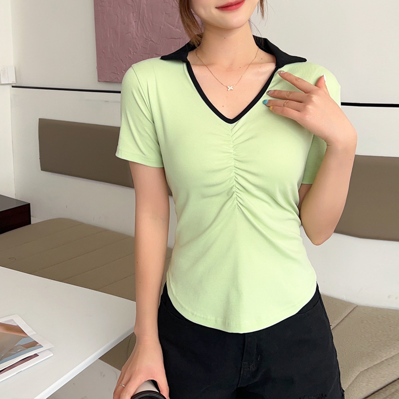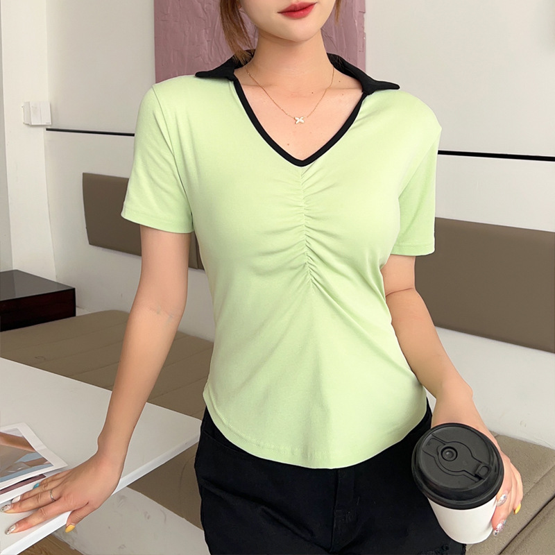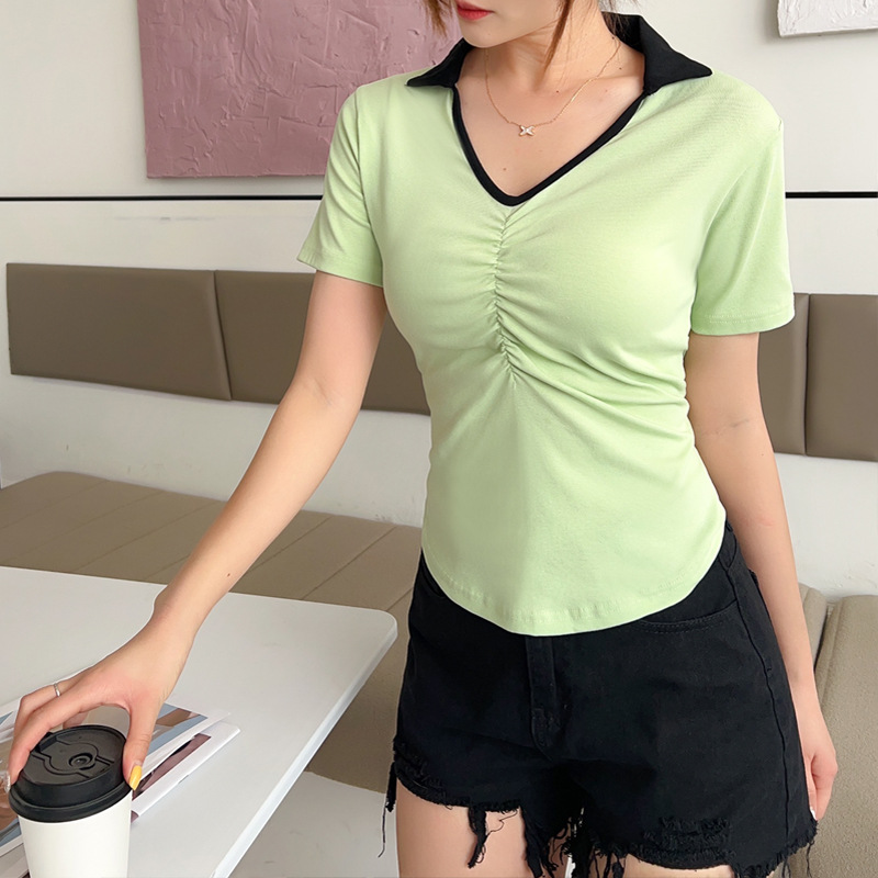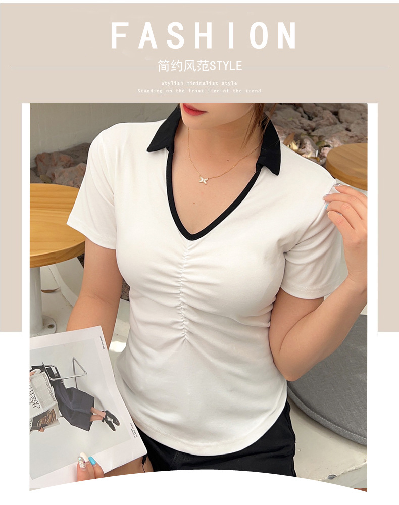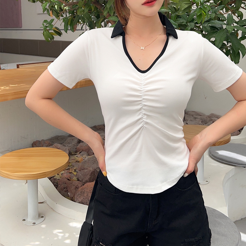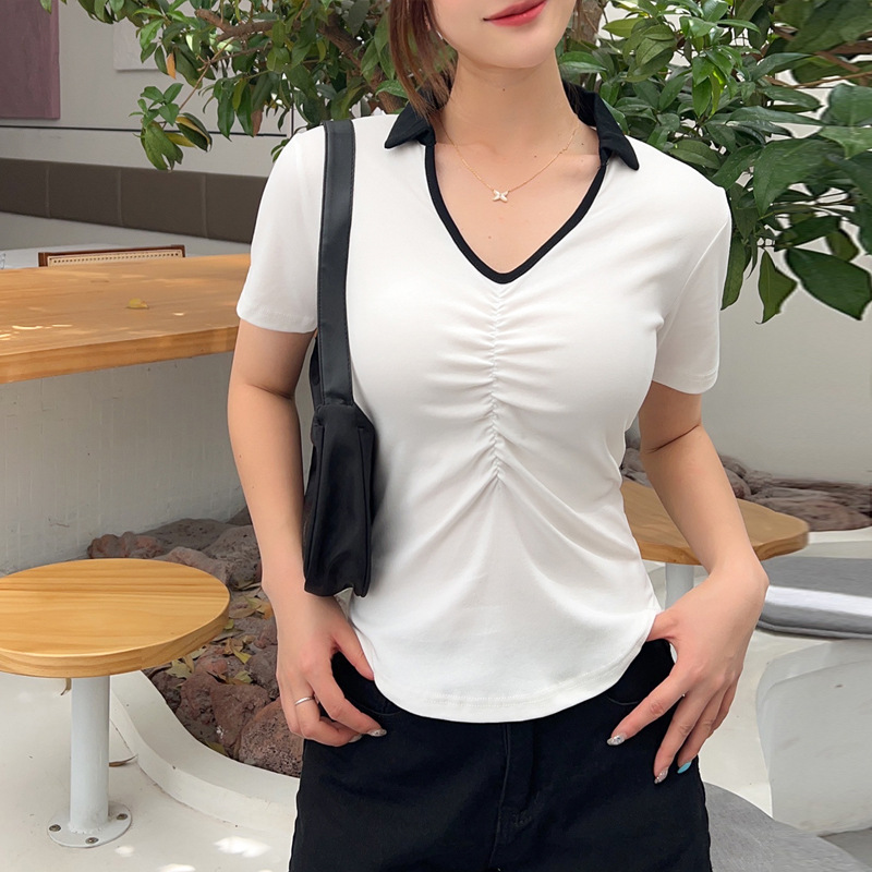 화이트 반팔 티셔츠 여성용 여름 신형 한국식 서양식 슬림핏 POLO 칼라 반팔 티셔츠 브이넥 탑 트렌디