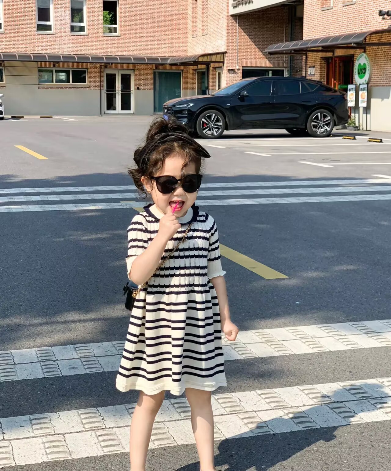 여자 여름 치마 북유럽 스타일의 새로운 우아한 레이스 스트라이프 니트 짧은 소매 우아한 소녀 원피스스토어 가기