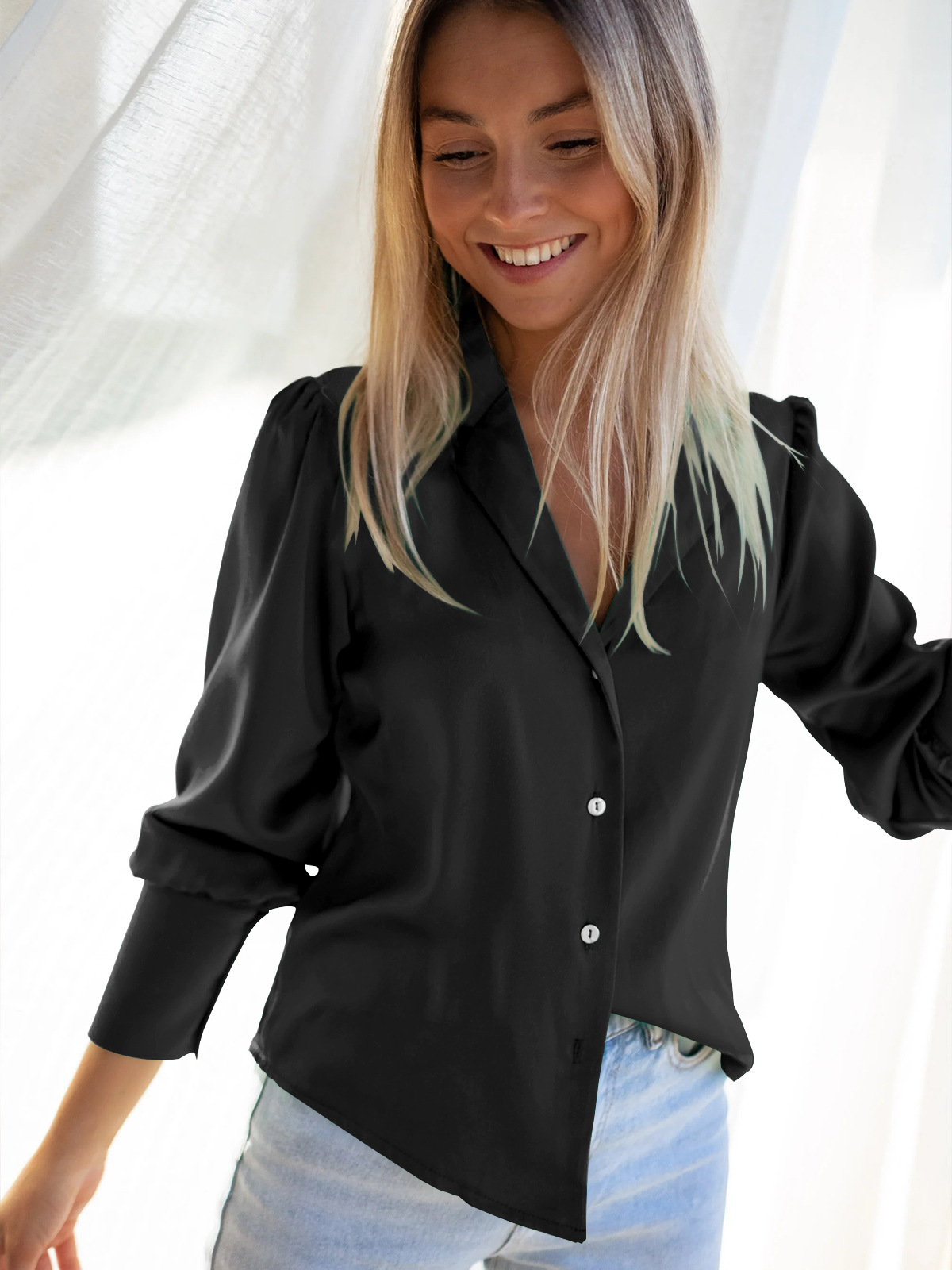 아마존 틈새 고급 새틴 긴팔 여성용 셔츠 단색 모든 매치 통근 탑 느슨한 통기성 여성용 셔츠