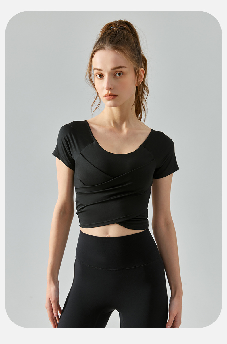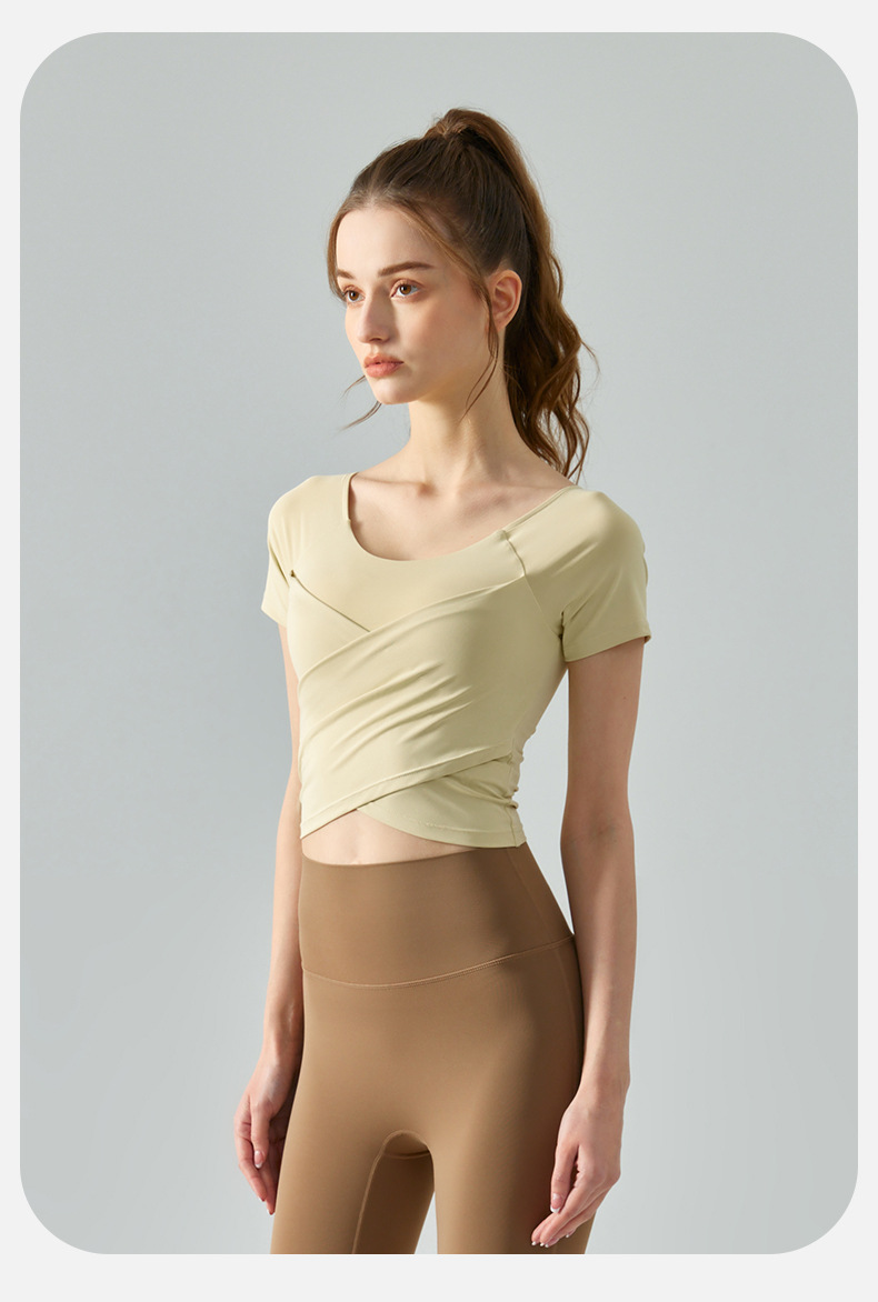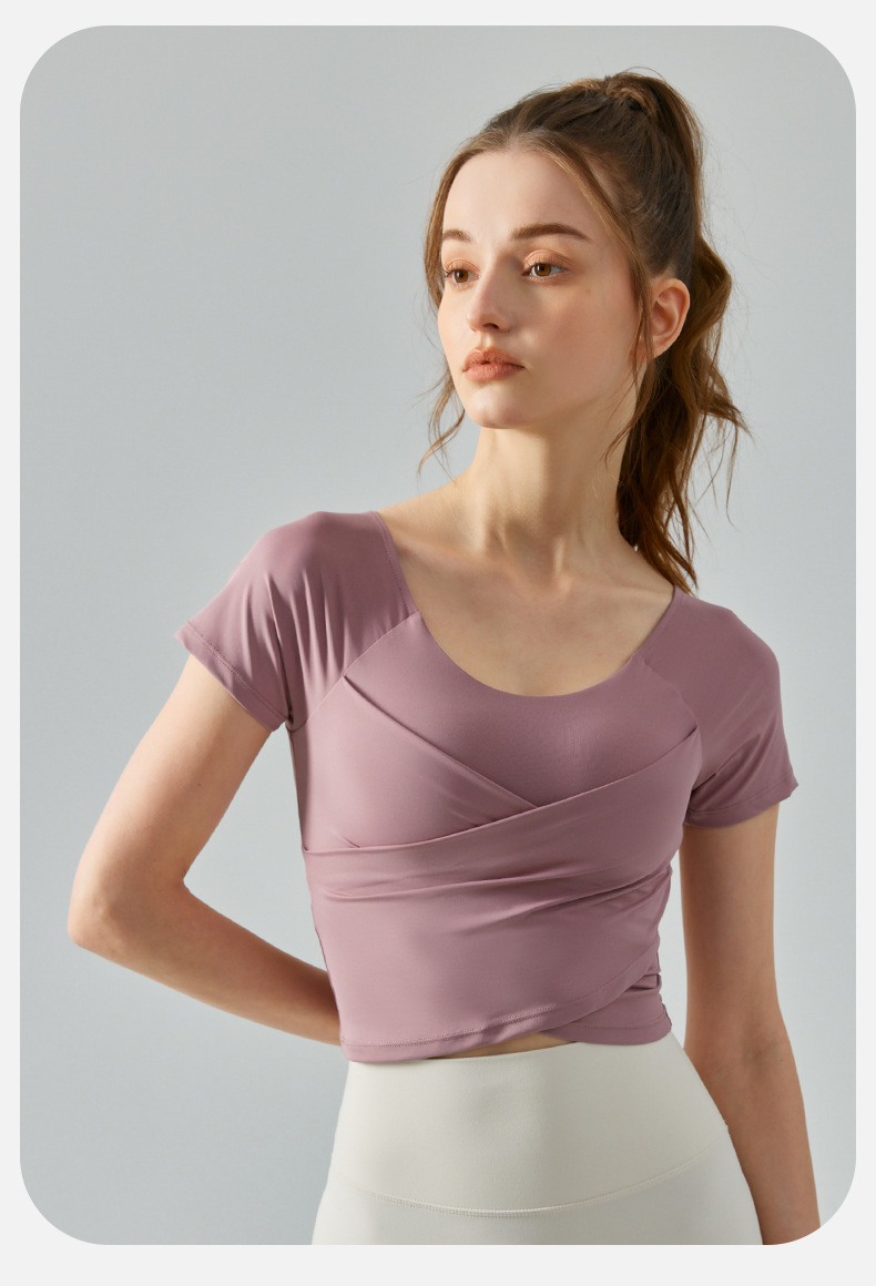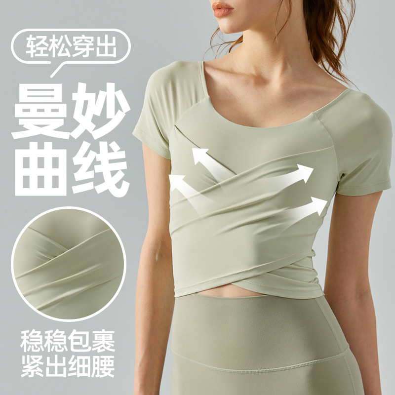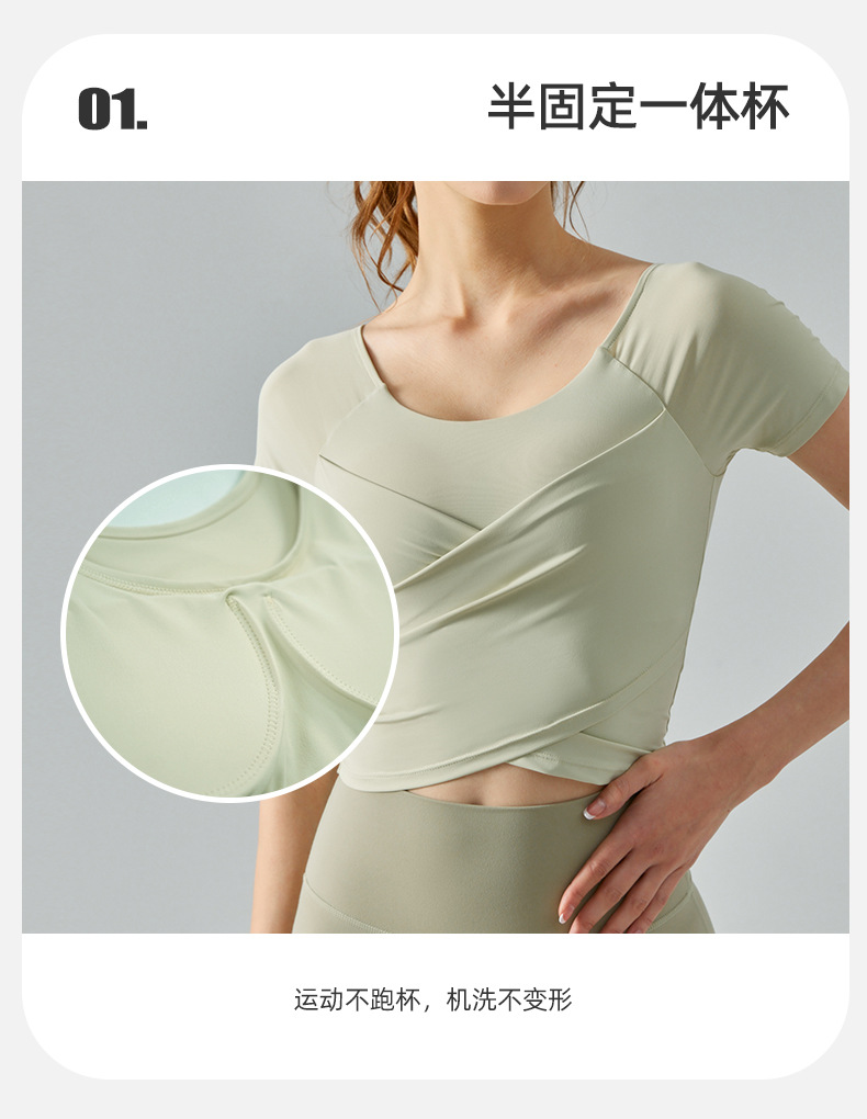 가슴 패드가 있는 여성용 크로스 플리츠 요가 반팔 탑 올인원 스포츠 티셔츠 슬림 러닝 피트니스웨어 탑스토어 가기