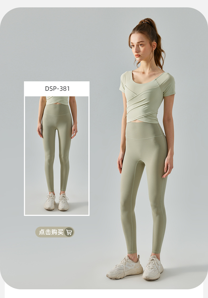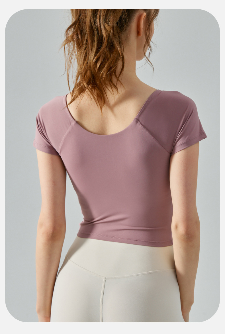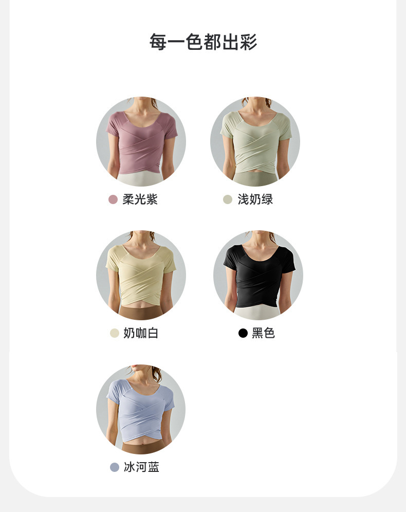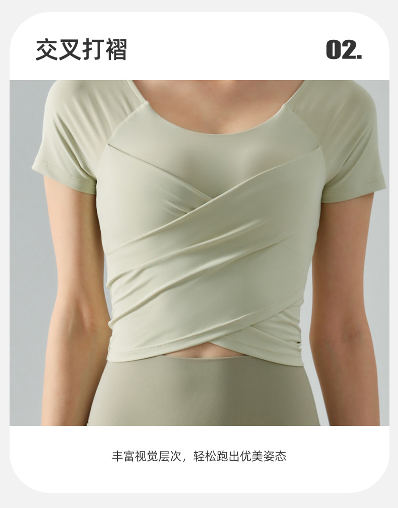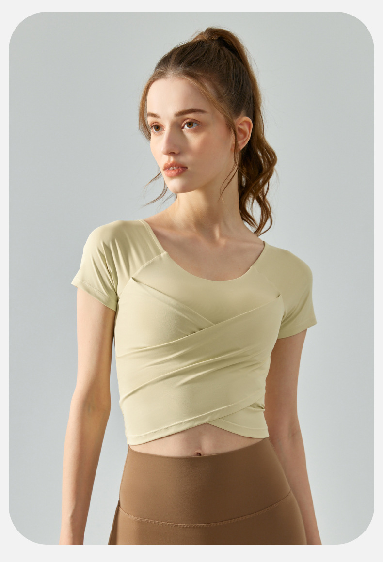 가슴 패드가 있는 여성용 크로스 플리츠 요가 반팔 탑 올인원 스포츠 티셔츠 슬림 러닝 피트니스웨어 탑스토어 가기