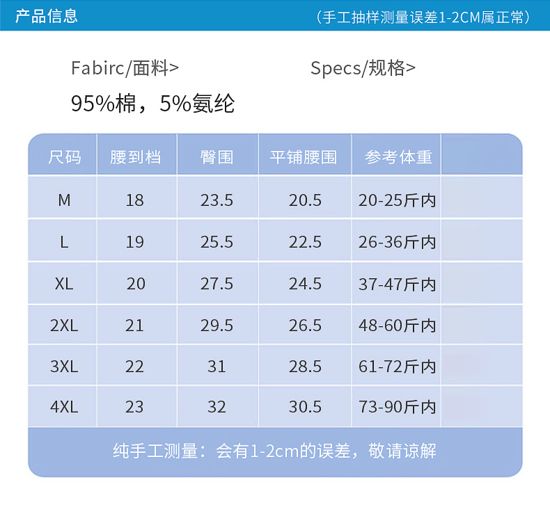 4条的克重及侧长:M:127.5克/15.5cm,L:141.5/16.5 ,XL:155/17.5, 2XL:163.5/18.5,3XL:176/19 4XL:194.5/21