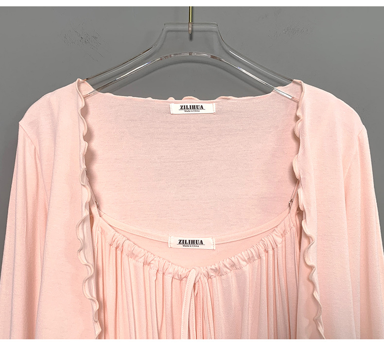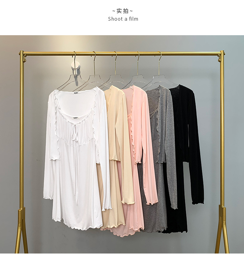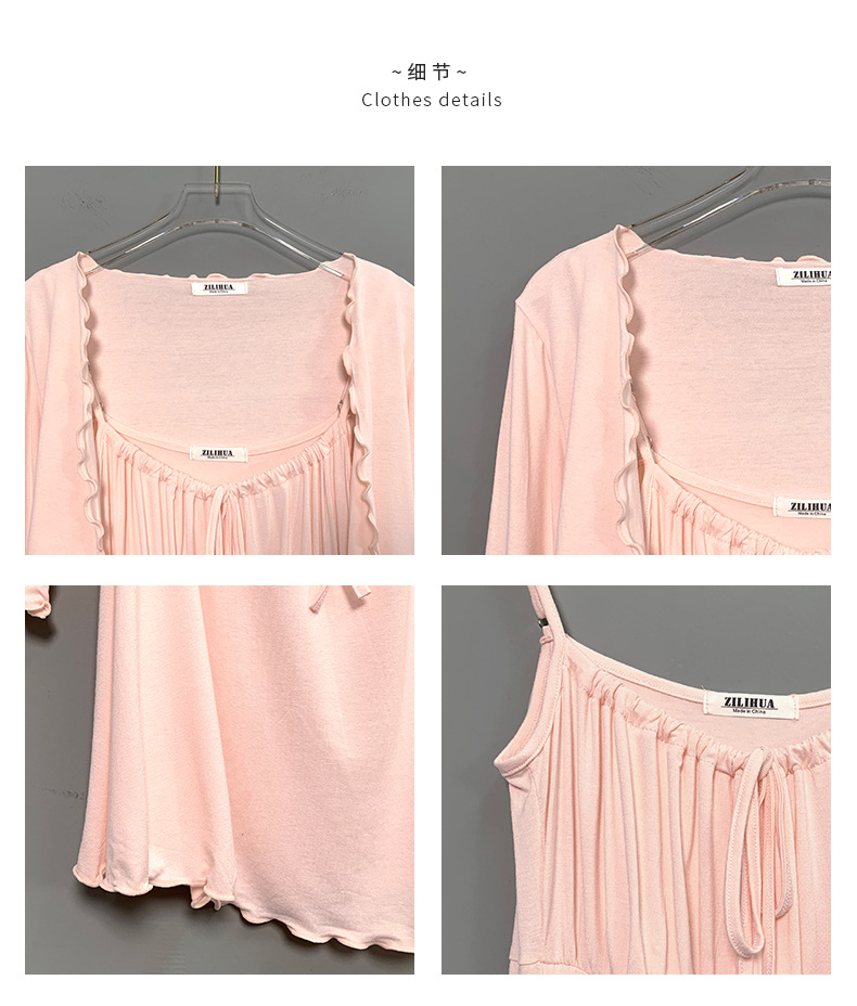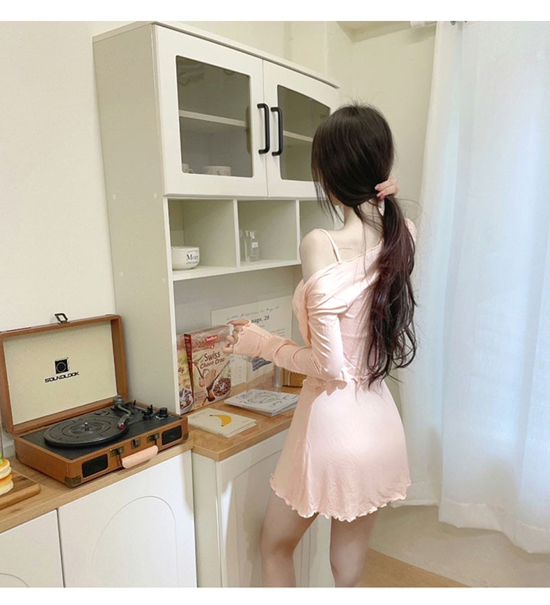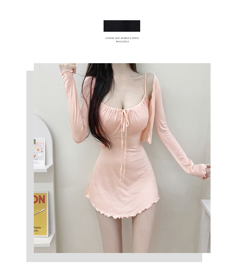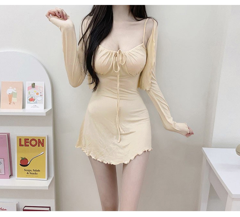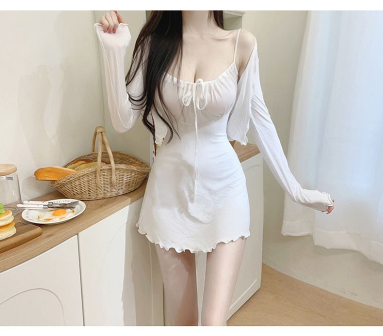 한국 동대문 슬림핏 섹시 피규어 스커트 우드이어 스트랩 + 얇은 긴팔 선크림 셔츠 여성용 투피스 세트스토어 가기