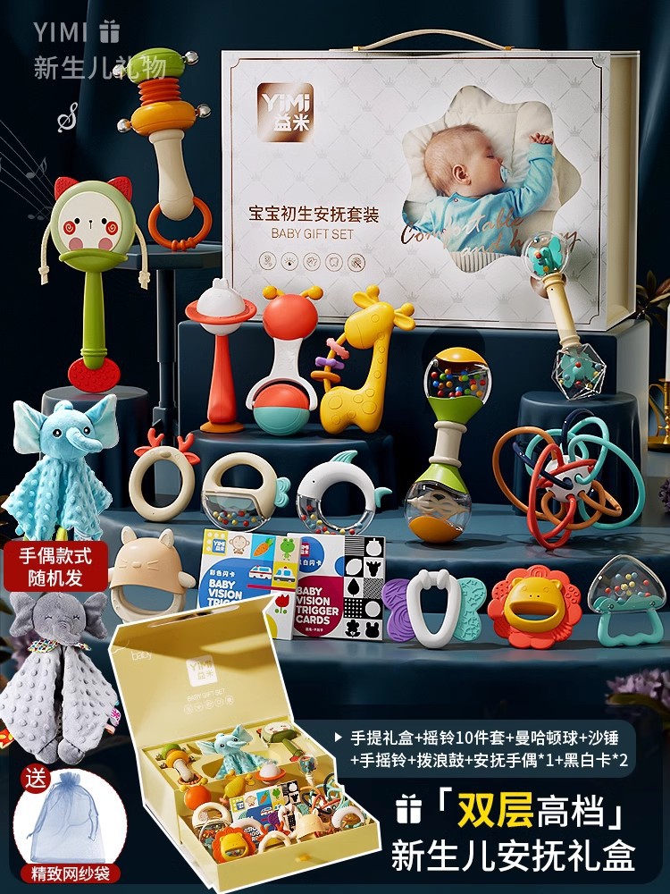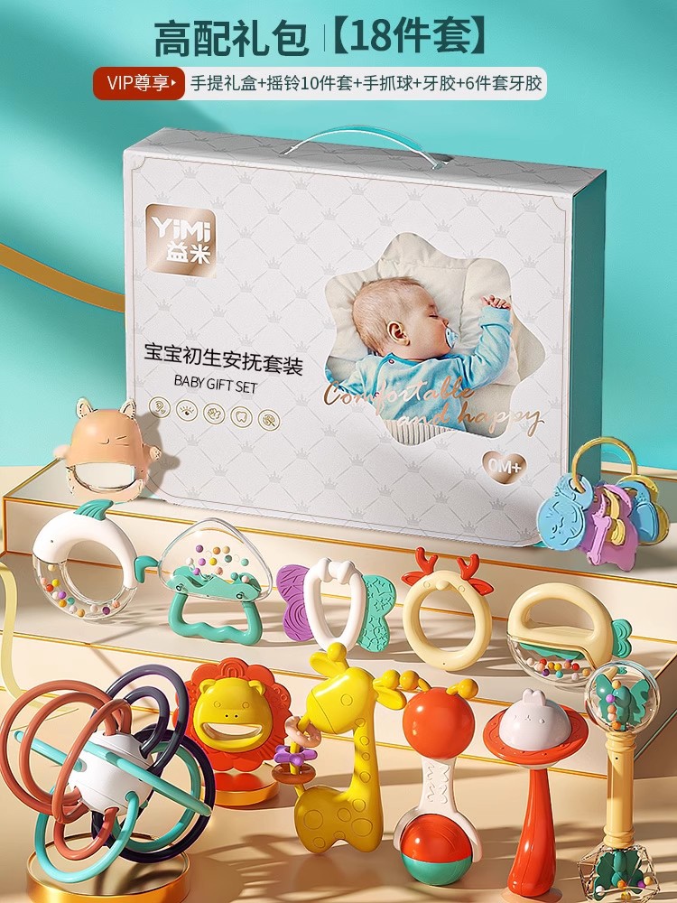 • 고급스러운 선물 [신생을 환영합니다] 치발기/딸랑이 + 조기교육용품 (18종 세트) + 선물가방 [맨해튼 공 색상 랜덤]