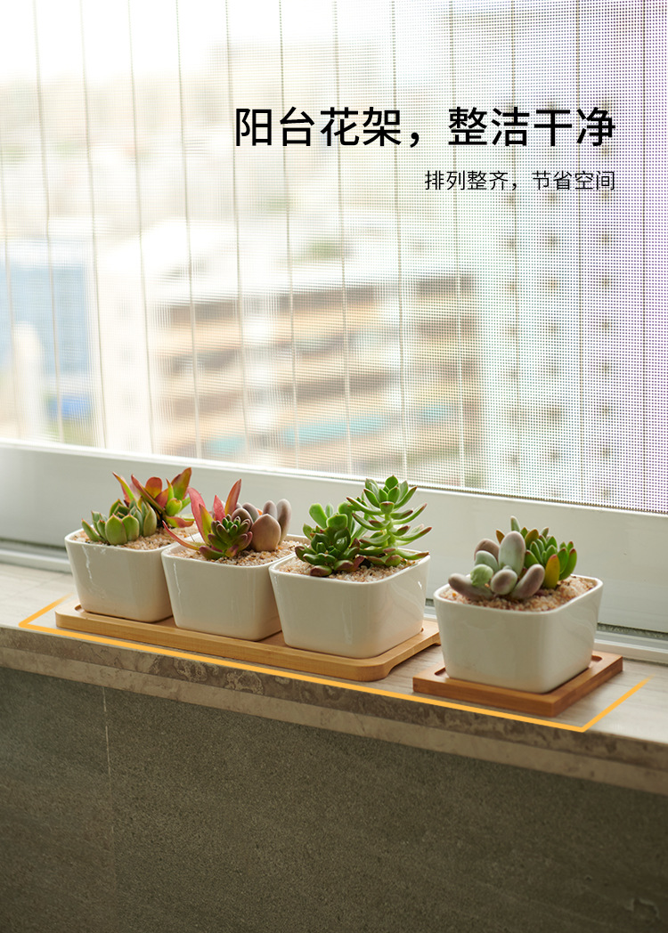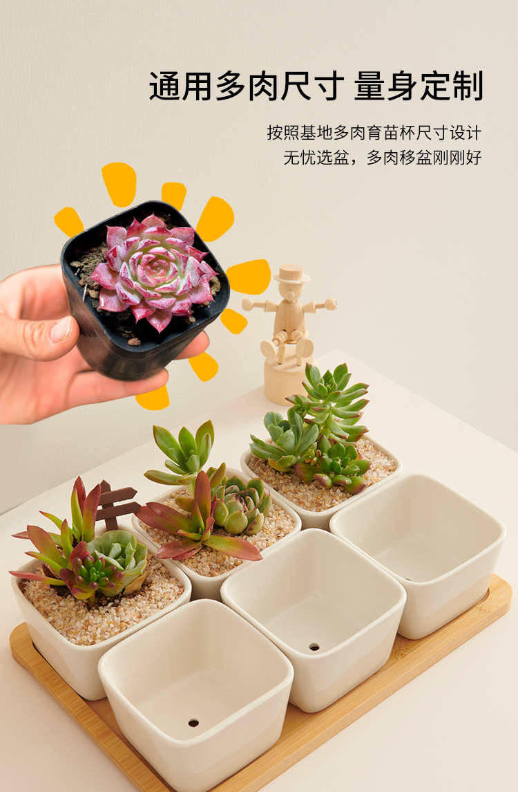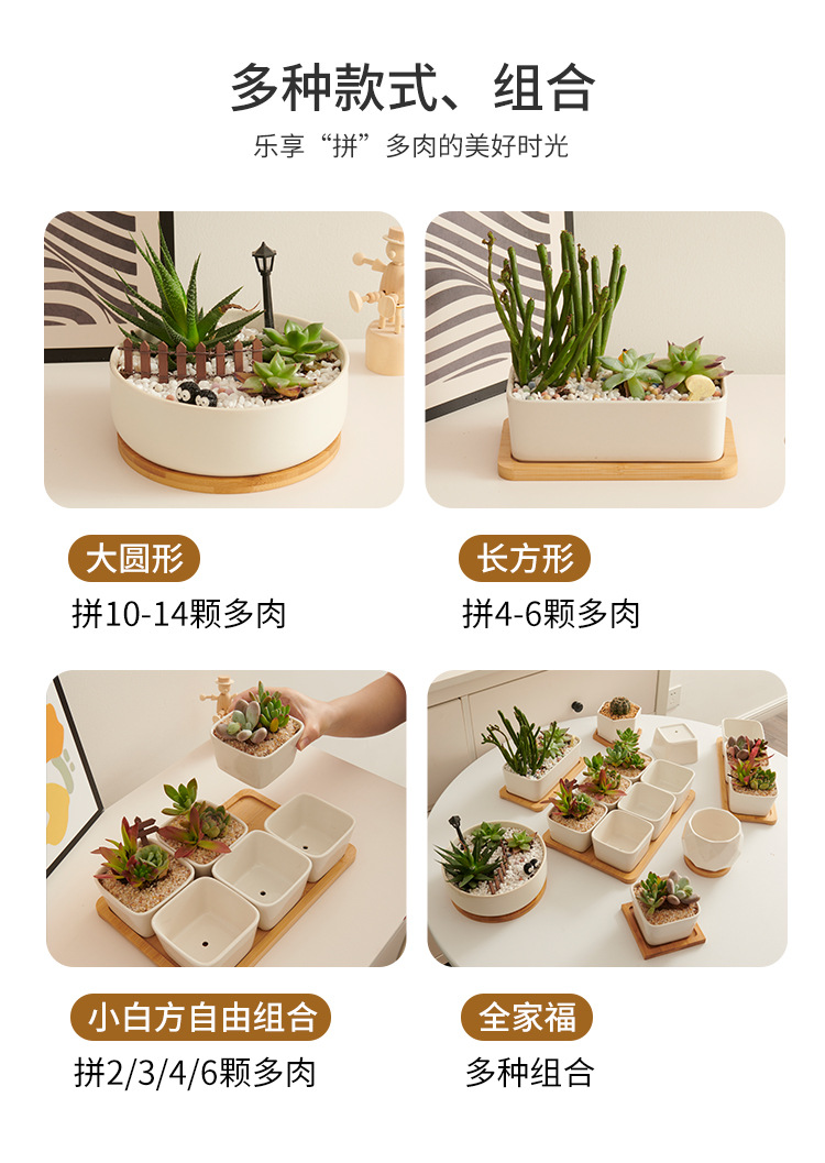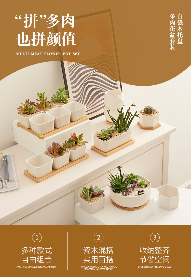 아마존 인기 판매 화이트 다육식물 화분 세라믹 나무 받침대 포함 미니 직사각형 원형 백자 특수 소형 화분 도매스토어 가기