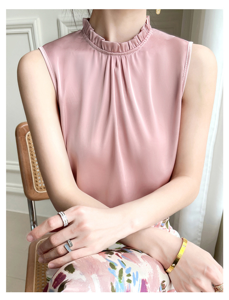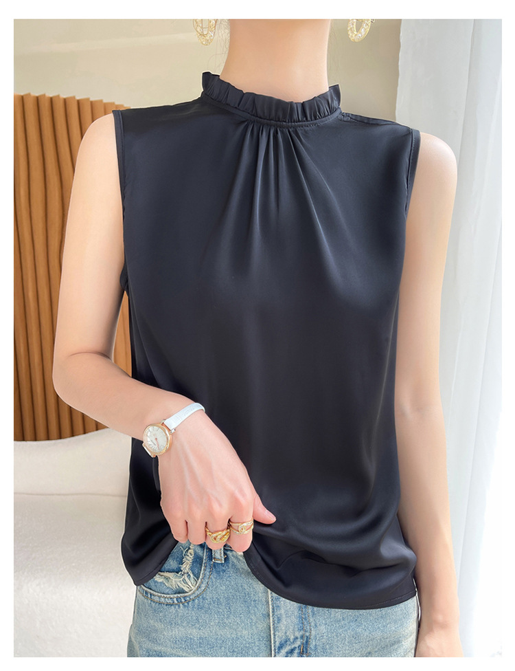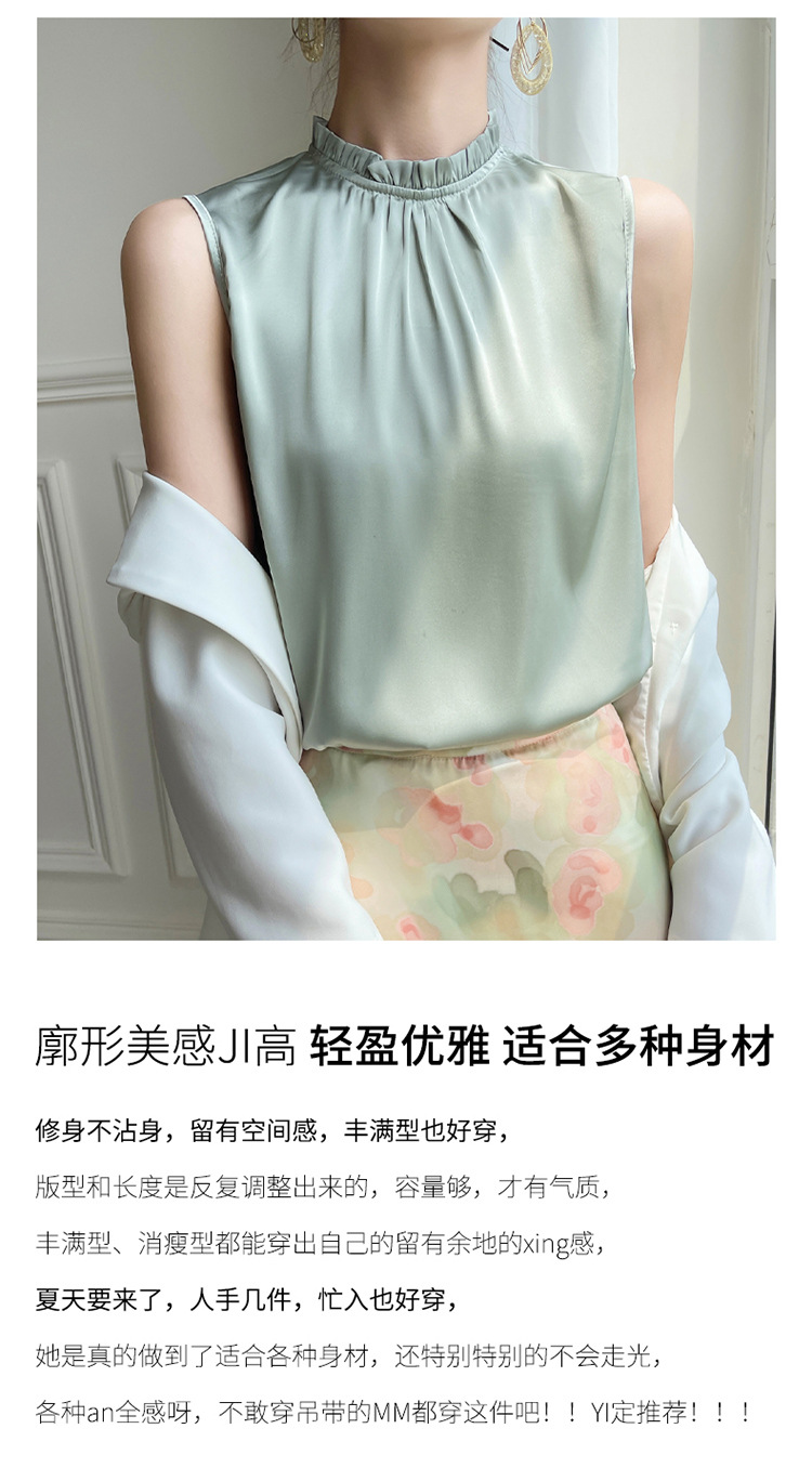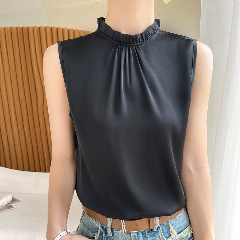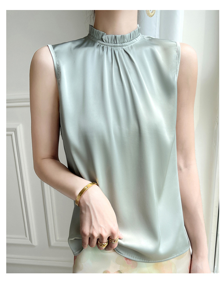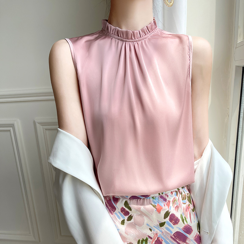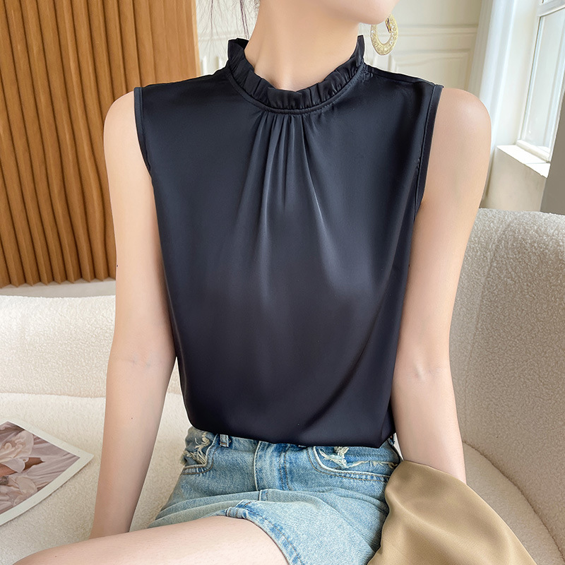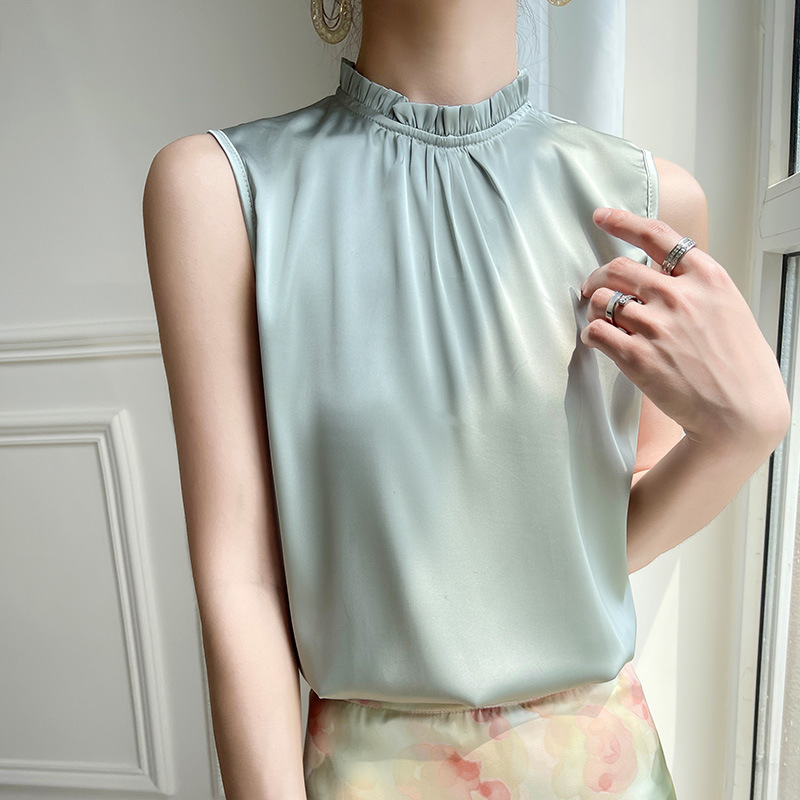 한국 스타일 프랑스 스타일 귀 칼라 민소매 새틴 실크 조끼 여자의 여름 새로운 단색 느슨한 얇은 탑