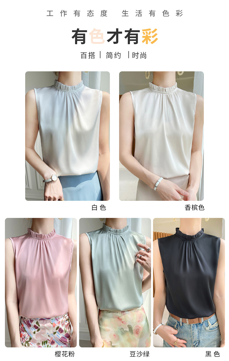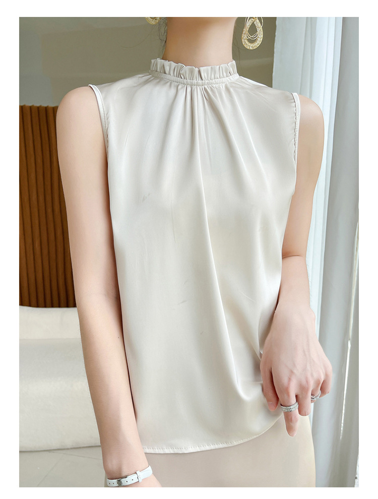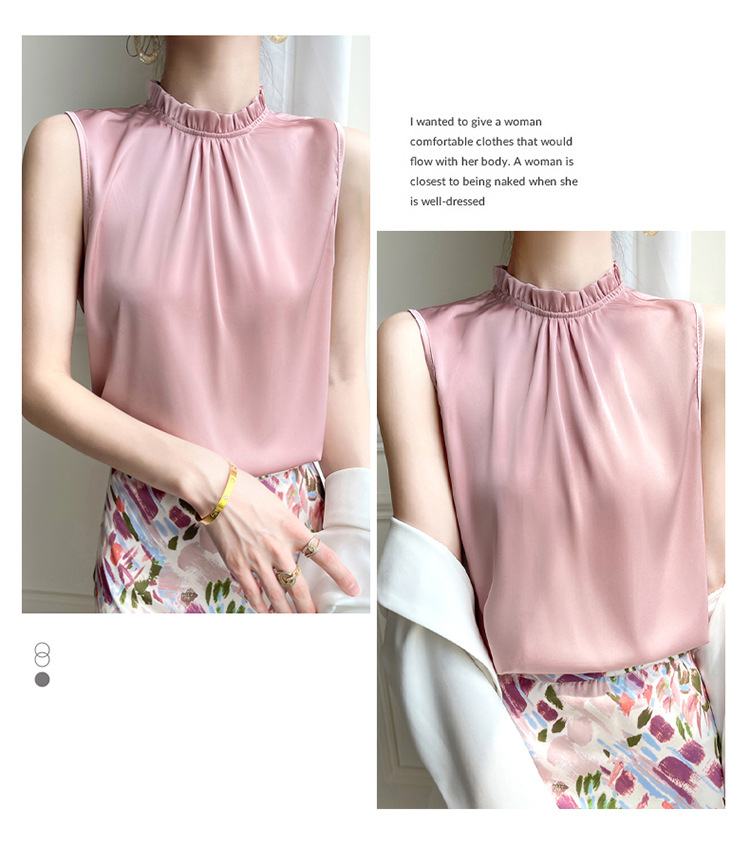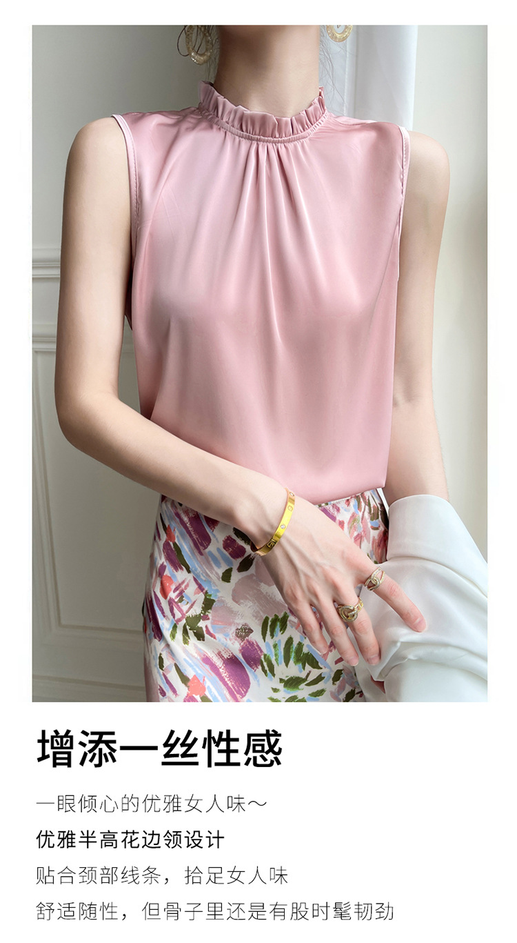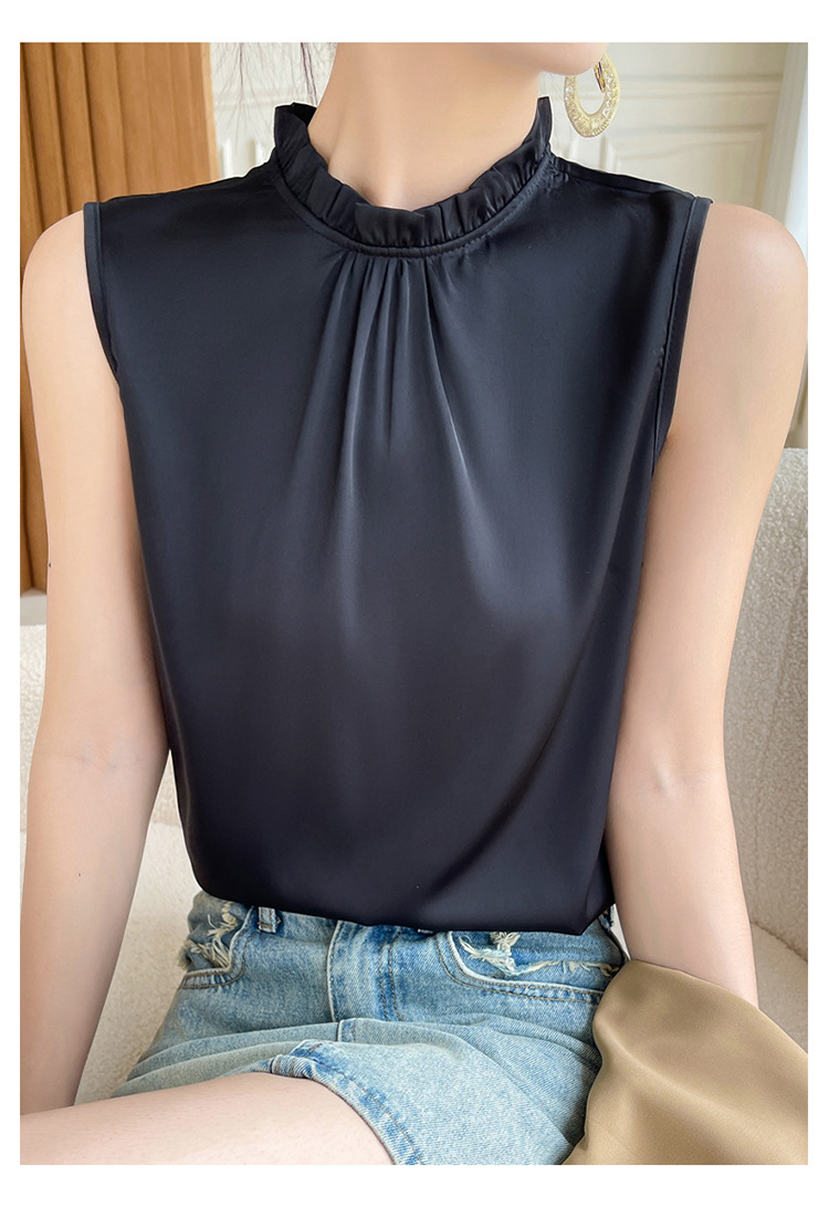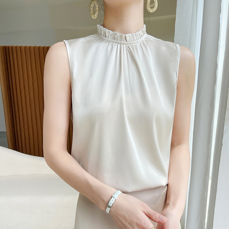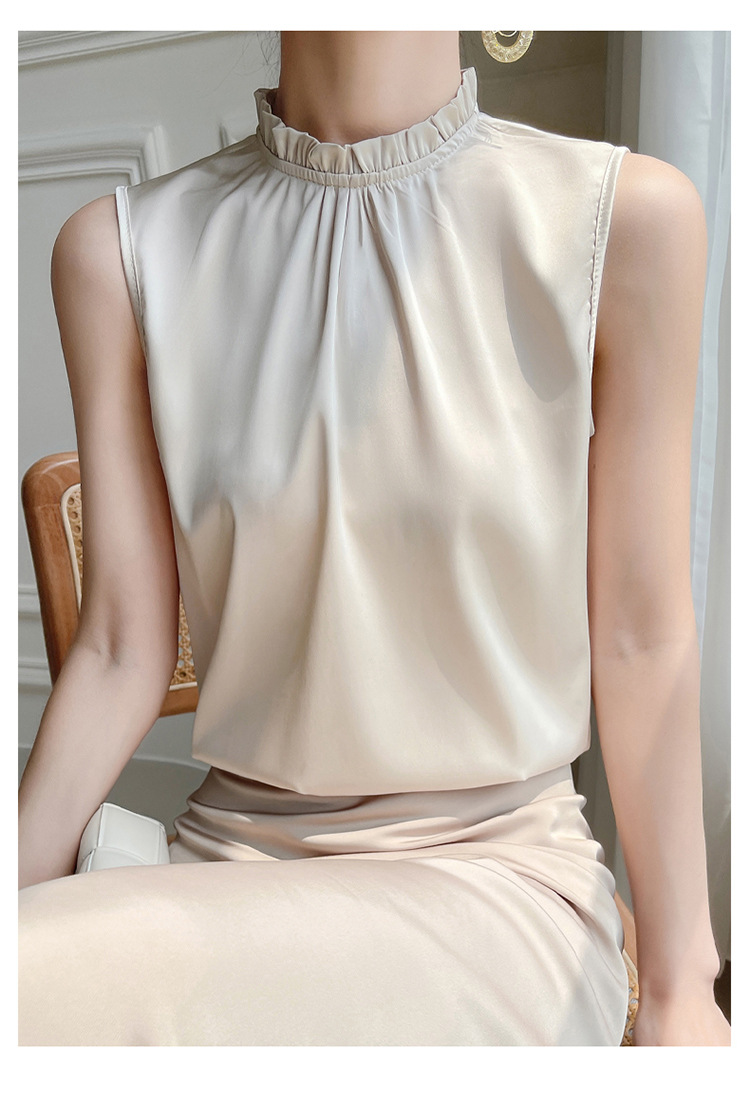 한국 스타일 프랑스 스타일 귀 칼라 민소매 새틴 실크 조끼 여자의 여름 새로운 단색 느슨한 얇은 탑