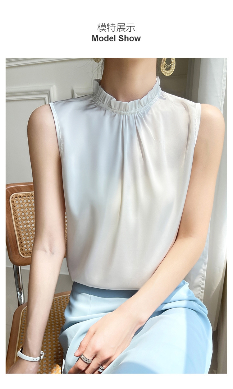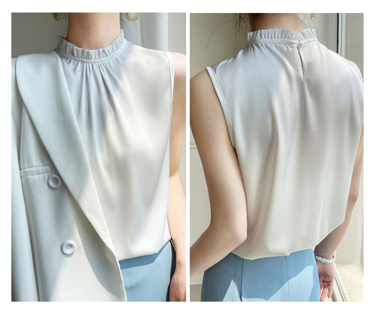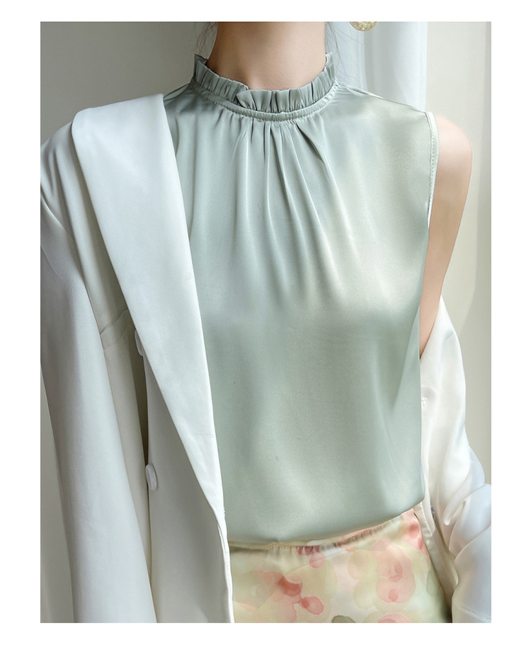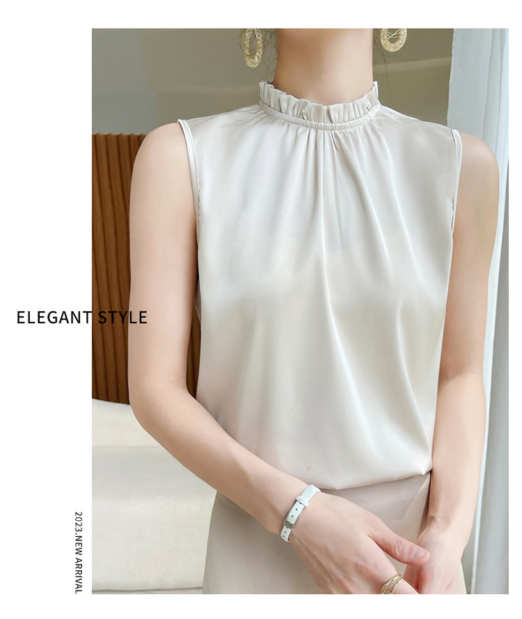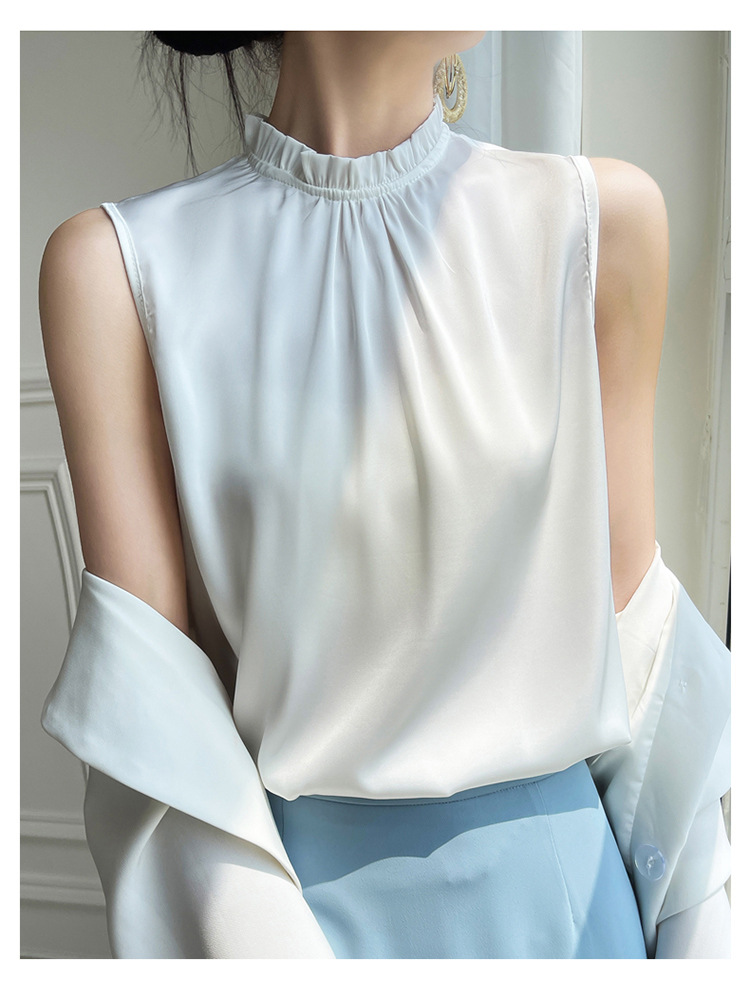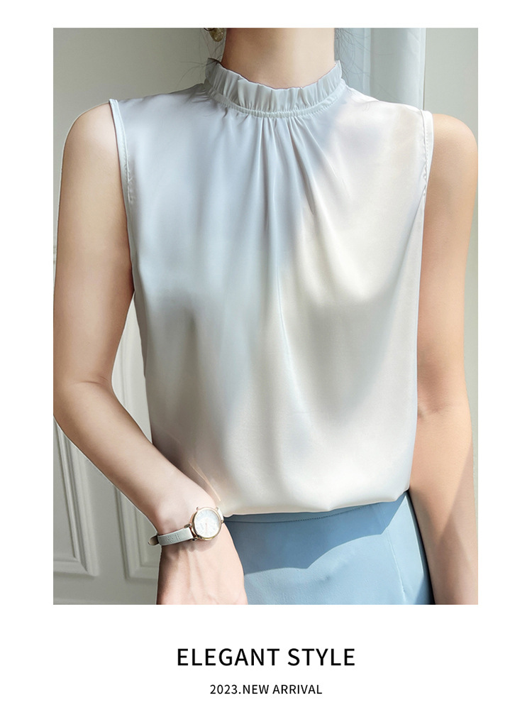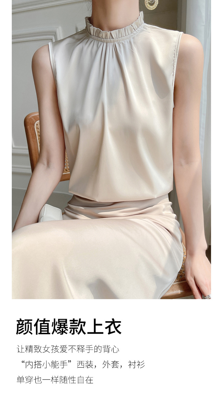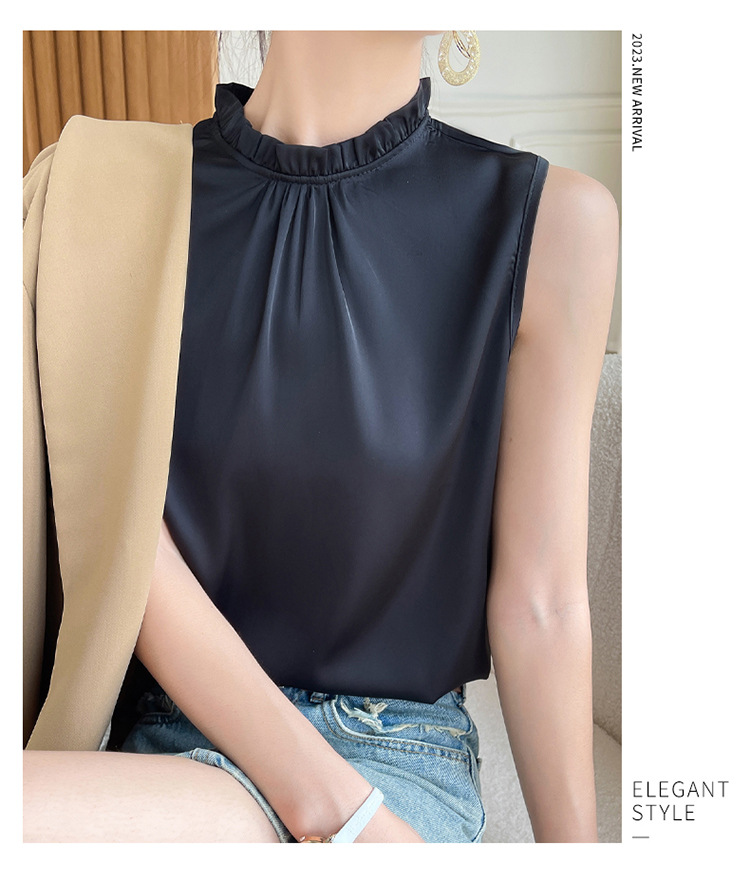 한국 스타일 프랑스 스타일 귀 칼라 민소매 새틴 실크 조끼 여자의 여름 새로운 단색 느슨한 얇은 탑