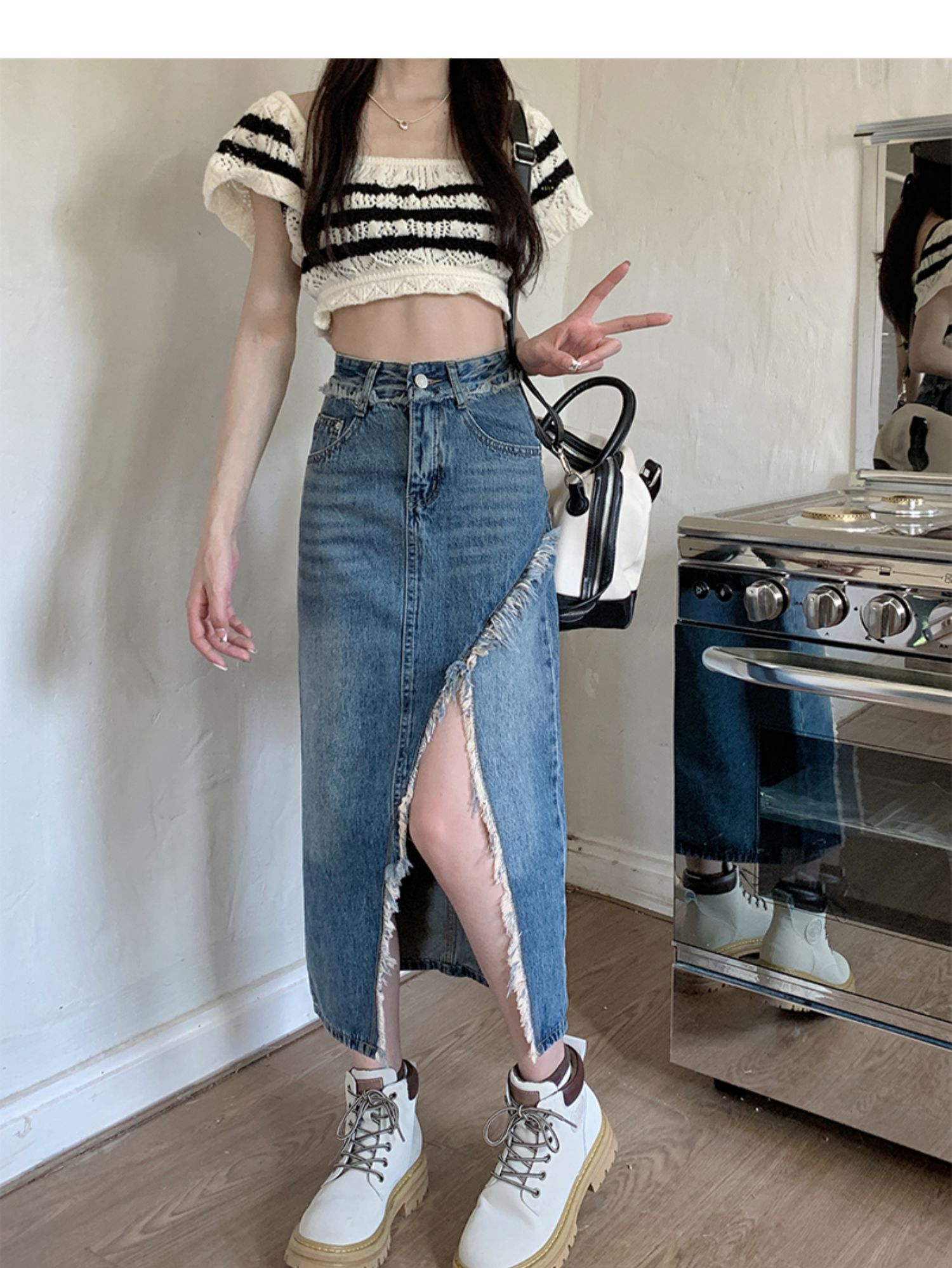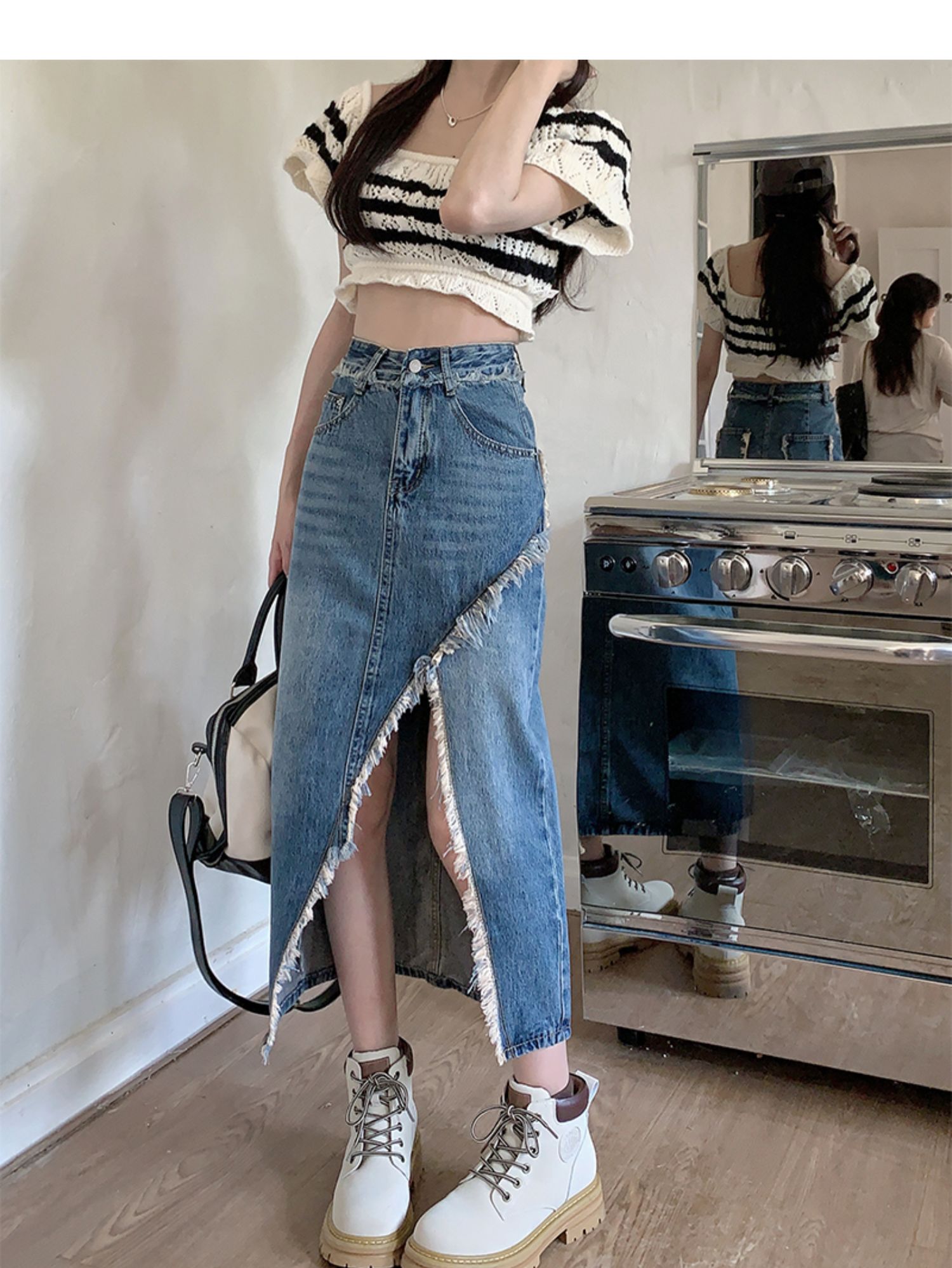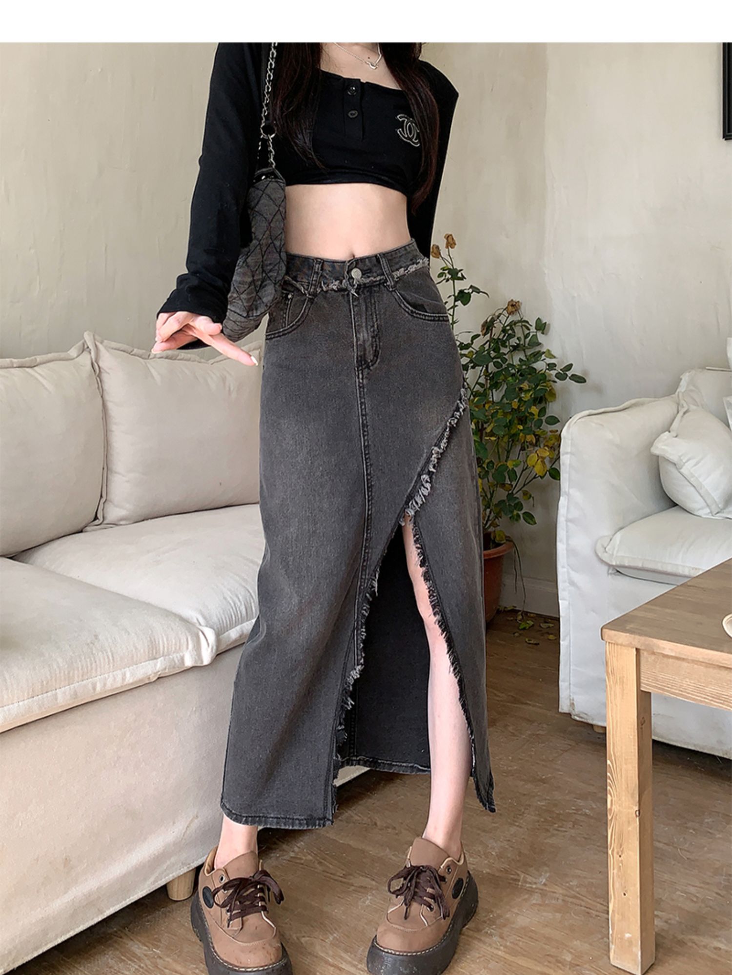 블랙 하이 웨이스트 스플릿 데님 스커트 여성의 봄과 여름 플러스 사이즈 통통녀 중간 길이 슬림 A 라인 엉덩이 롱 스커트스토어 가기
