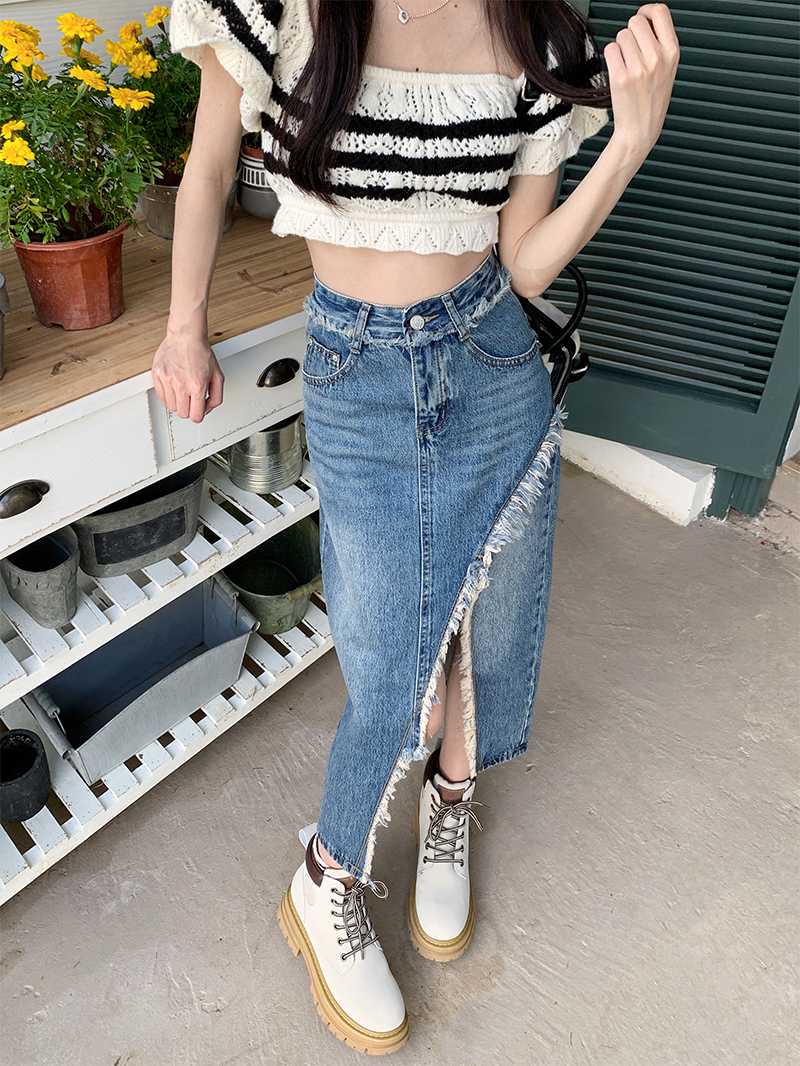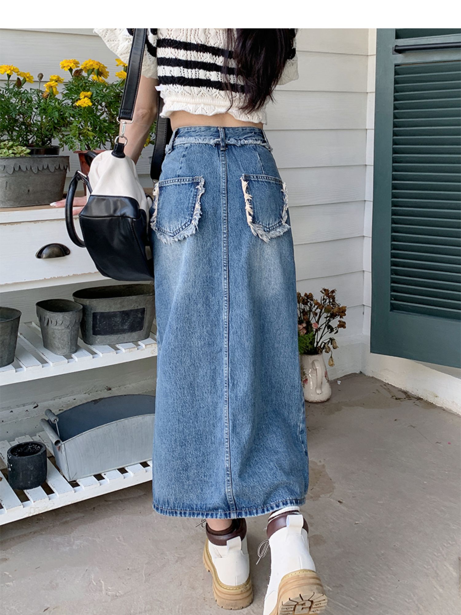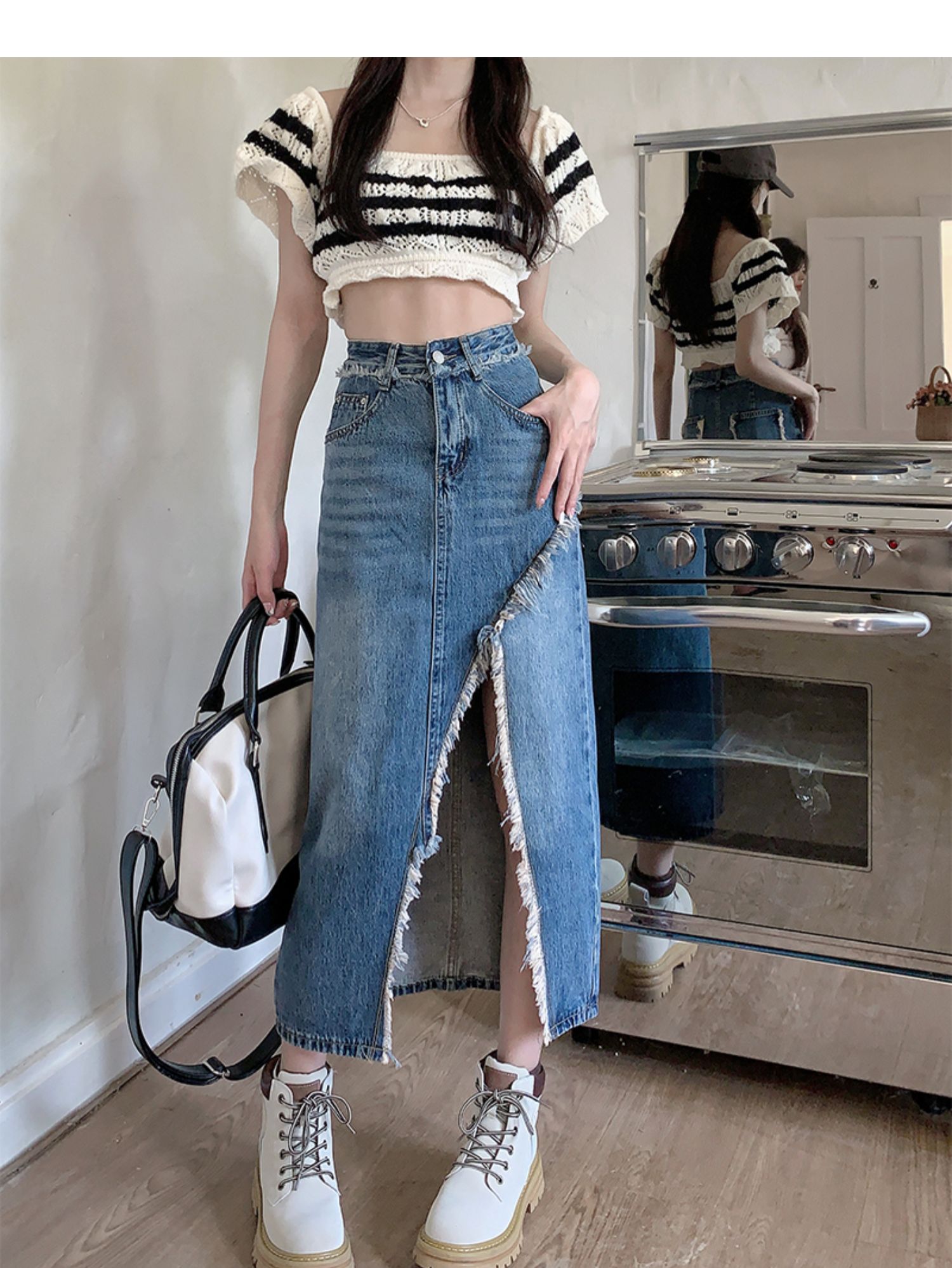 블랙 하이 웨이스트 스플릿 데님 스커트 여성의 봄과 여름 플러스 사이즈 통통녀 중간 길이 슬림 A 라인 엉덩이 롱 스커트스토어 가기