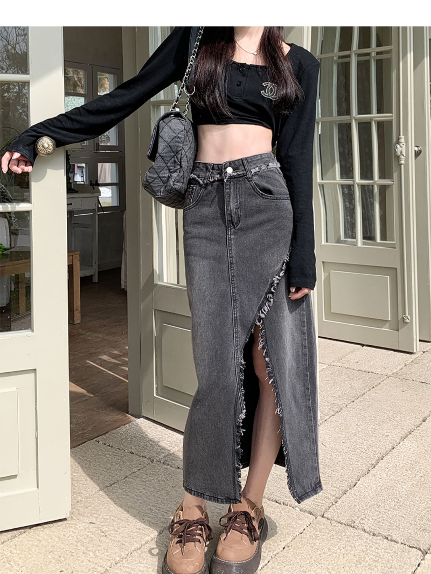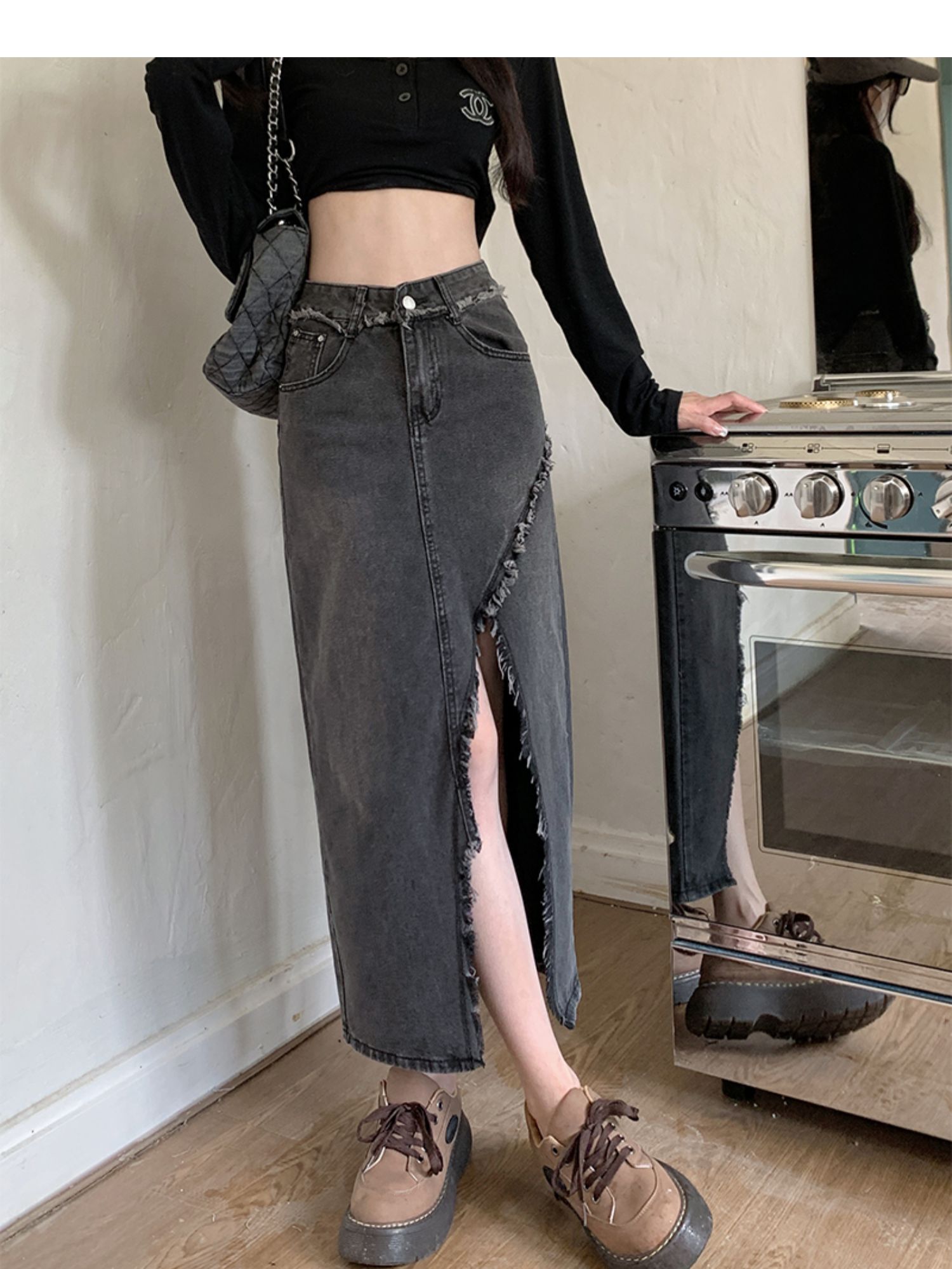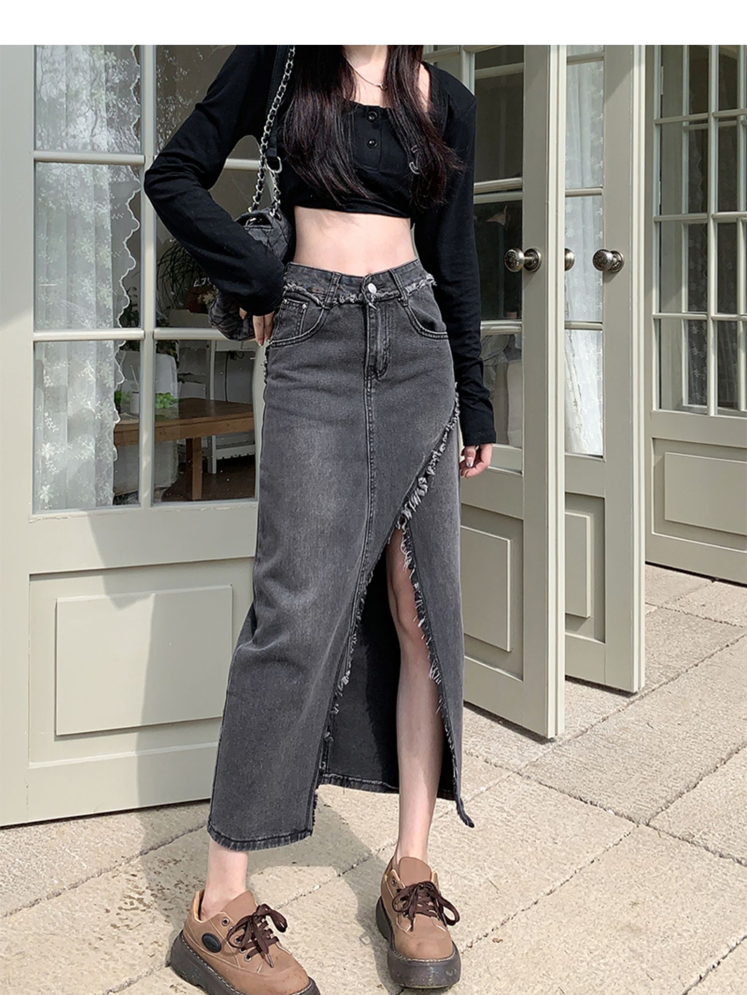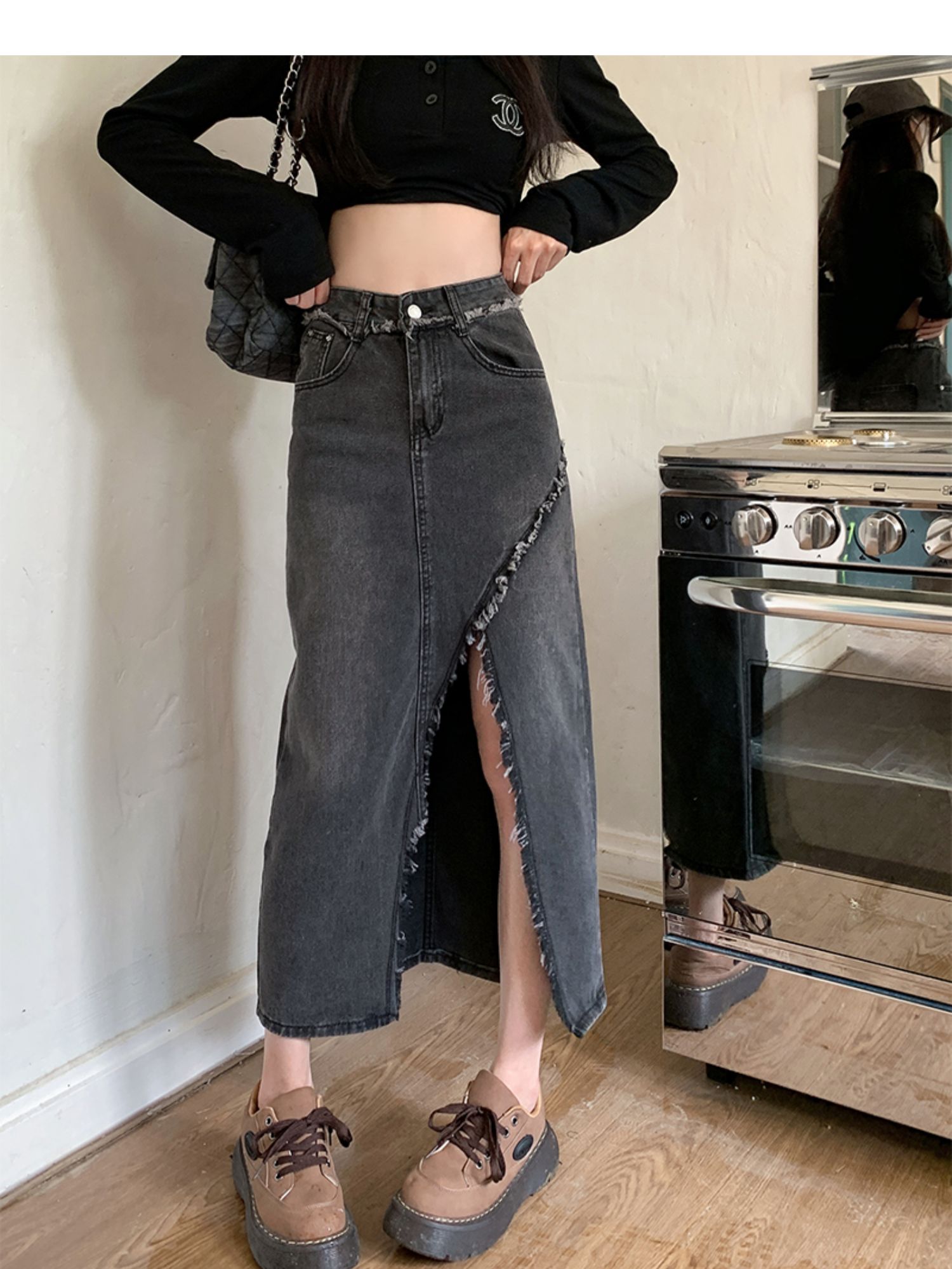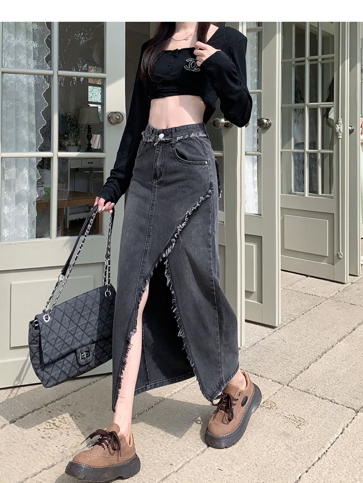 블랙 하이 웨이스트 스플릿 데님 스커트 여성의 봄과 여름 플러스 사이즈 통통녀 중간 길이 슬림 A 라인 엉덩이 롱 스커트