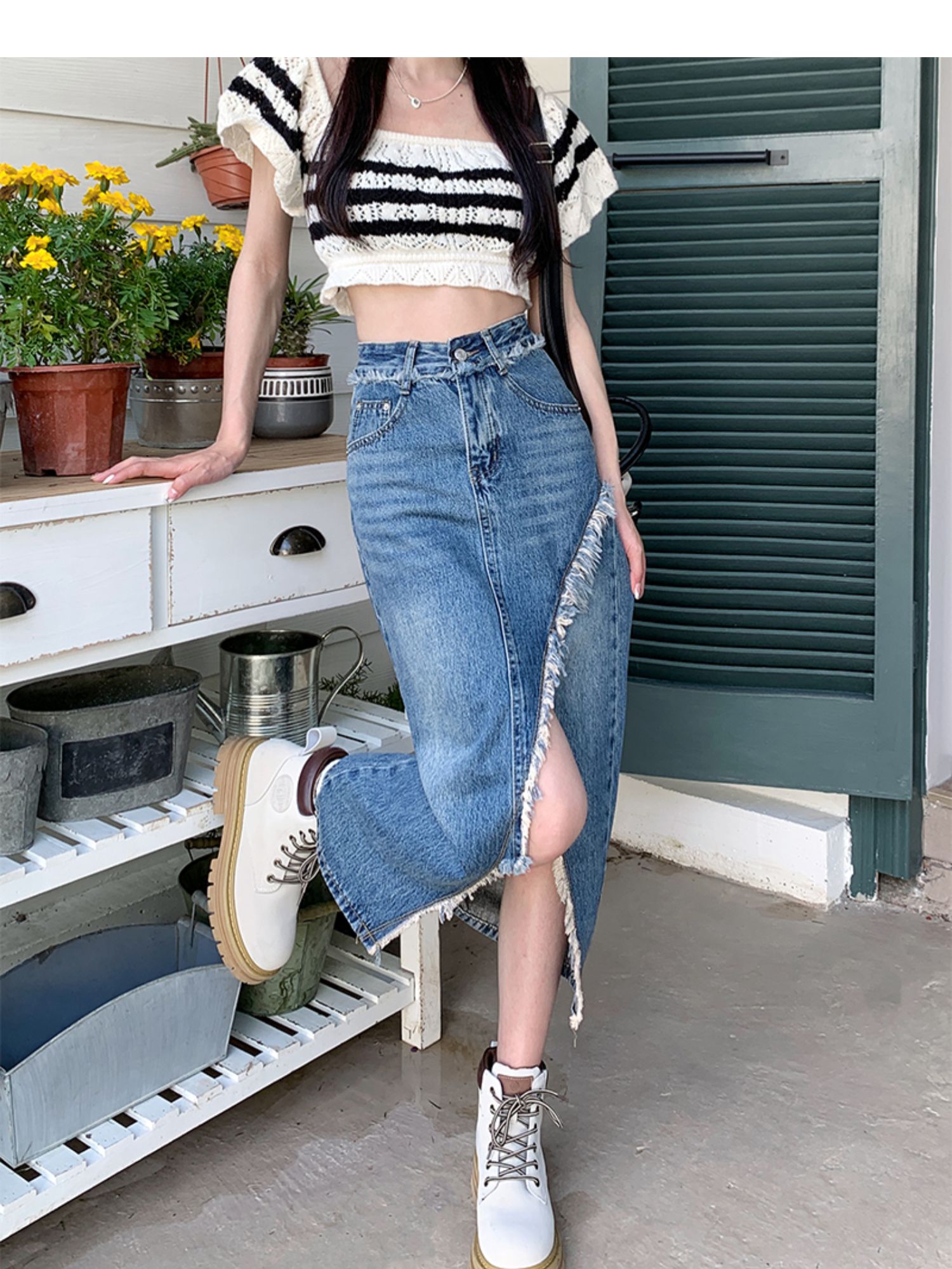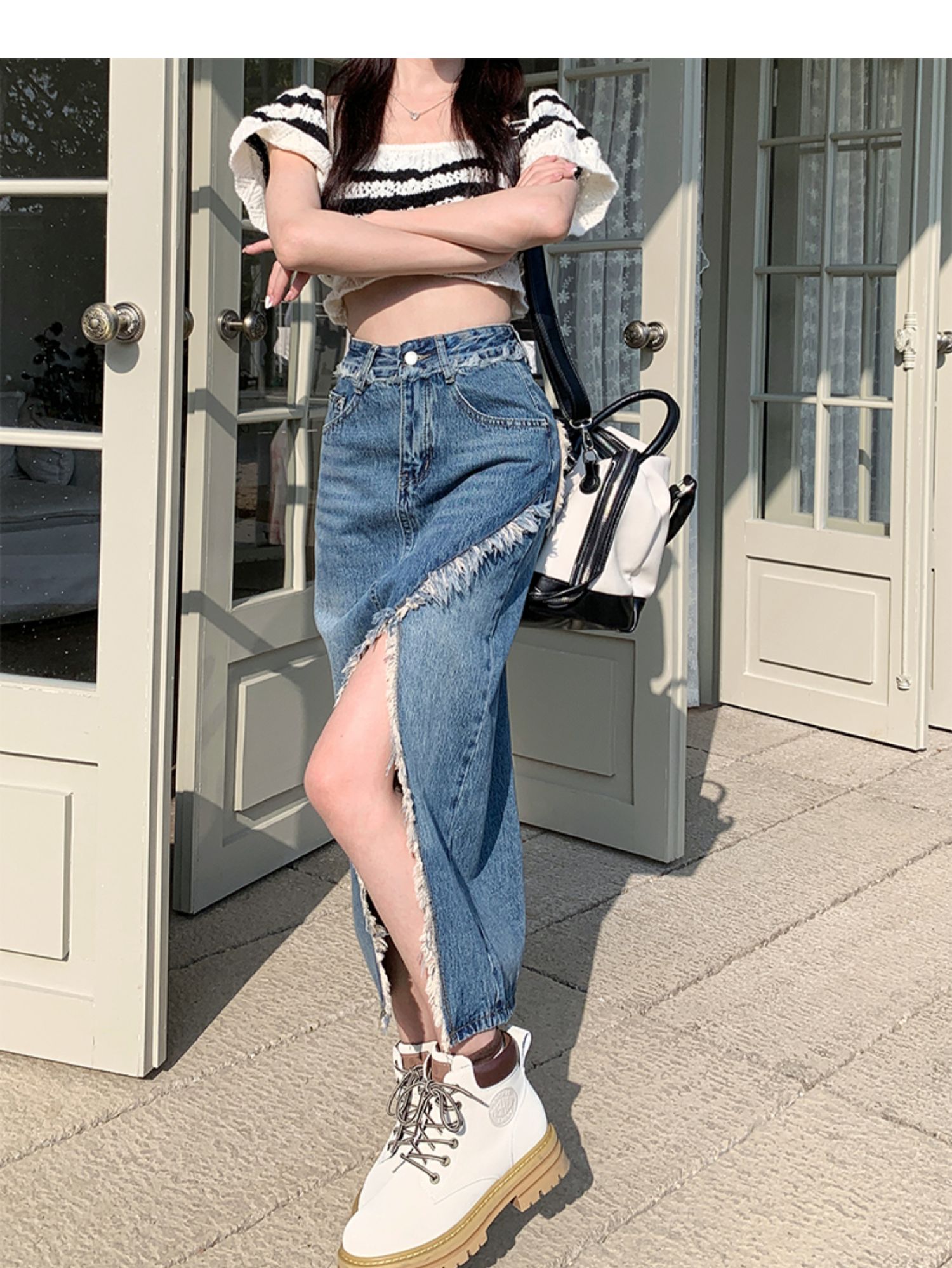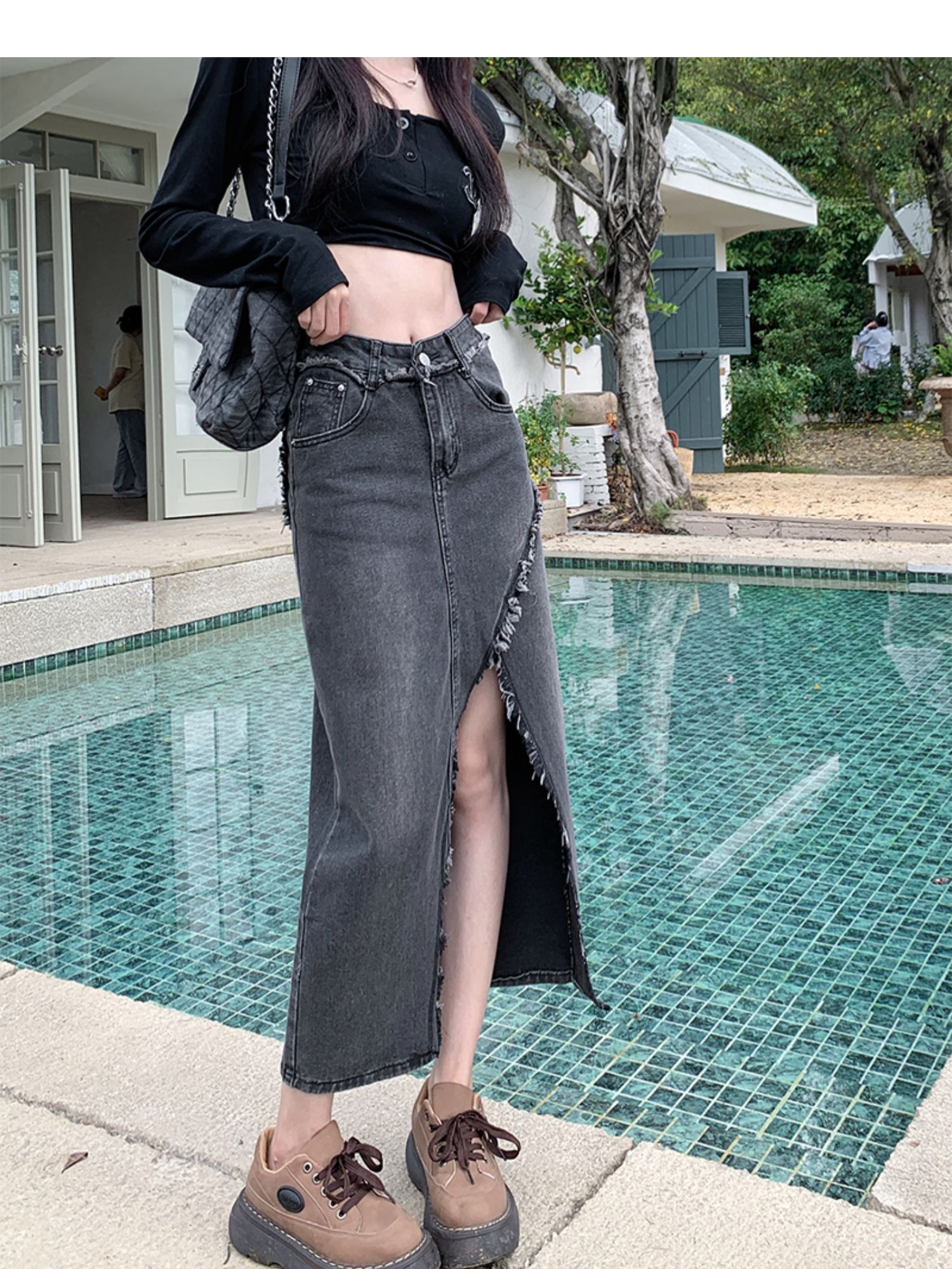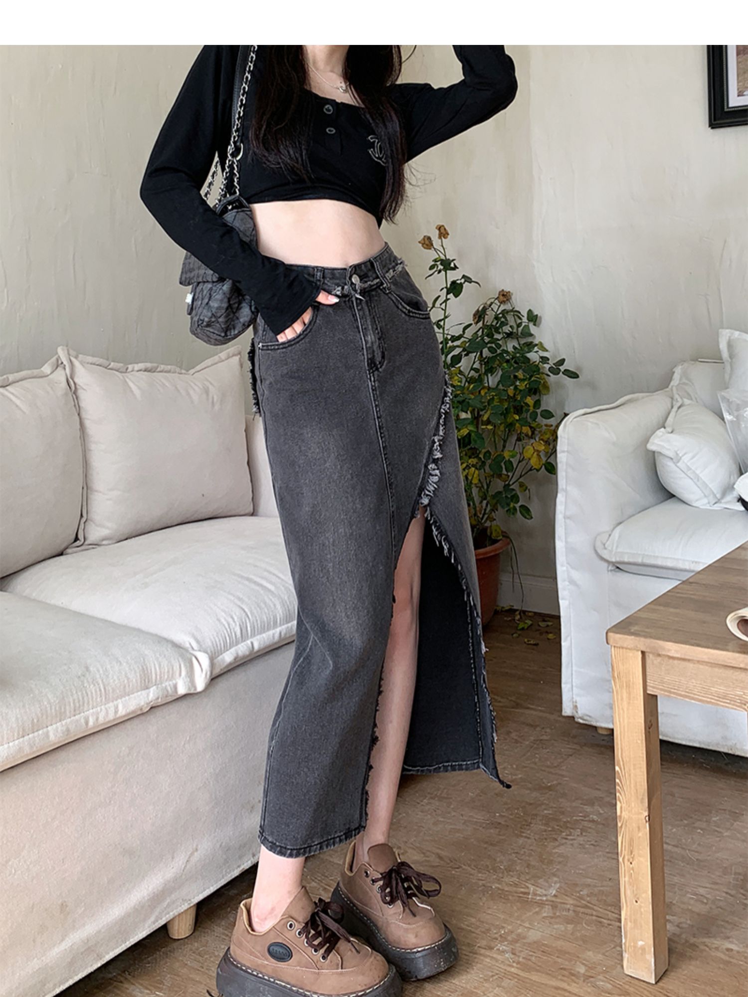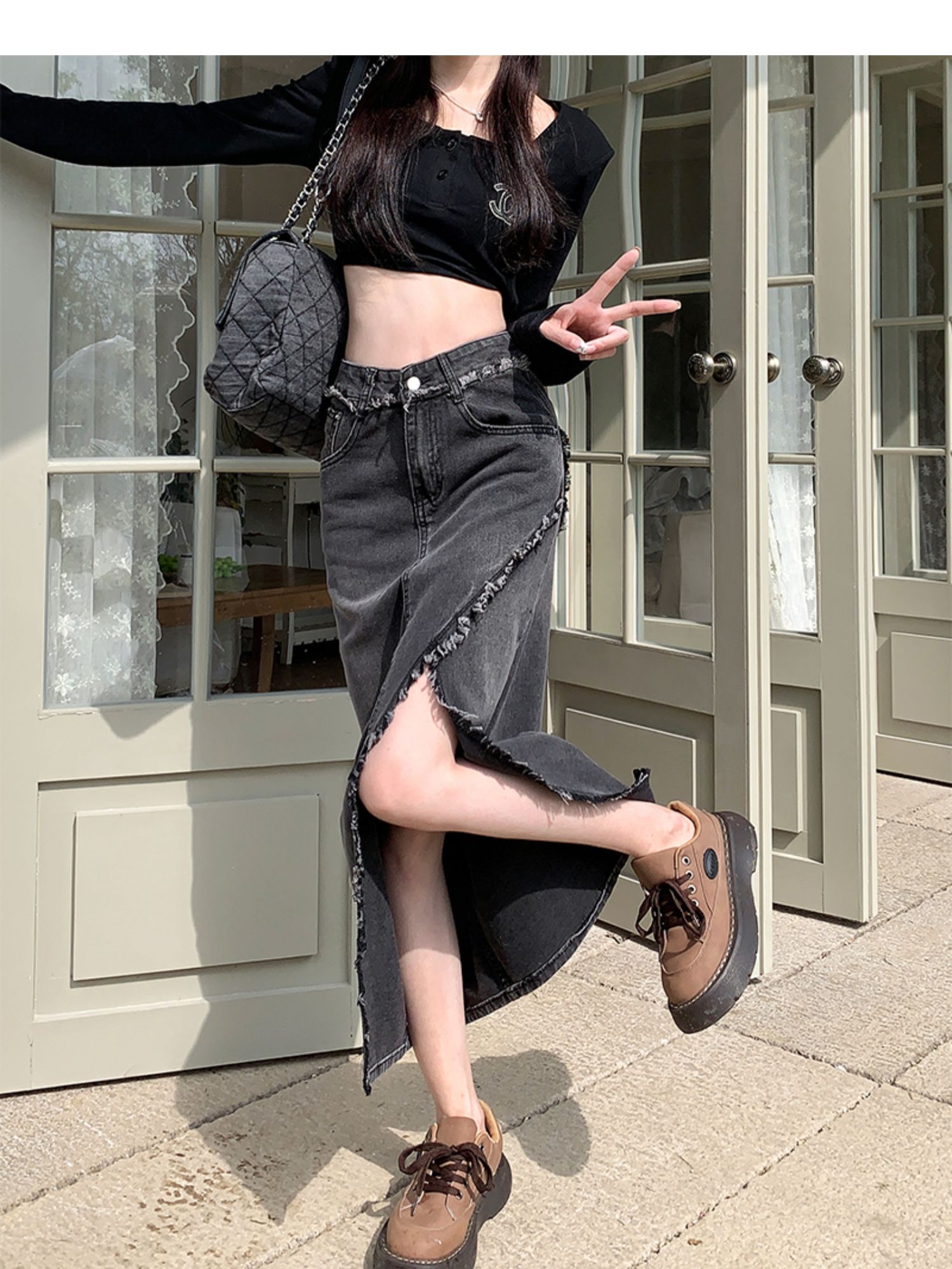 블랙 하이 웨이스트 스플릿 데님 스커트 여성의 봄과 여름 플러스 사이즈 통통녀 중간 길이 슬림 A 라인 엉덩이 롱 스커트