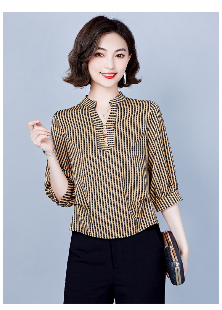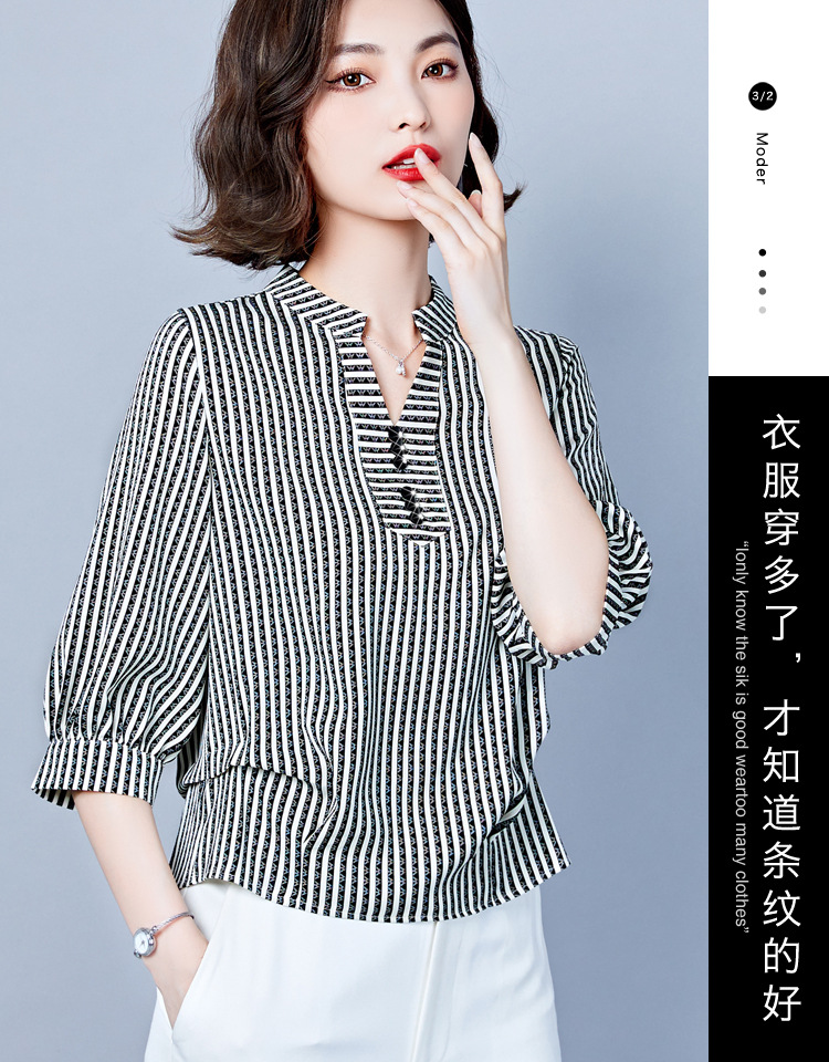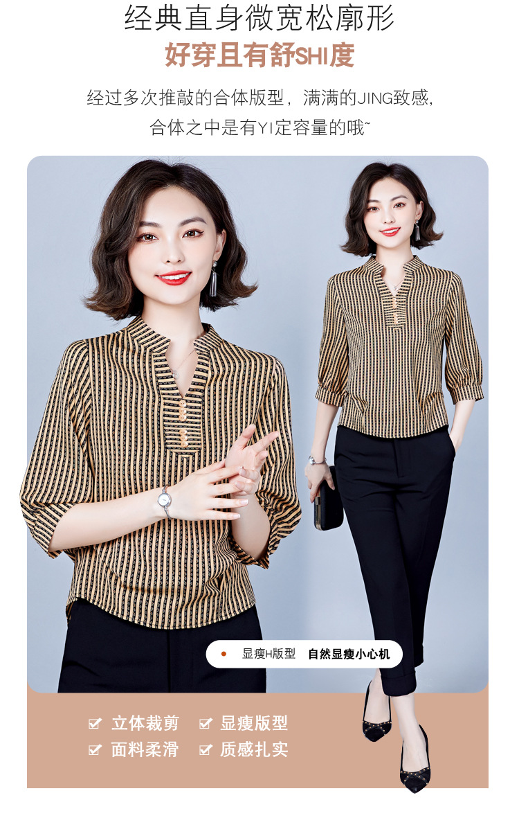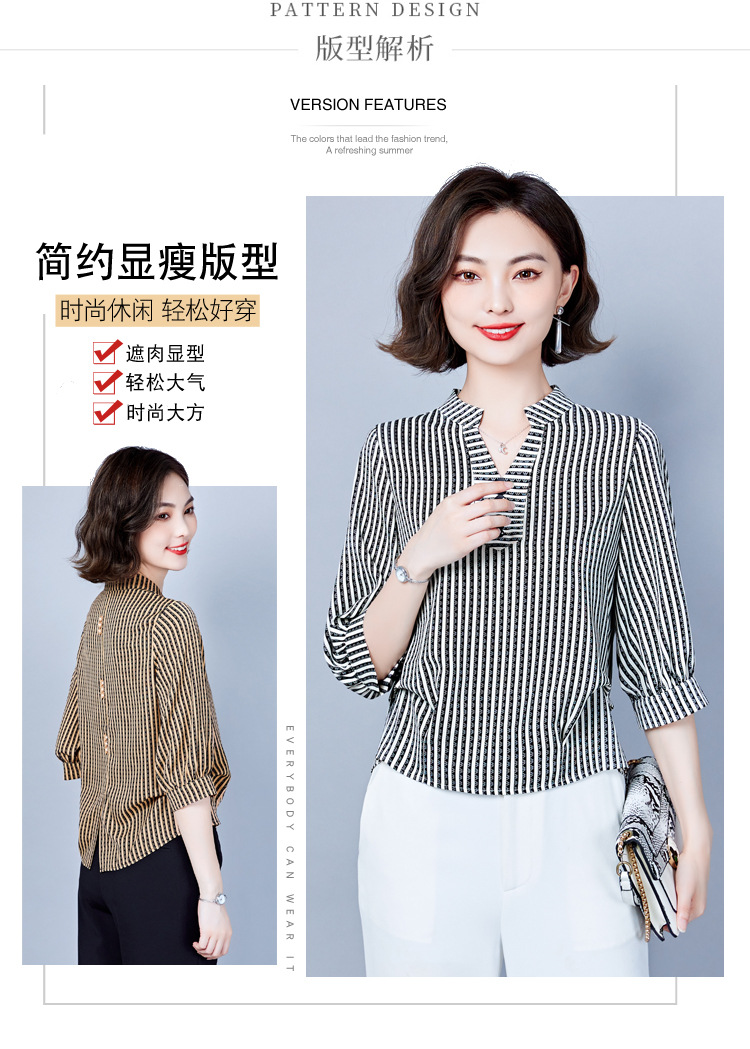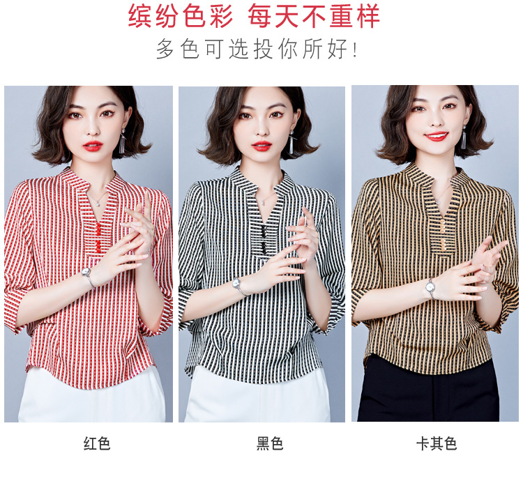 7 소매 스트라이프 셔츠 여성용 여름 연령 감소 새틴 셔츠 중년 어머니 느슨한 배꼽 덮개 쉬폰 탑 웨스턴 스타일스토어 가기