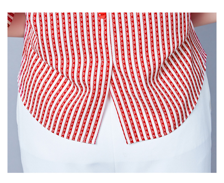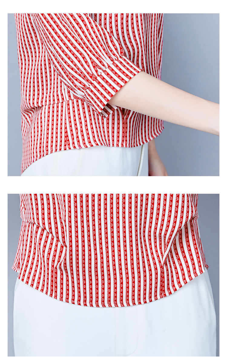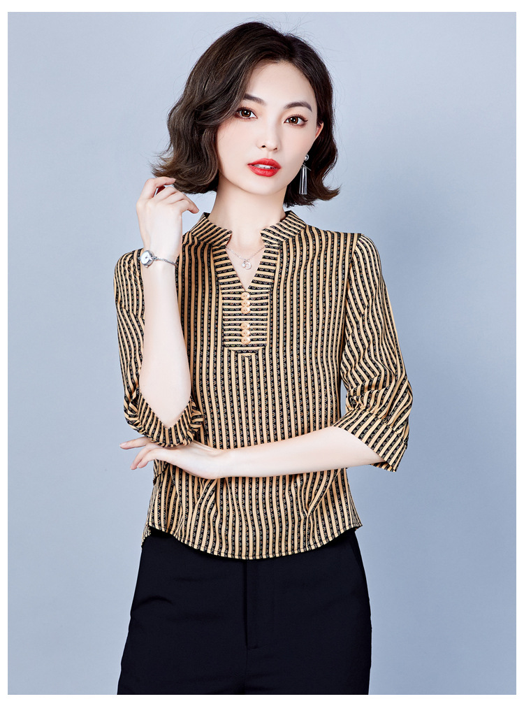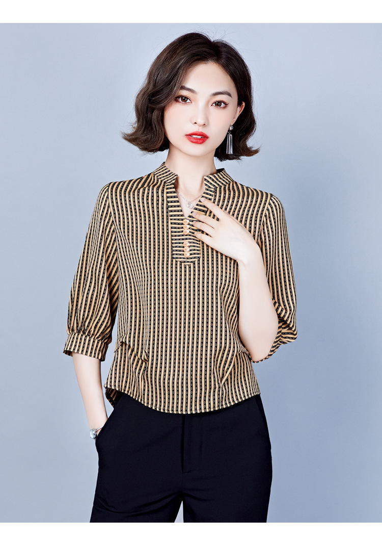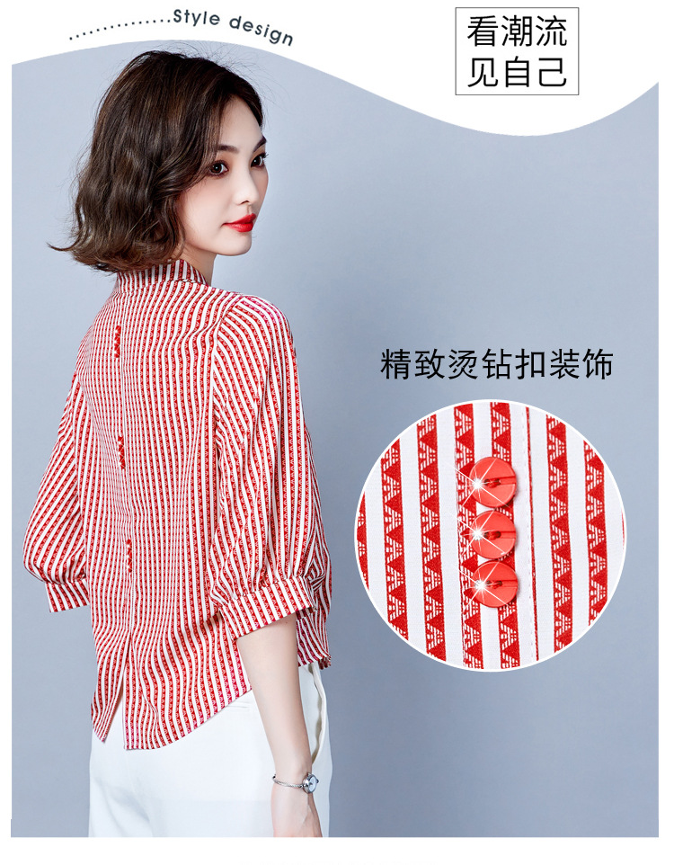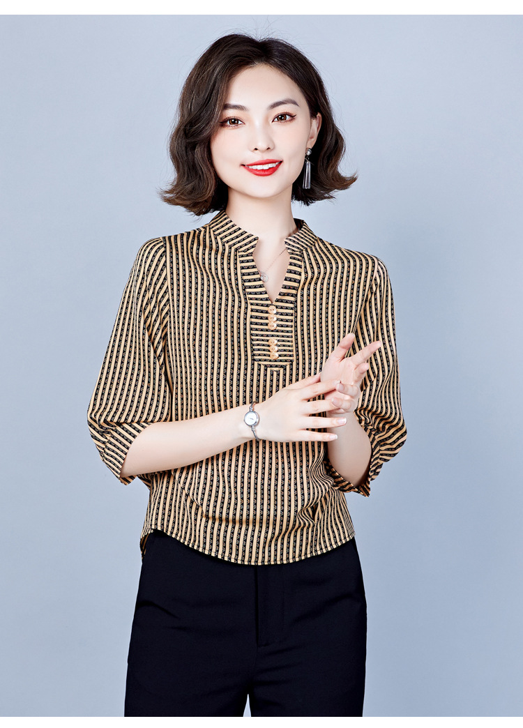 7 소매 스트라이프 셔츠 여성용 여름 연령 감소 새틴 셔츠 중년 어머니 느슨한 배꼽 덮개 쉬폰 탑 웨스턴 스타일스토어 가기