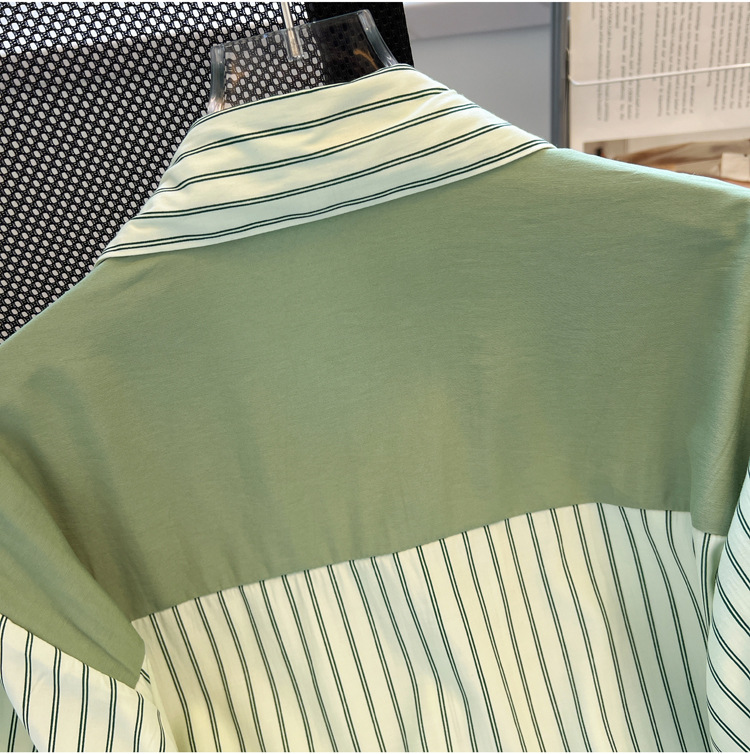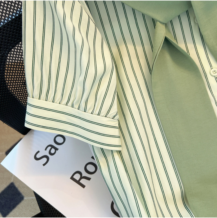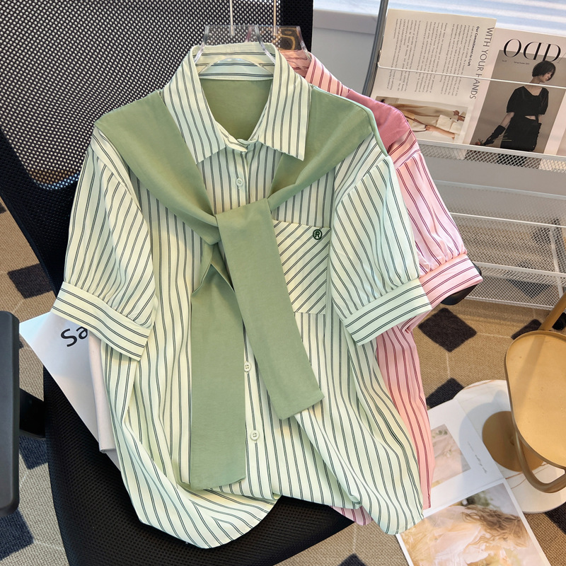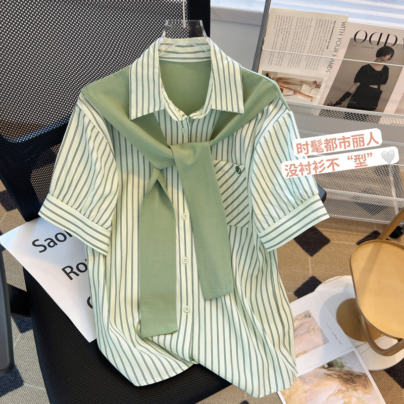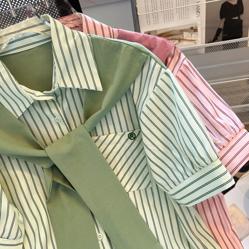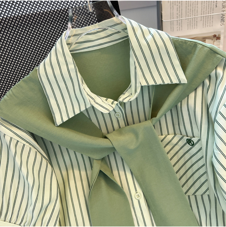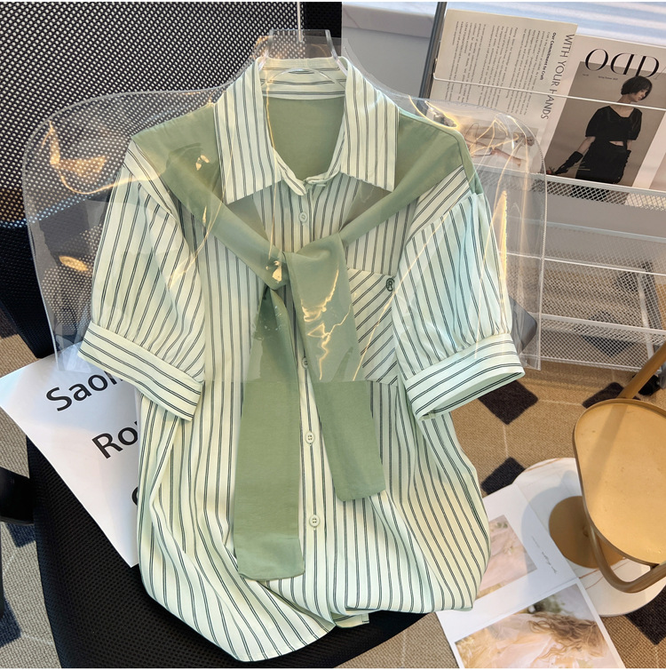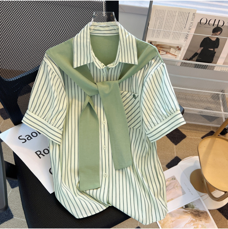 목도리와 녹색 셔츠 오버웨어 여름 쉬폰 짧은 탑 디자인 스트라이프 한국 가짜 투피스 셔츠스토어 가기