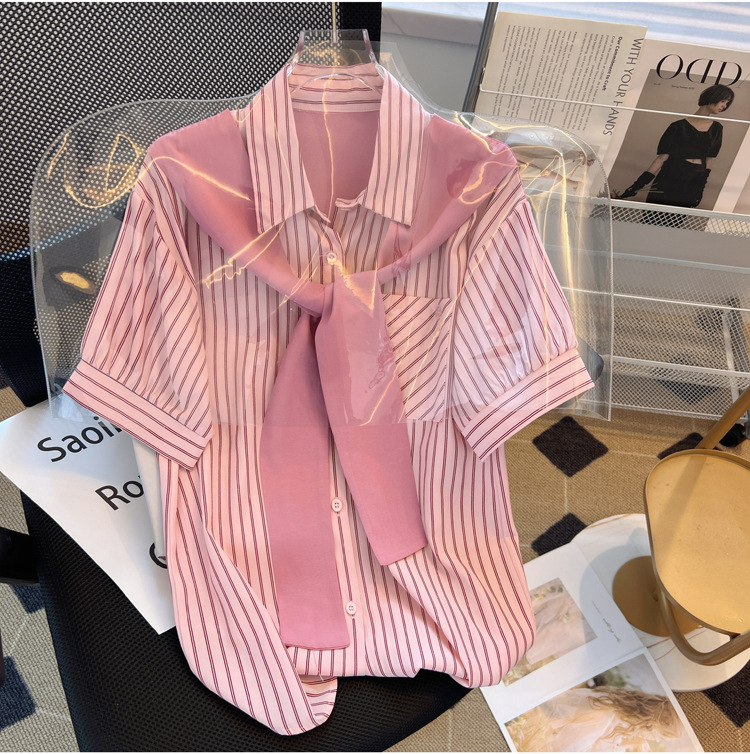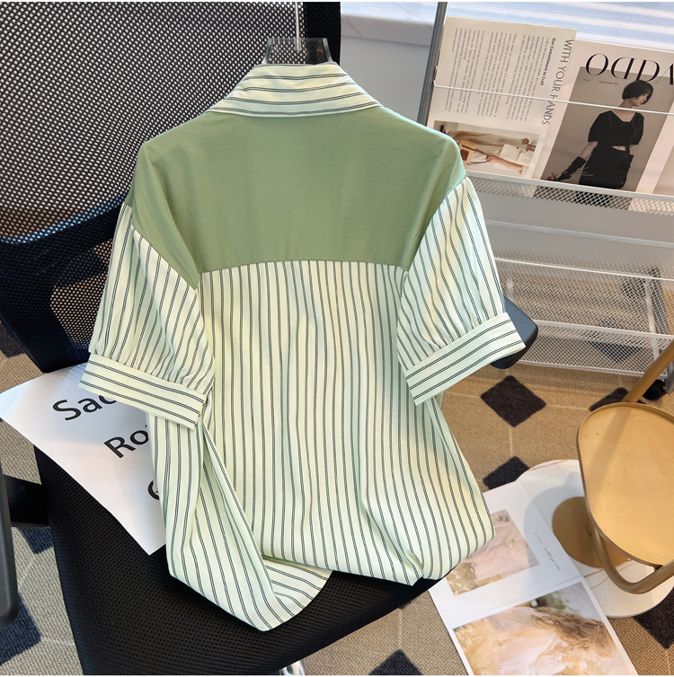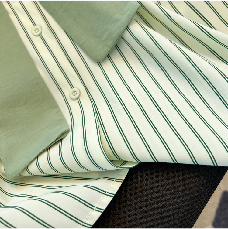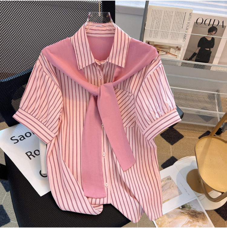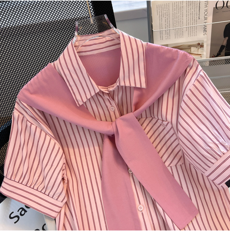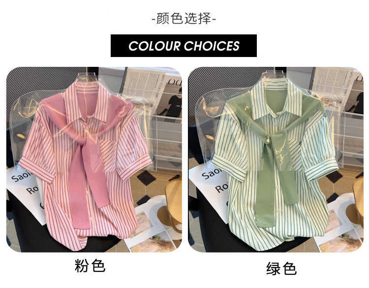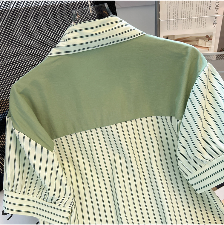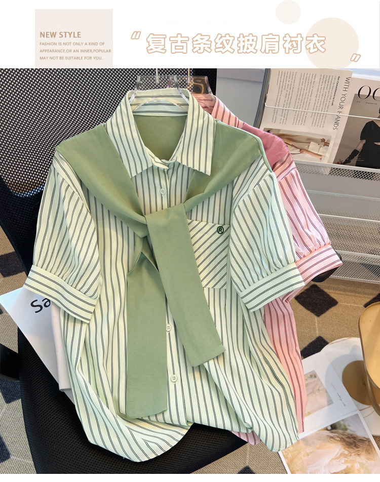 목도리와 녹색 셔츠 오버웨어 여름 쉬폰 짧은 탑 디자인 스트라이프 한국 가짜 투피스 셔츠스토어 가기