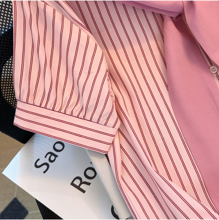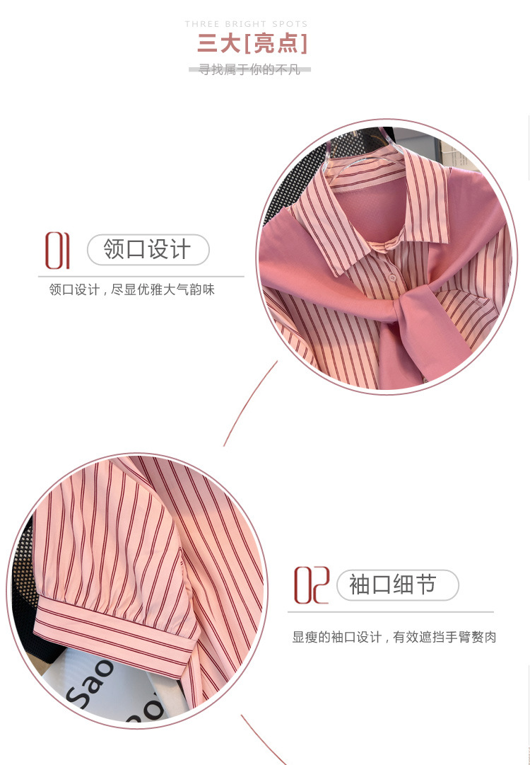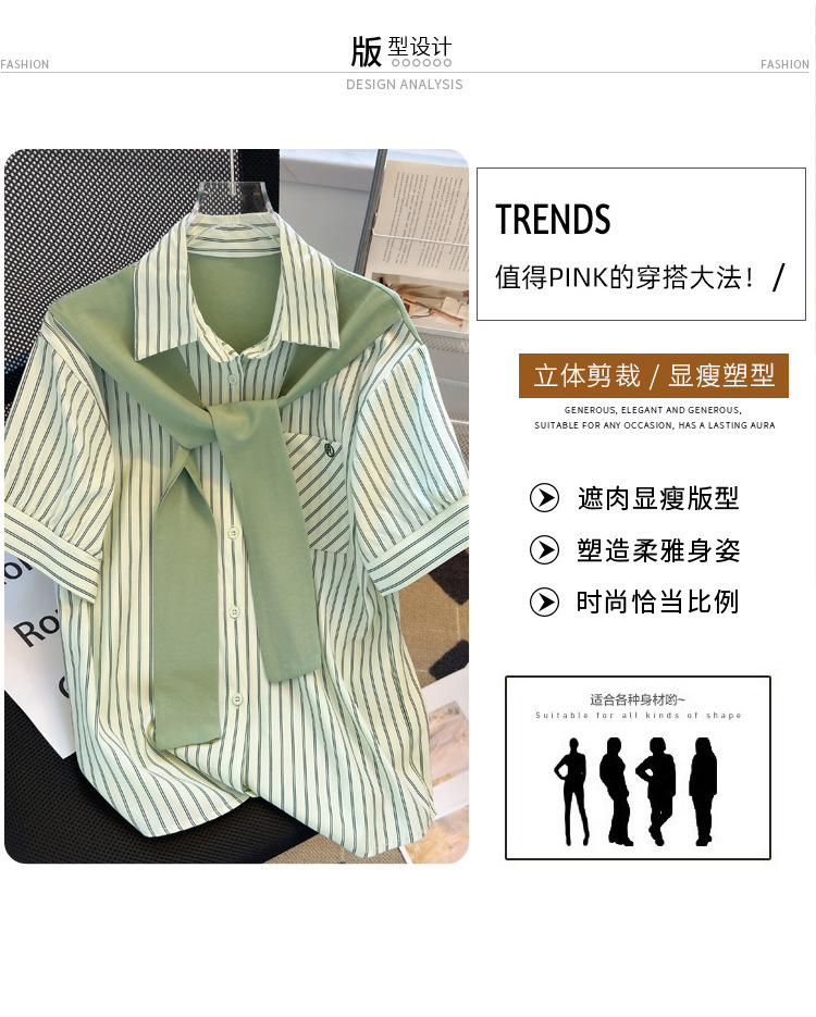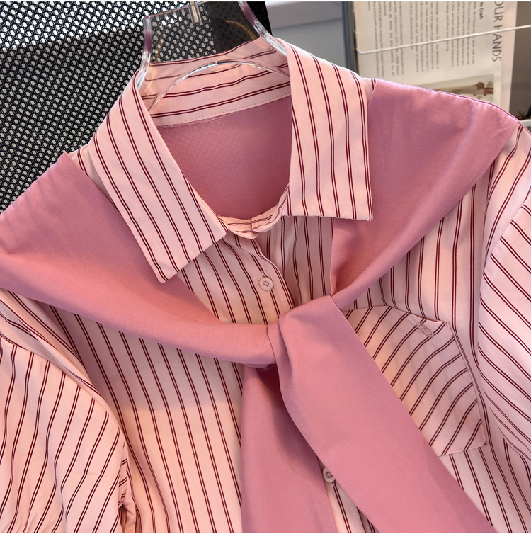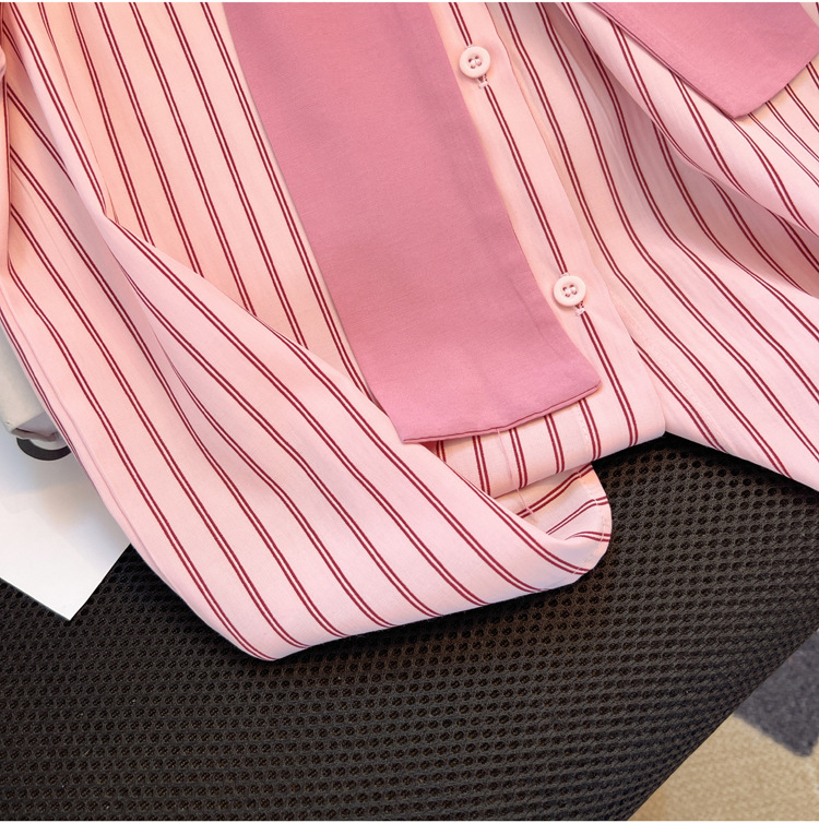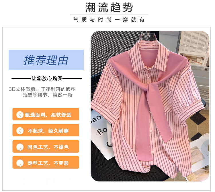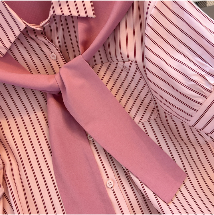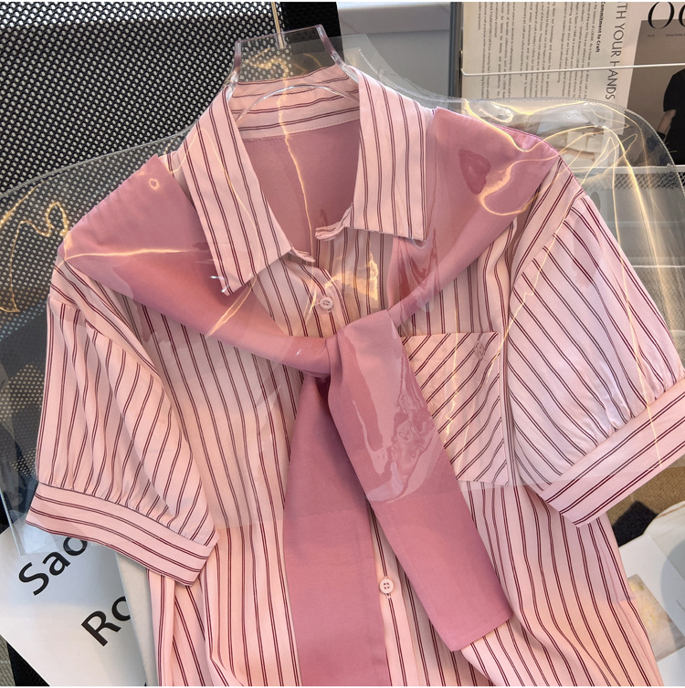 목도리와 녹색 셔츠 오버웨어 여름 쉬폰 짧은 탑 디자인 스트라이프 한국 가짜 투피스 셔츠스토어 가기