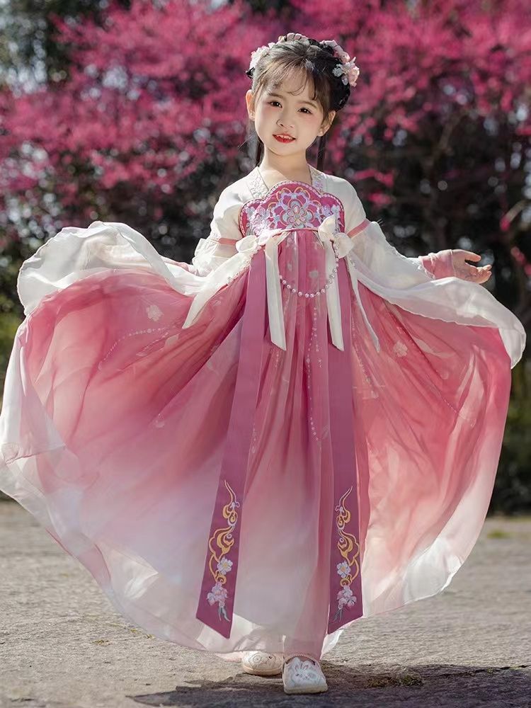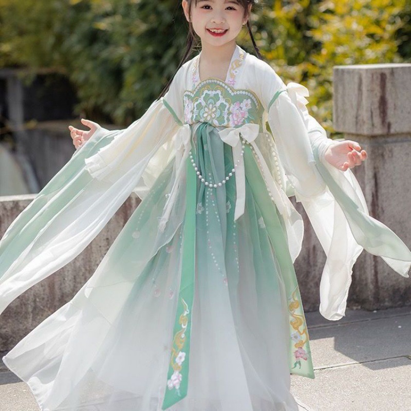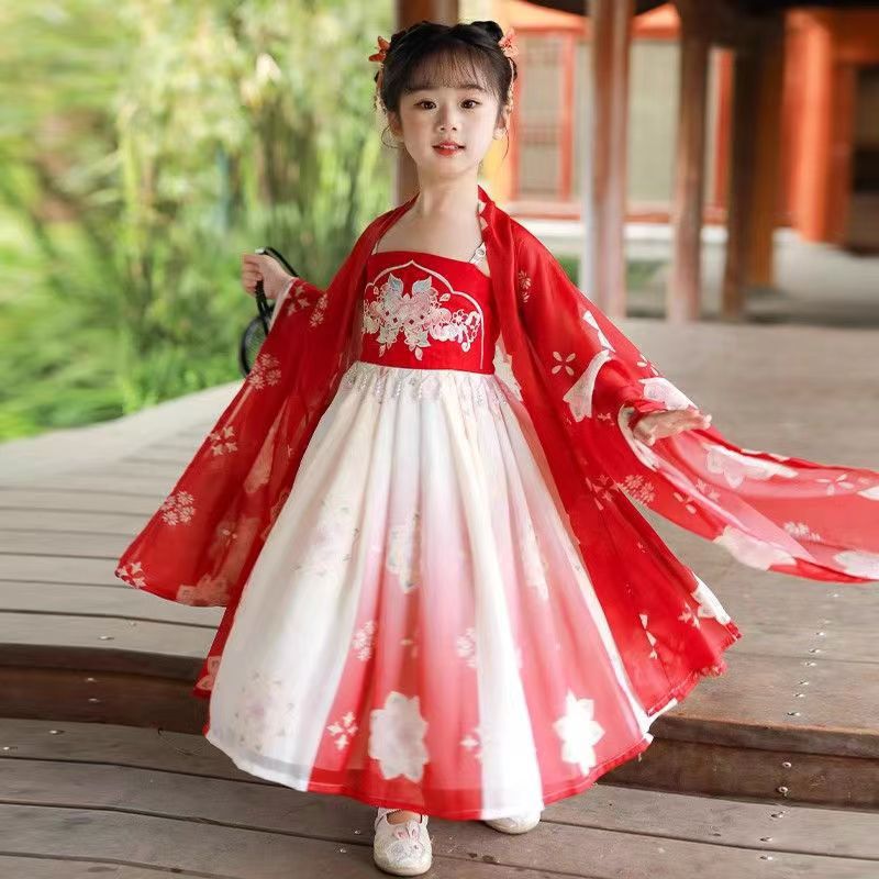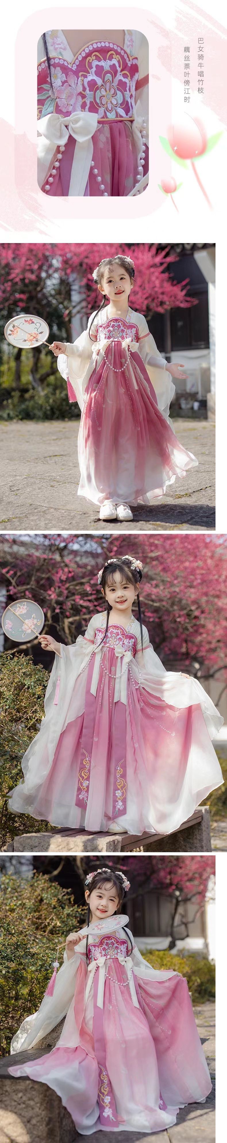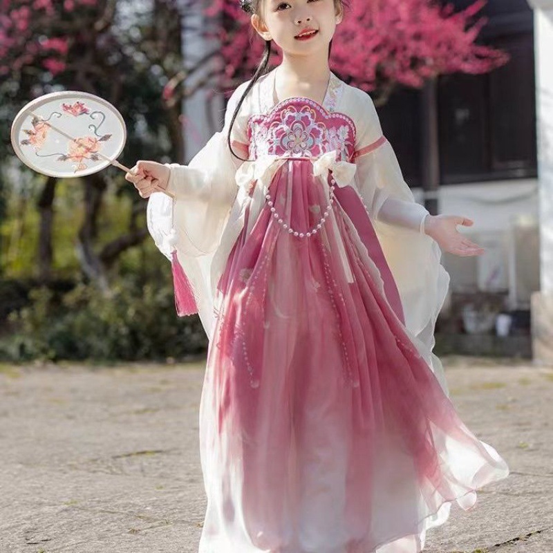 개선 Hanfu 소녀의 봄과 가을 새로운 도착 골동품 원피스 여름 소녀의 당나라 세트 어린이 슈퍼 요정 고대 원피스 여름 스타일