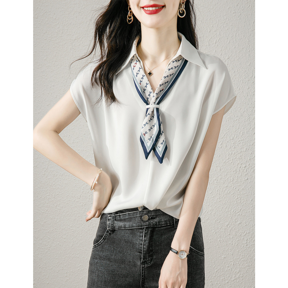 2023 여름 새로운 대비 색상 분리 가능한 나비 넥타이 프랑스 통근 셔츠 어깨 짧은 소매 V-넥 옷깃 셔츠 여성용스토어 가기