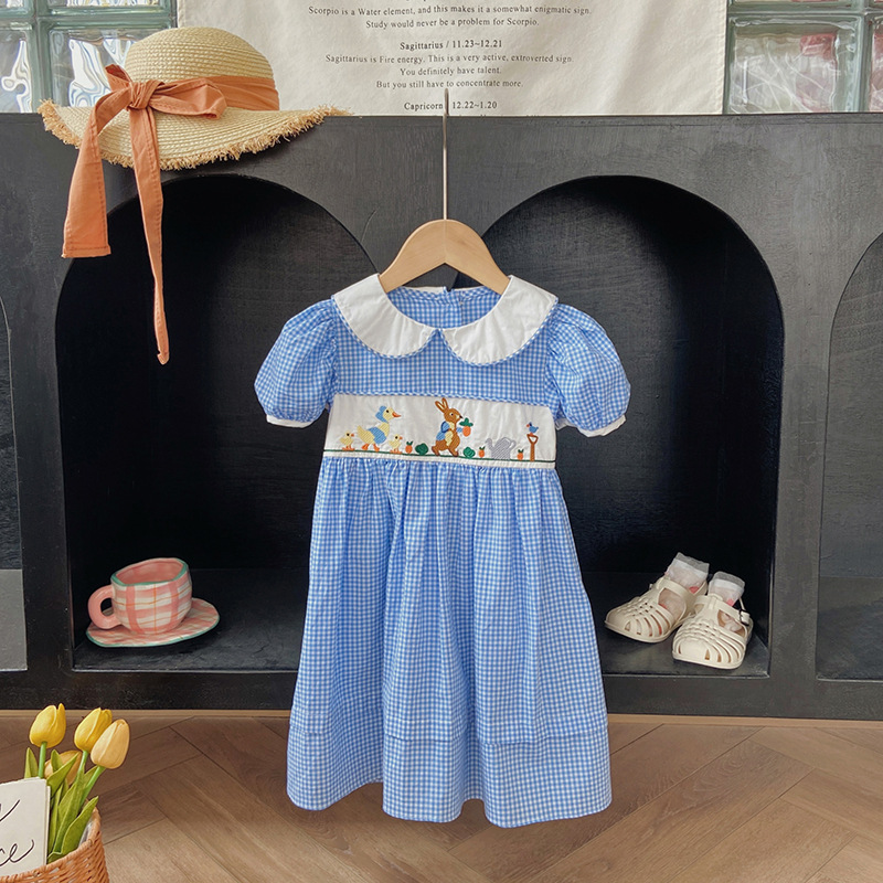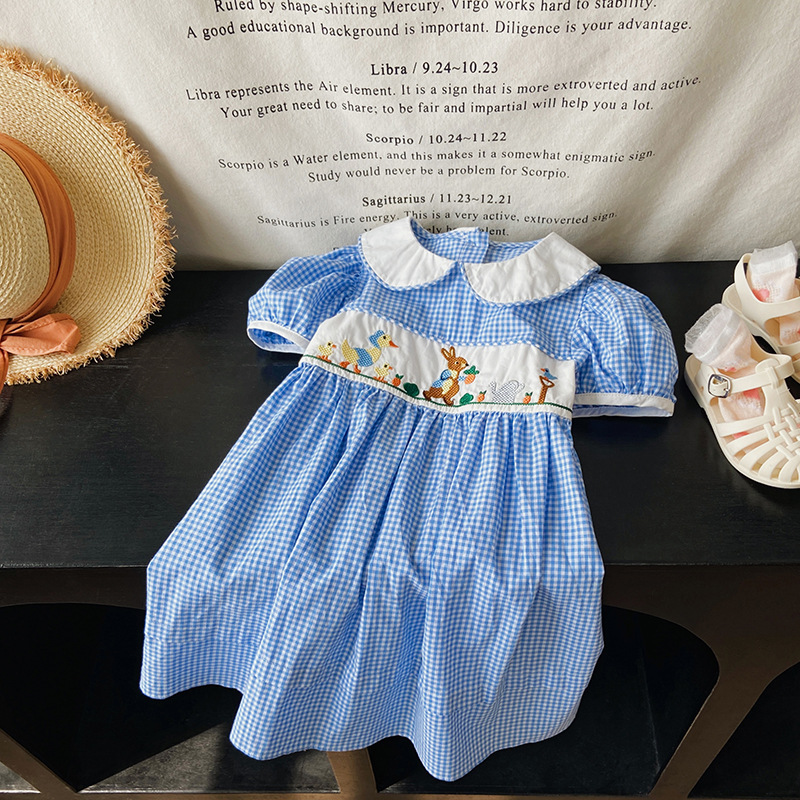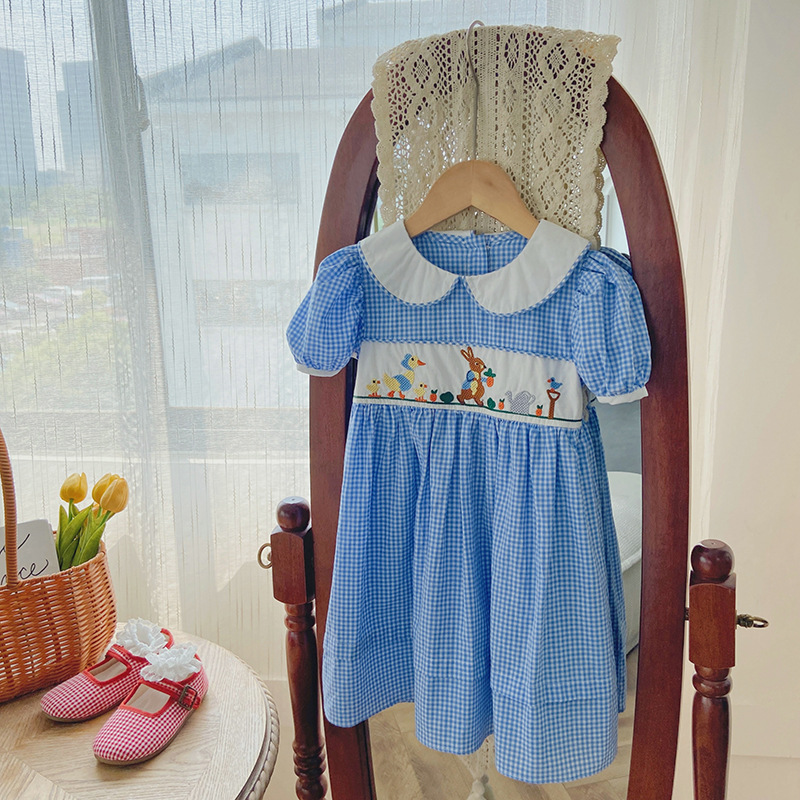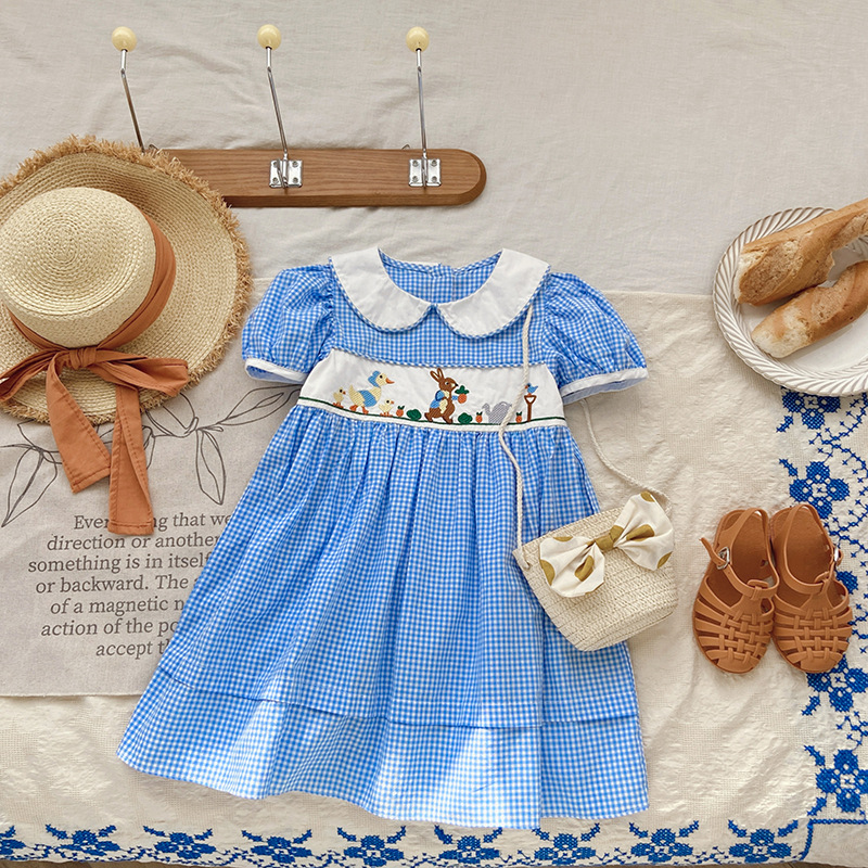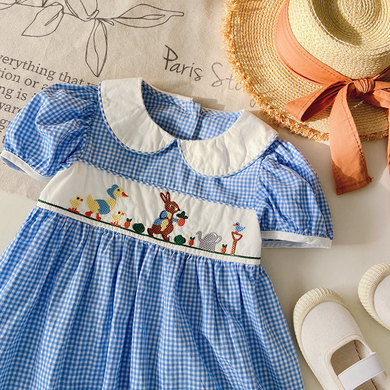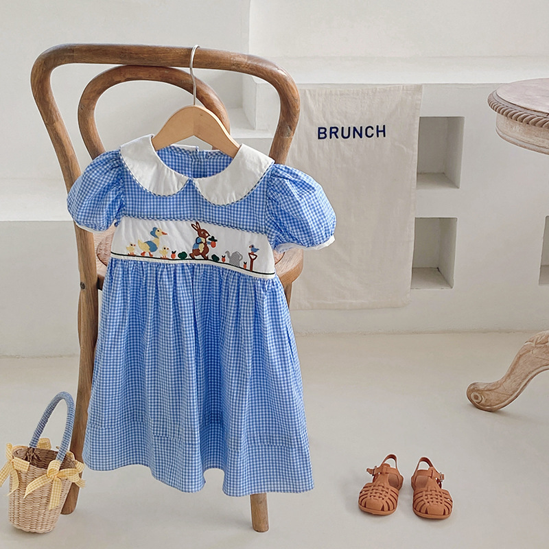 한국어 아동 의류 동물 자수 격자 무늬 소녀 드레스 여름 스타일 인형 옷깃 퍼프 슬리브 아동 스커트