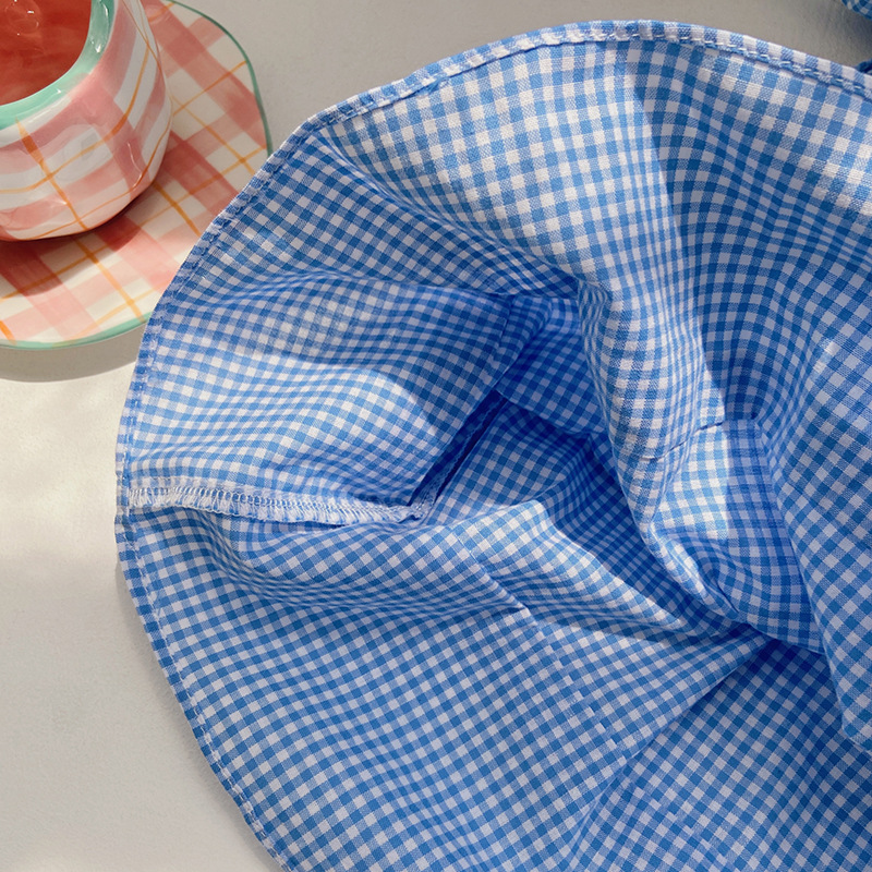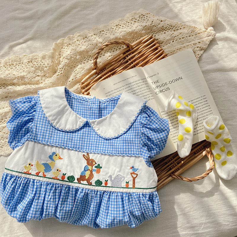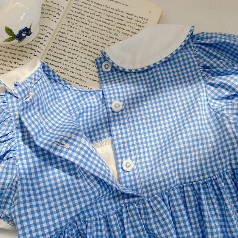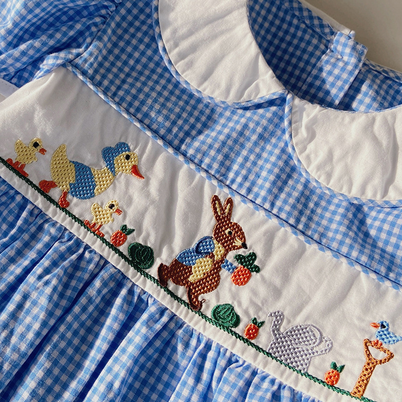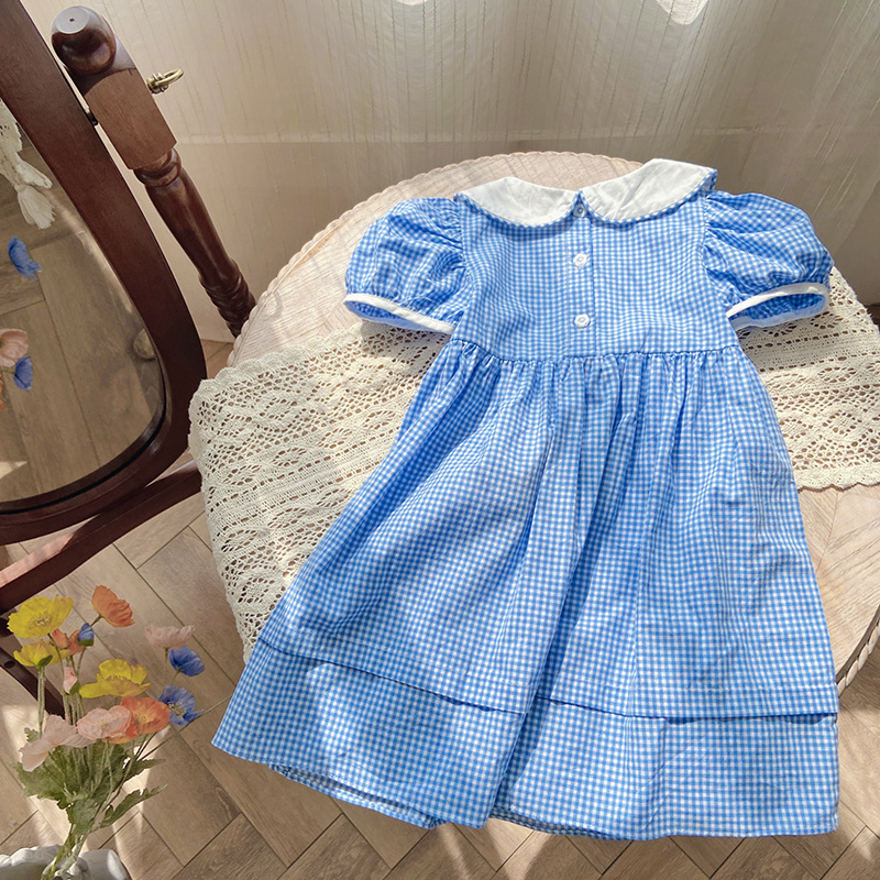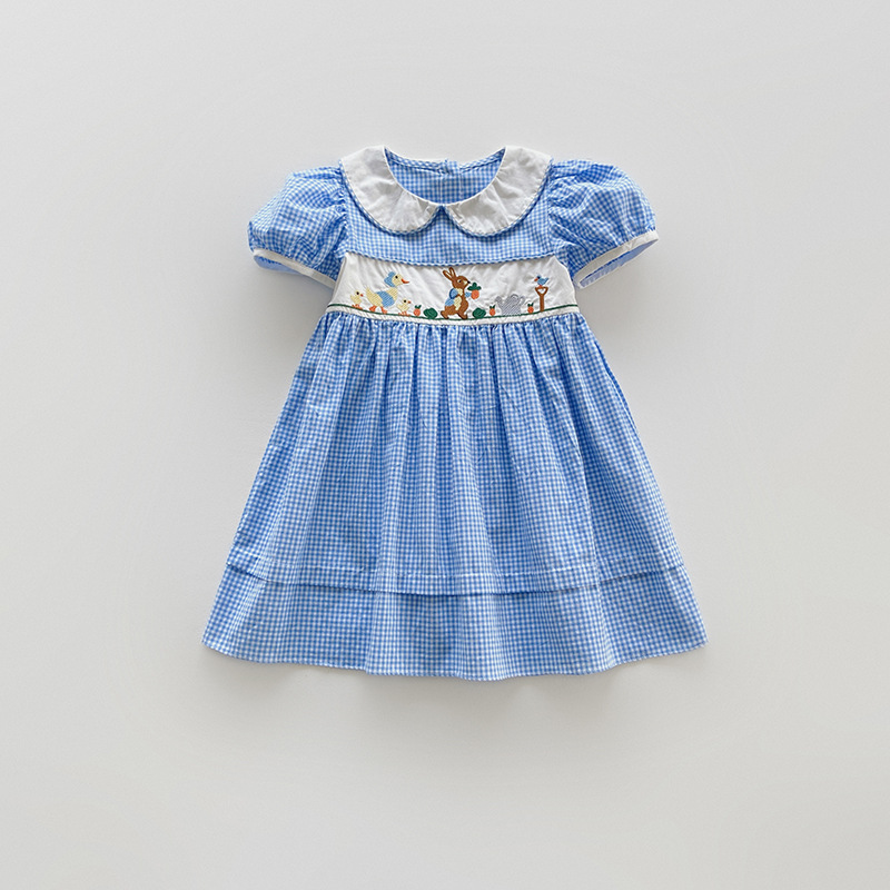 한국어 아동 의류 동물 자수 격자 무늬 소녀 드레스 여름 스타일 인형 옷깃 퍼프 슬리브 아동 스커트