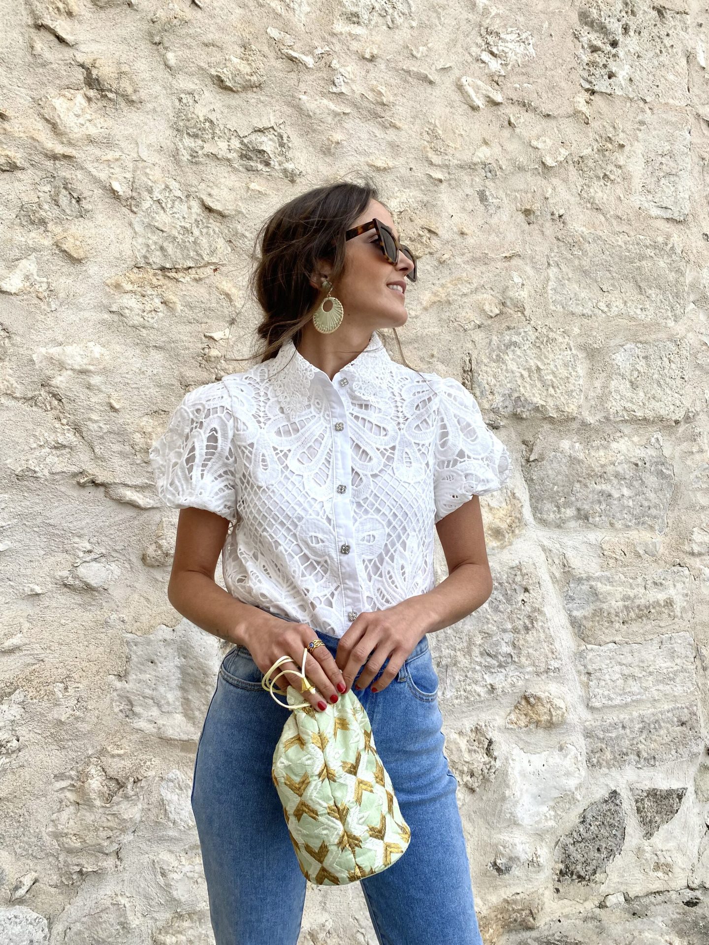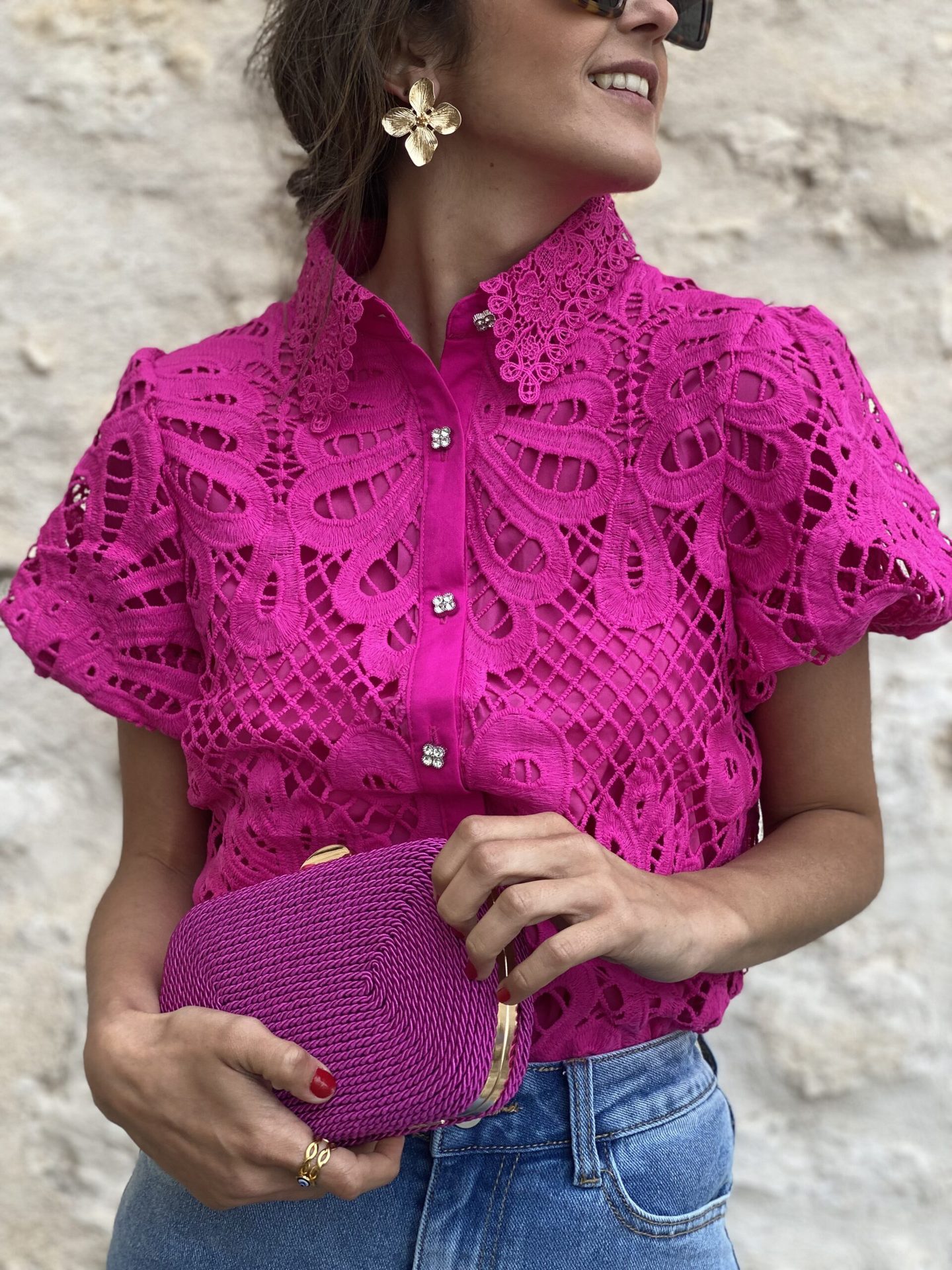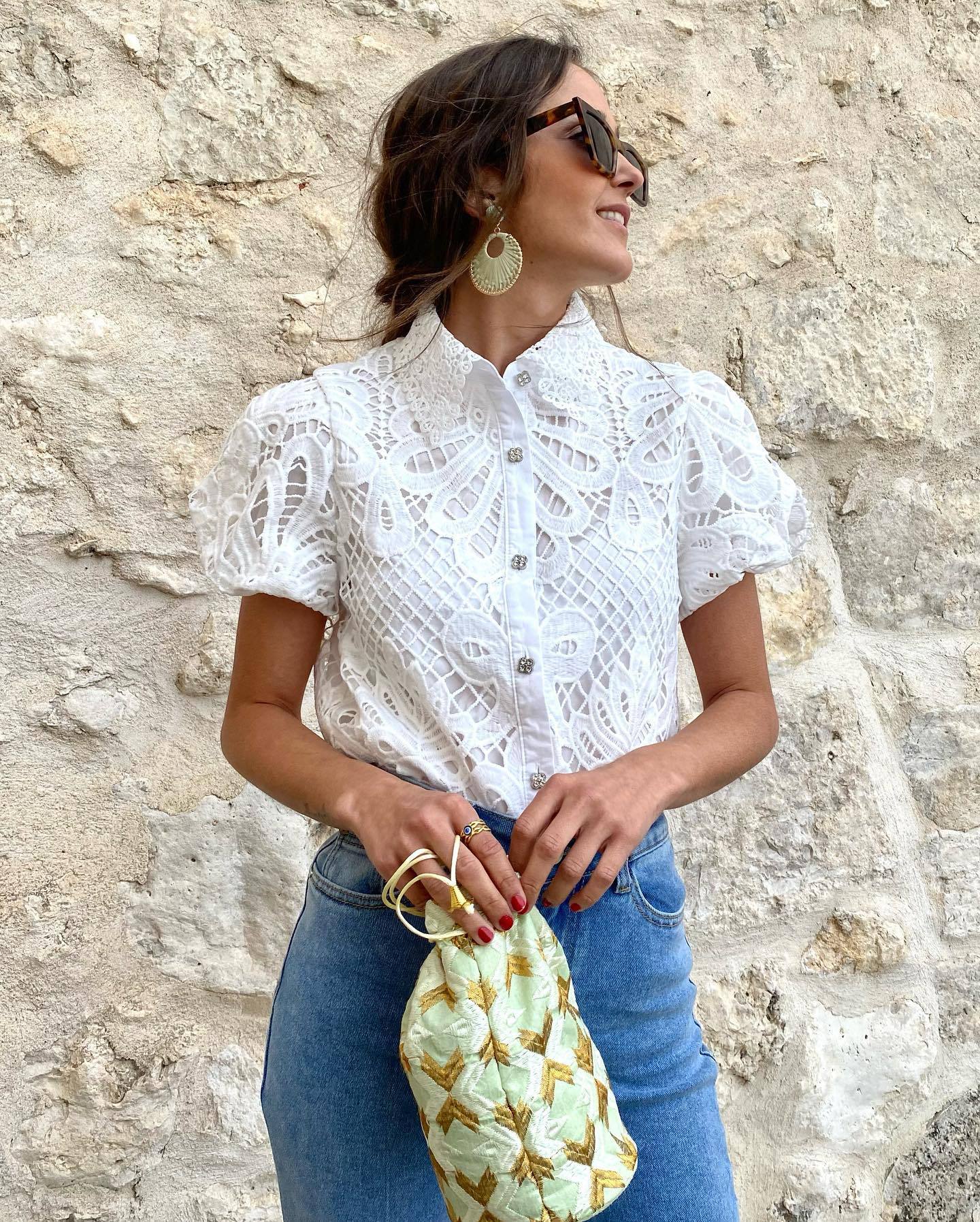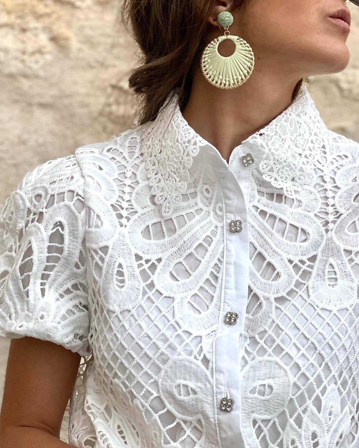 국경 간 2023 유럽 및 미국 대외 무역 독립 역 AliExpress 패션 레이스 카디건 중공 레이스 칼라 버블 슬리브 셔츠스토어 가기