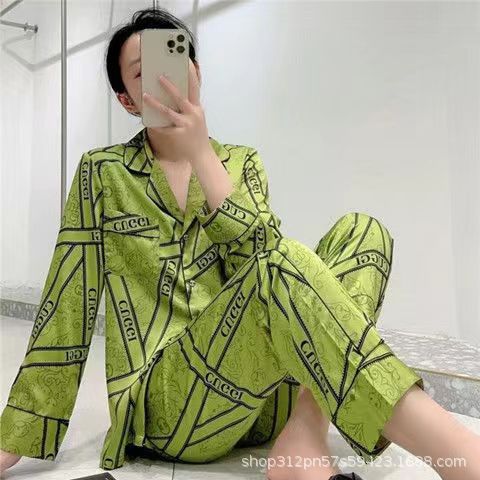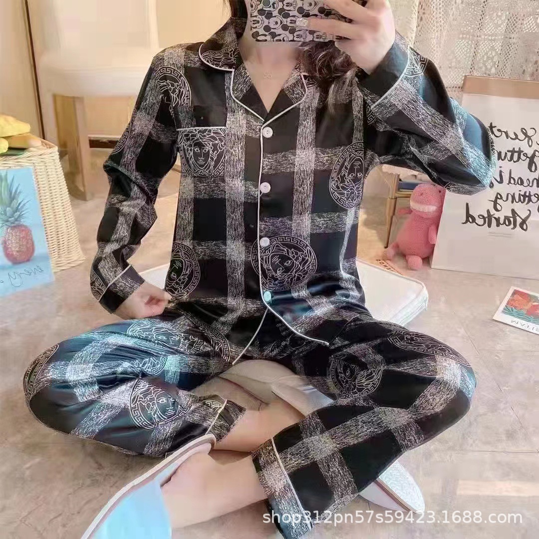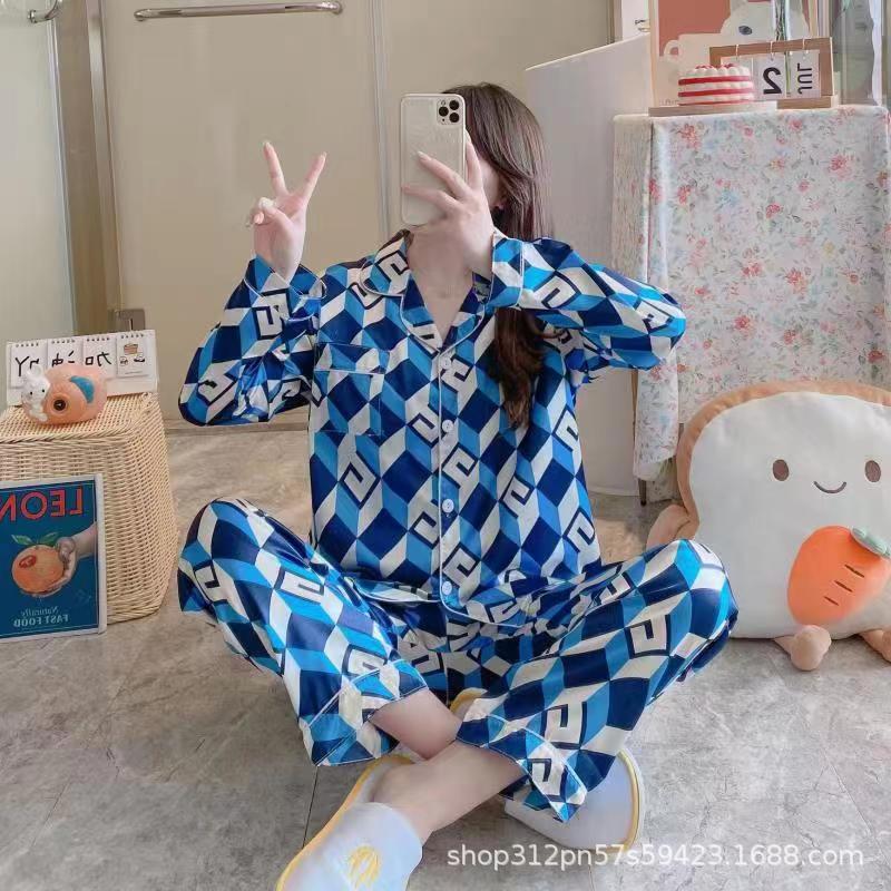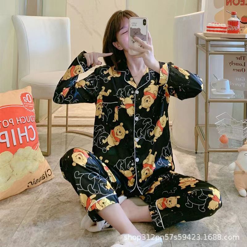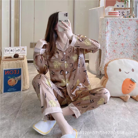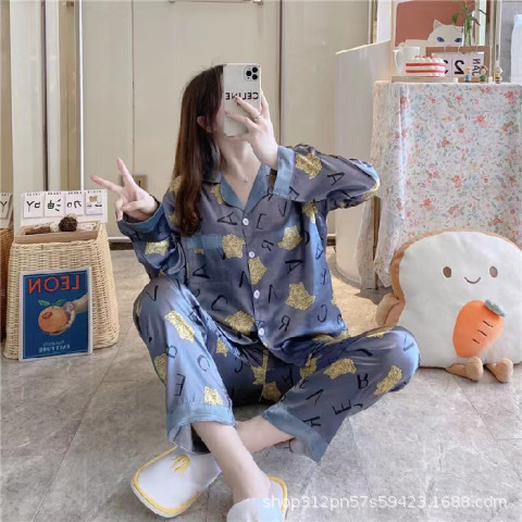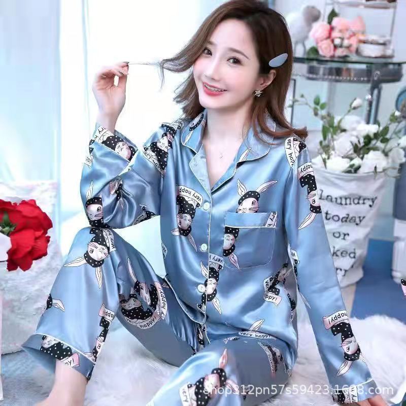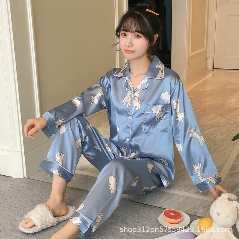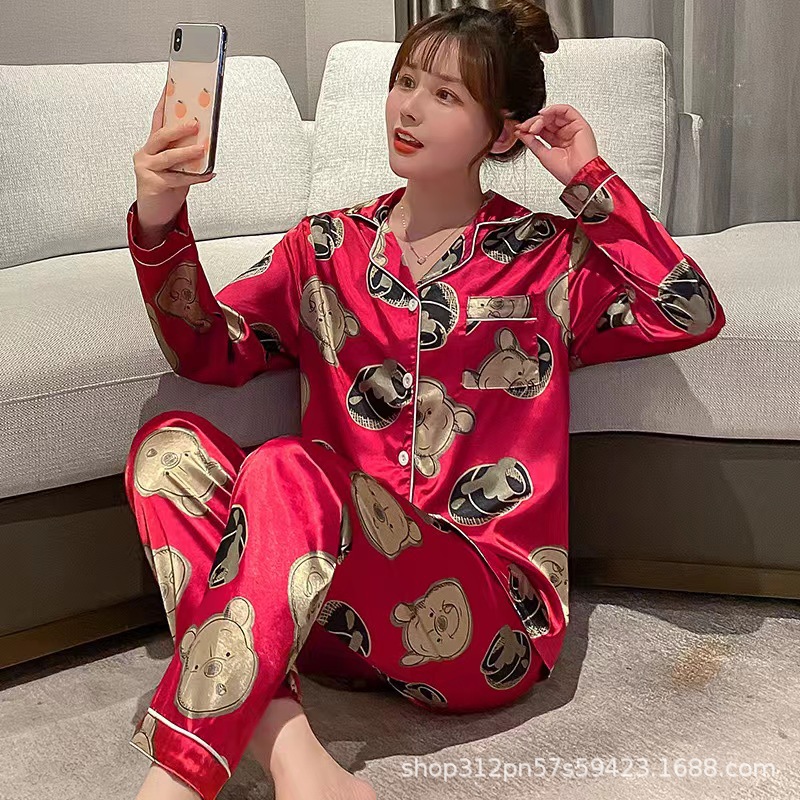 동남 아시아 잠옷 여성의 봄과 가을 카디건 긴 소매 달콤한 귀여운 모조 실크 가정 옷 세트