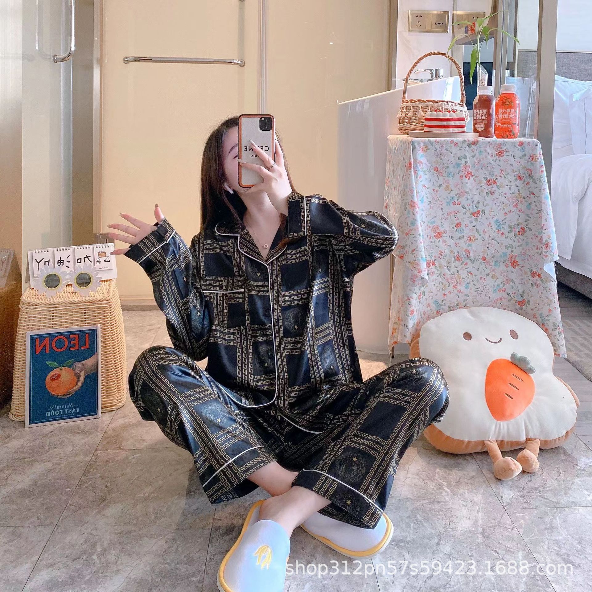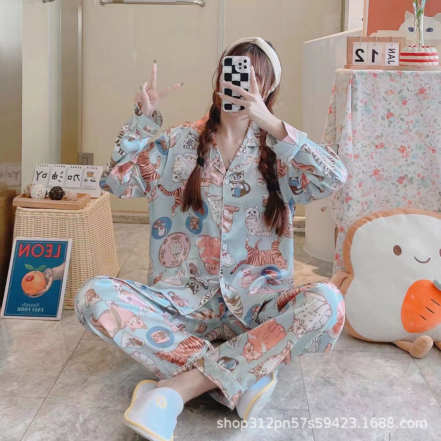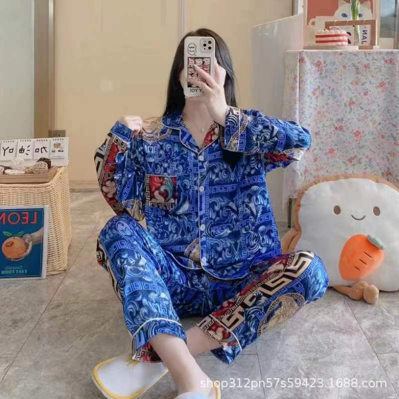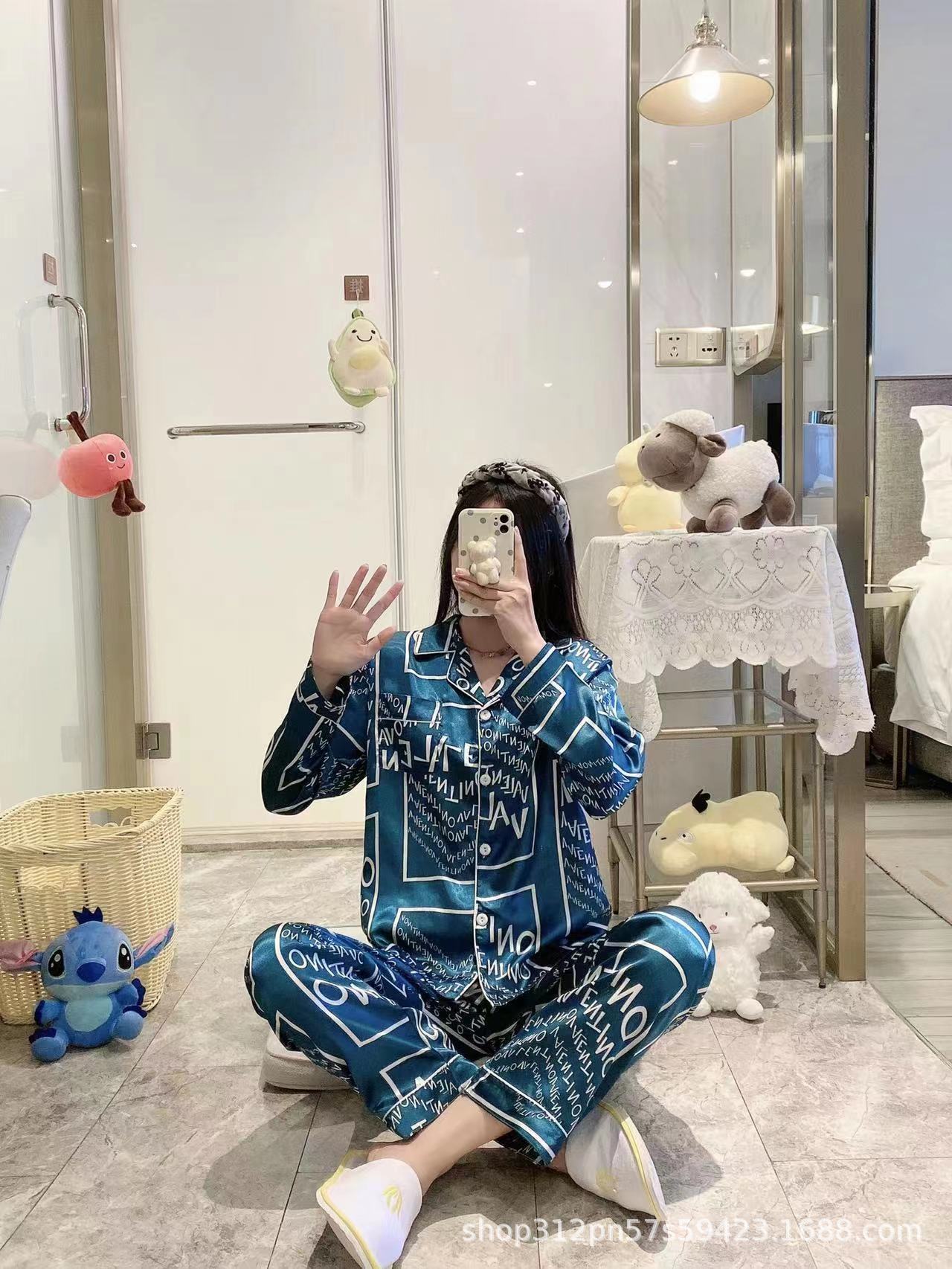 동남 아시아 잠옷 여성의 봄과 가을 카디건 긴 소매 달콤한 귀여운 모조 실크 가정 옷 세트스토어 가기