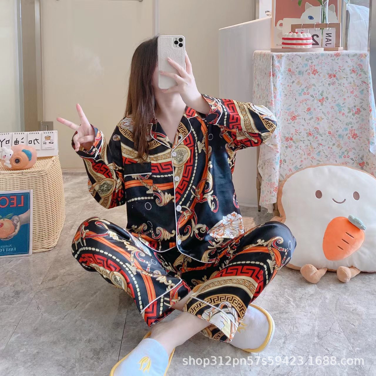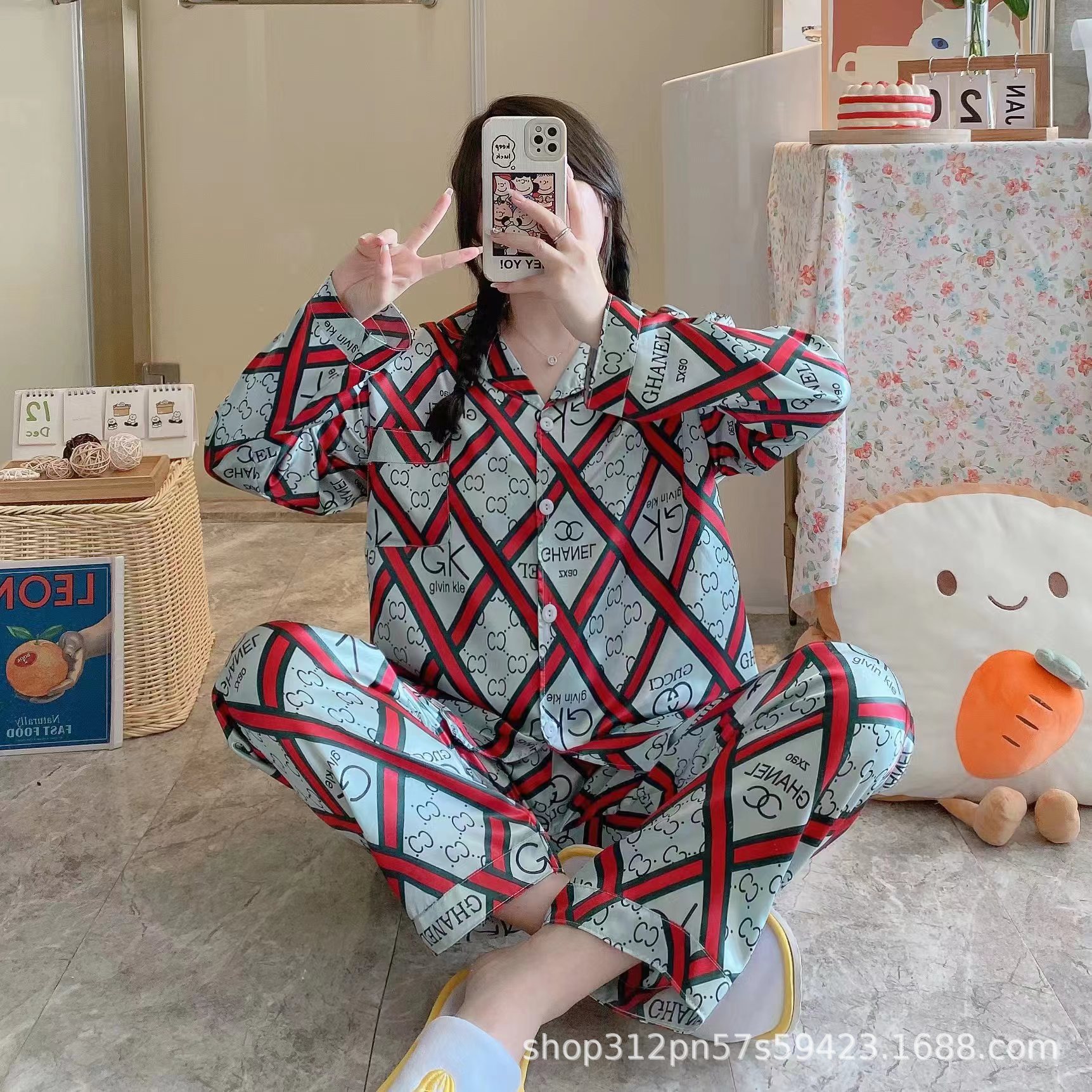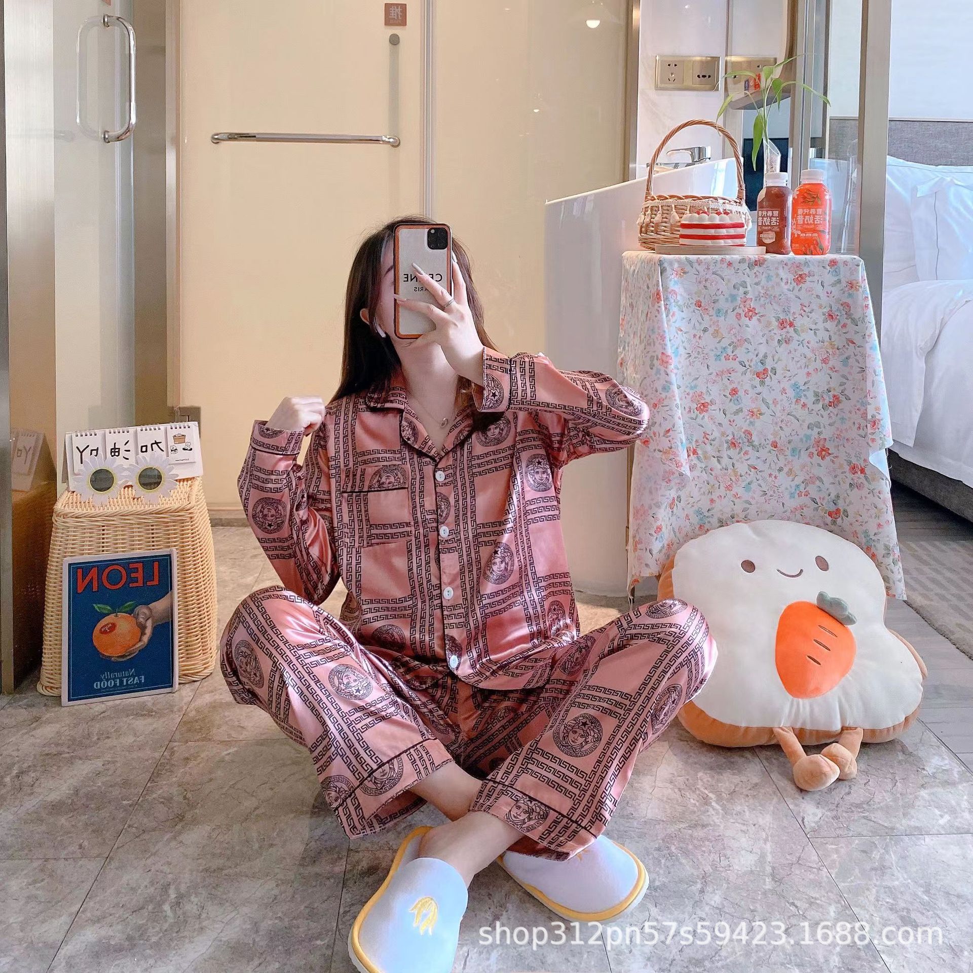 동남 아시아 잠옷 여성의 봄과 가을 카디건 긴 소매 달콤한 귀여운 모조 실크 가정 옷 세트스토어 가기