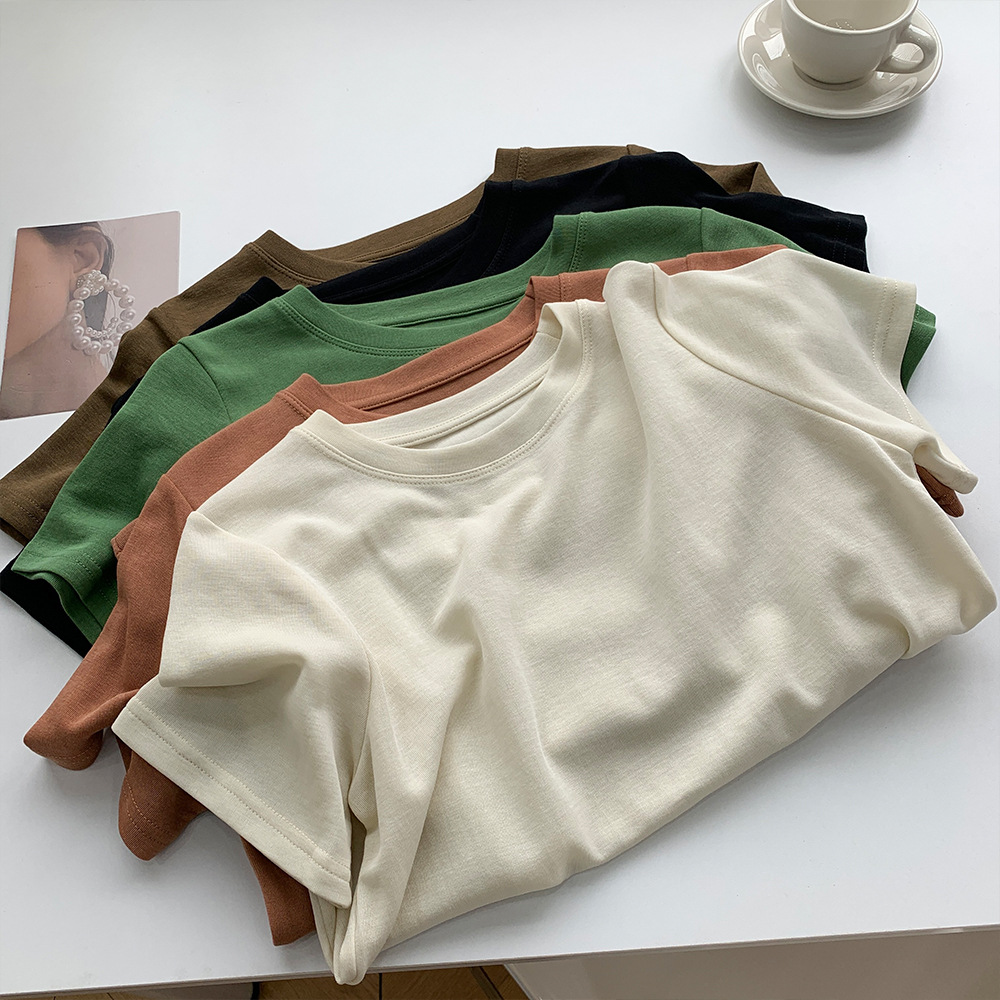 한국 스타일 심플 솔리드 컬러 라운드 넥 반팔 티셔츠 여성용 느슨한 슬리밍 편안한 통기성 여름 캐주얼 베이스 셔츠 탑스토어 가기