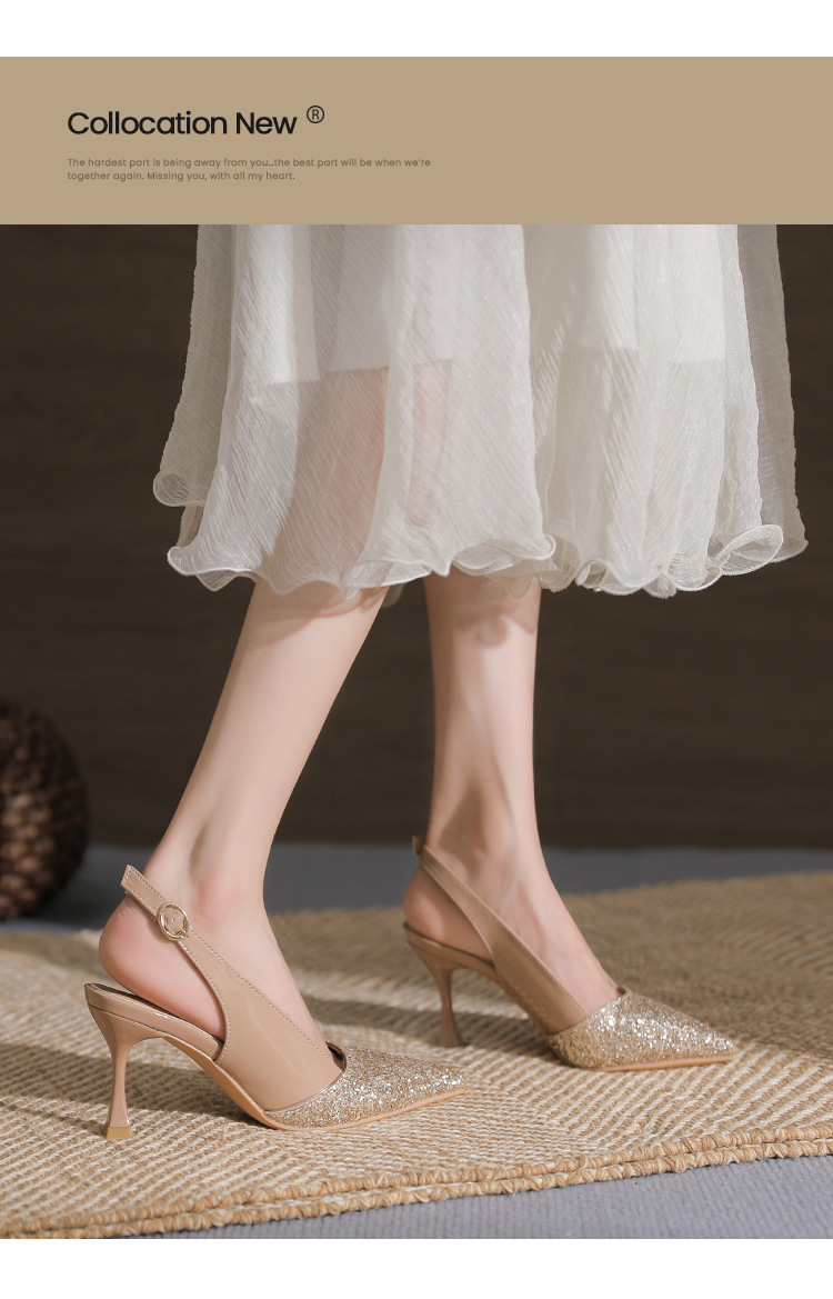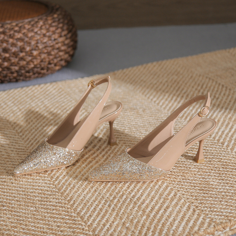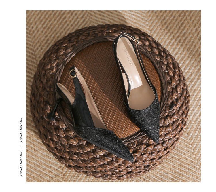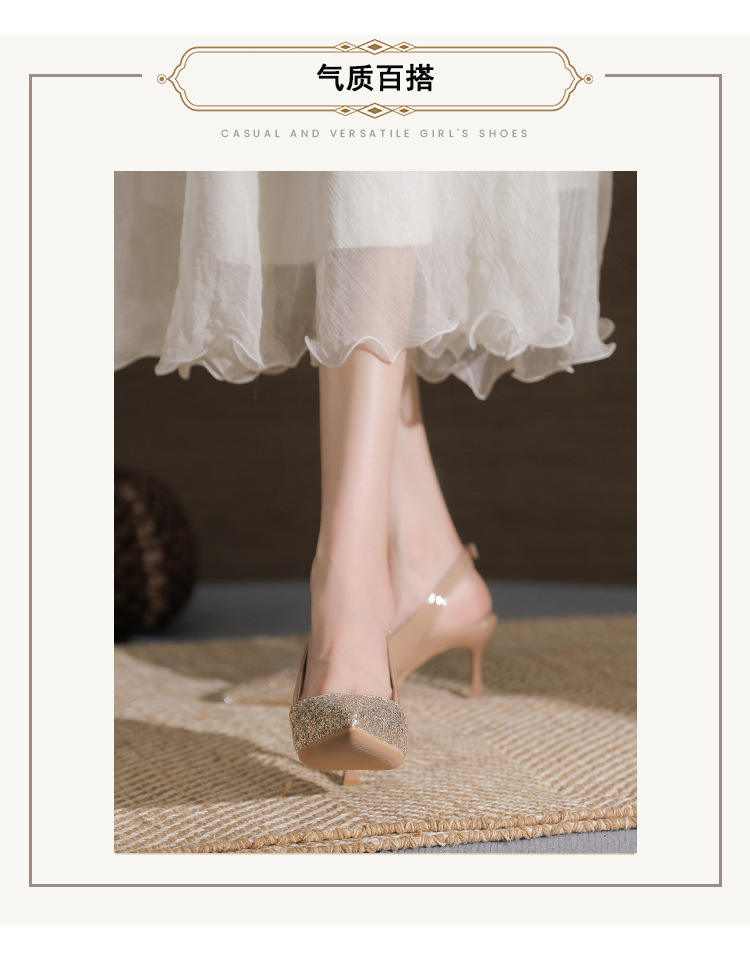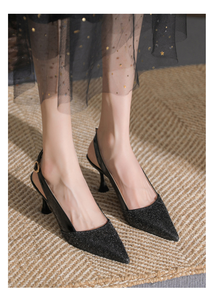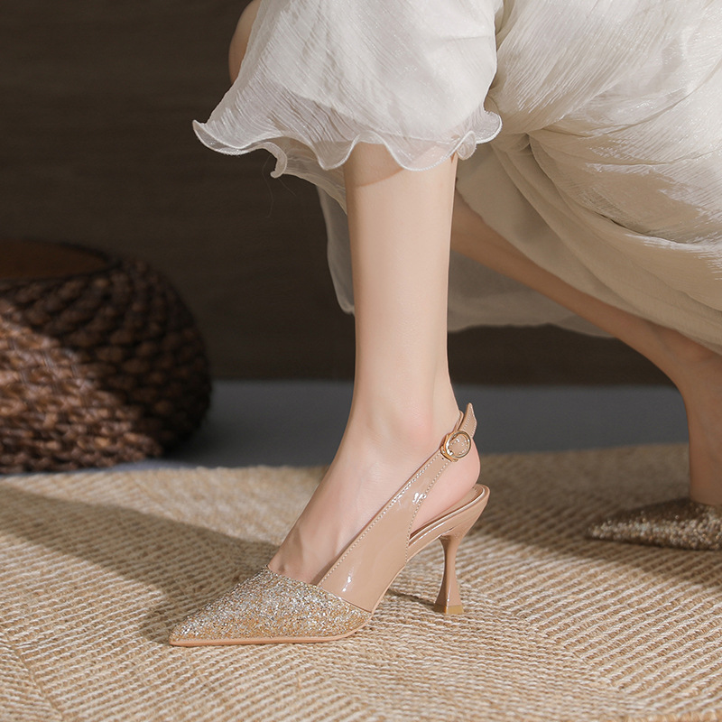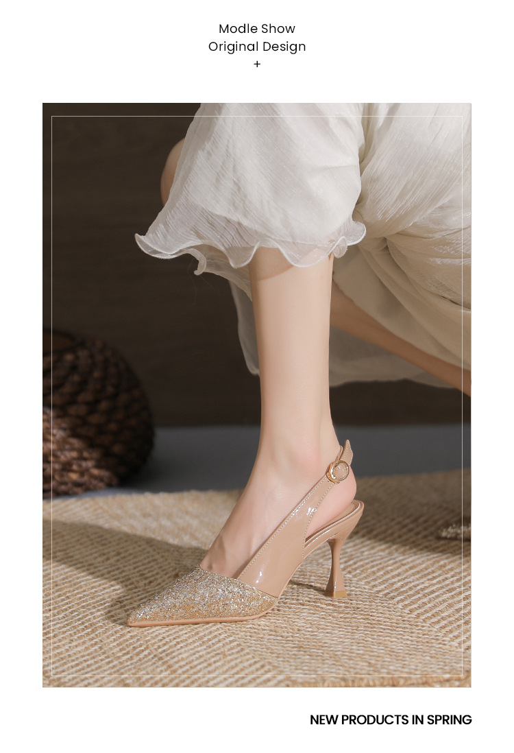 봉합 된 닫힌 발가락 등 빈 샌들 여성 뾰족한 스틸레토 힐 2023 여름 새로운 스타일의 백 스트랩 하이힐 미드 힐 패션 여성 신발스토어 가기