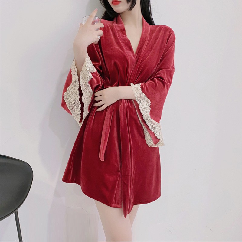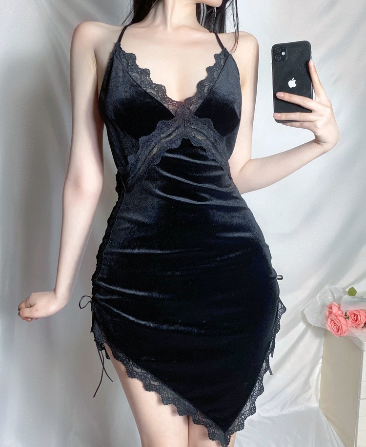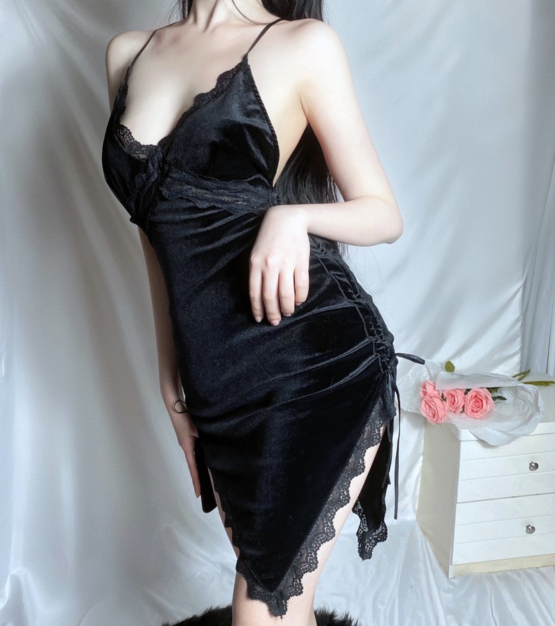 섹시한 잠옷 여자의 새로운 레이스 잠옷 봄과 여름 벨벳 순수한 욕망 바람 등이없는 개인 슬링 가정 옷 세트