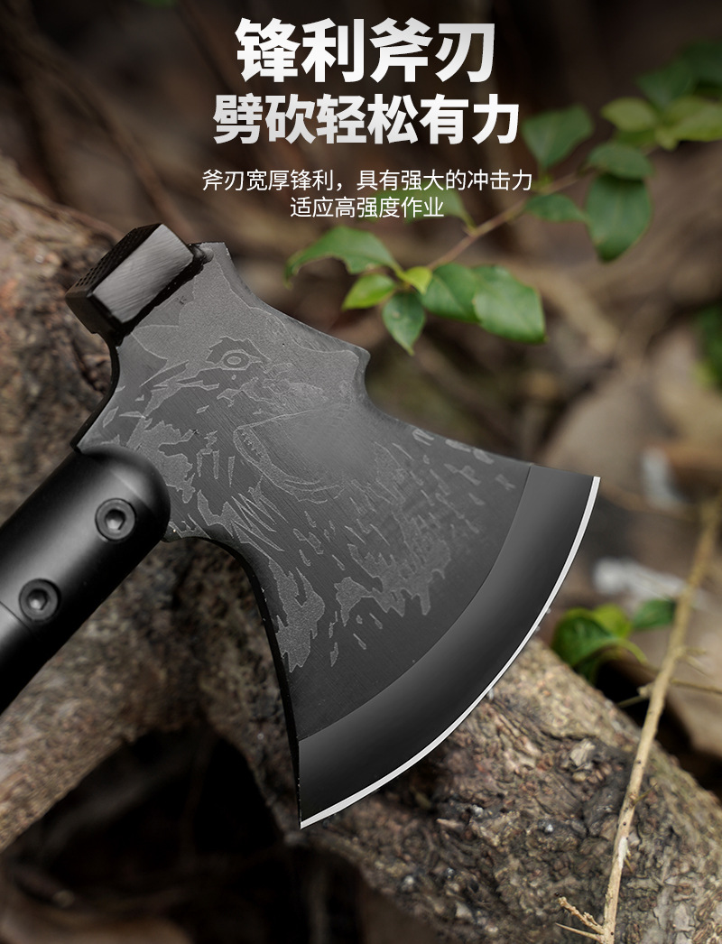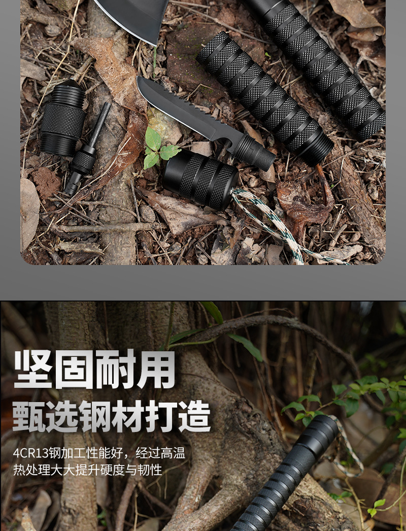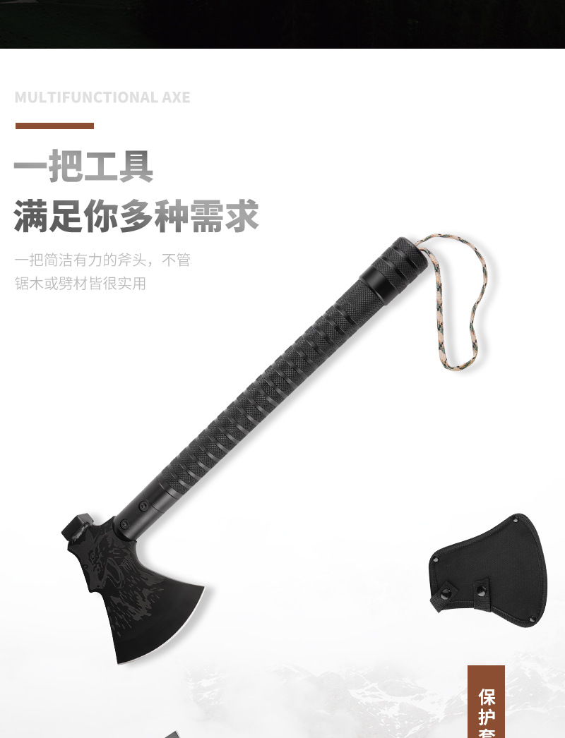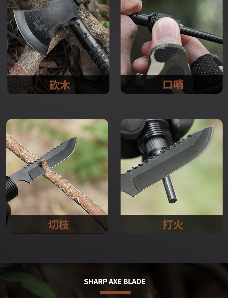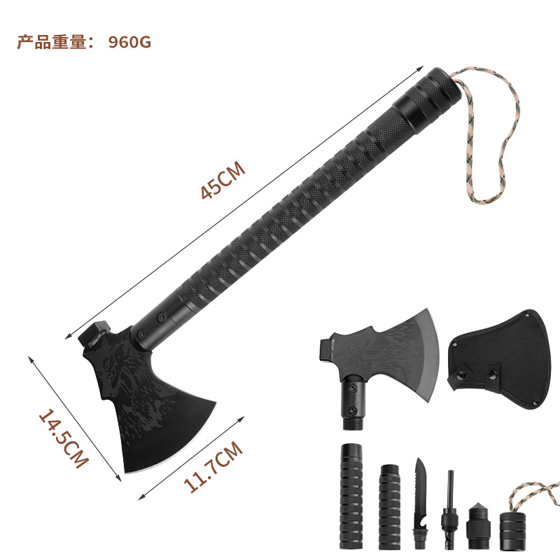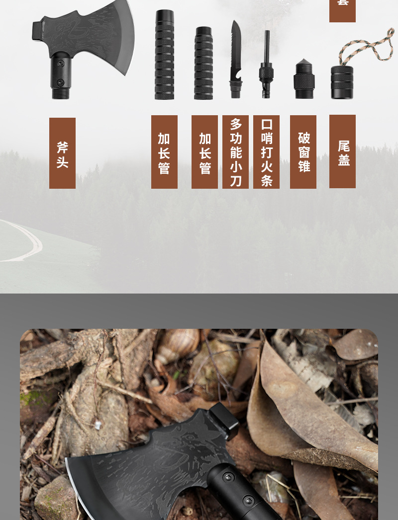 功能介绍:斧头,加长管*2,保护套,指南针,割绳器,打火石,口哨,刀子,破窗锤