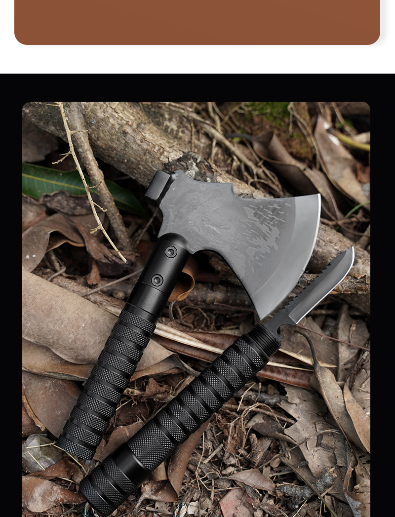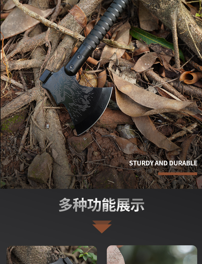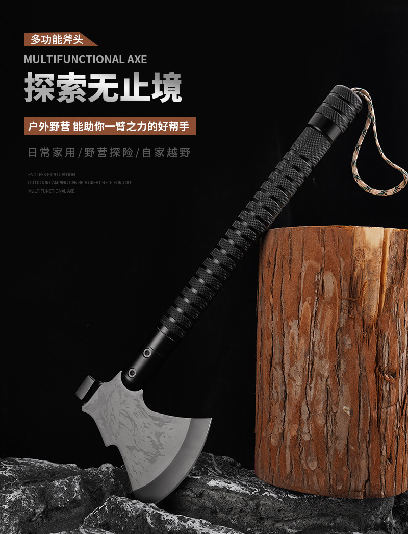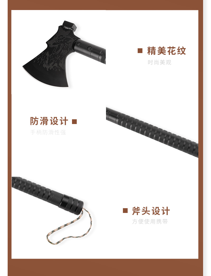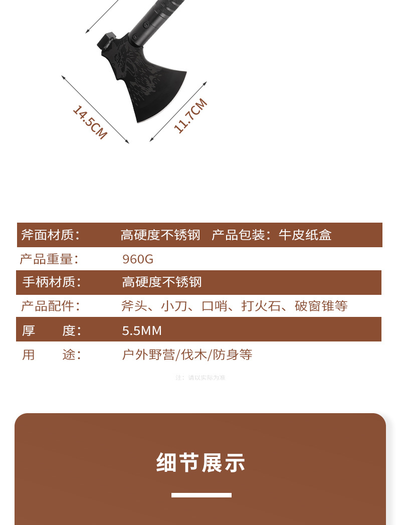 功能介绍:斧头,加长管*2,保护套,指南针,割绳器,打火石,口哨,刀子,破窗锤