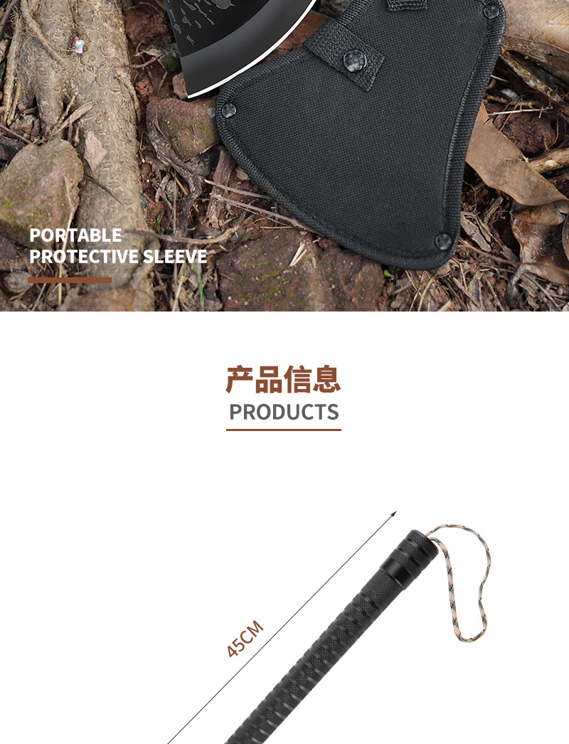 产品清单:斧头*1 加长管*2,小刀,哨子,打火棒,破窗锥,指南针,收纳盒*1 斧头袋*1