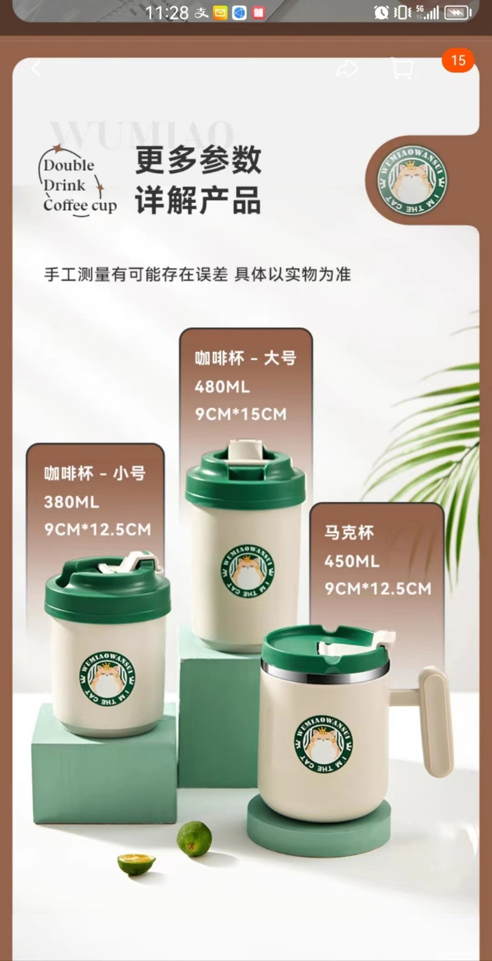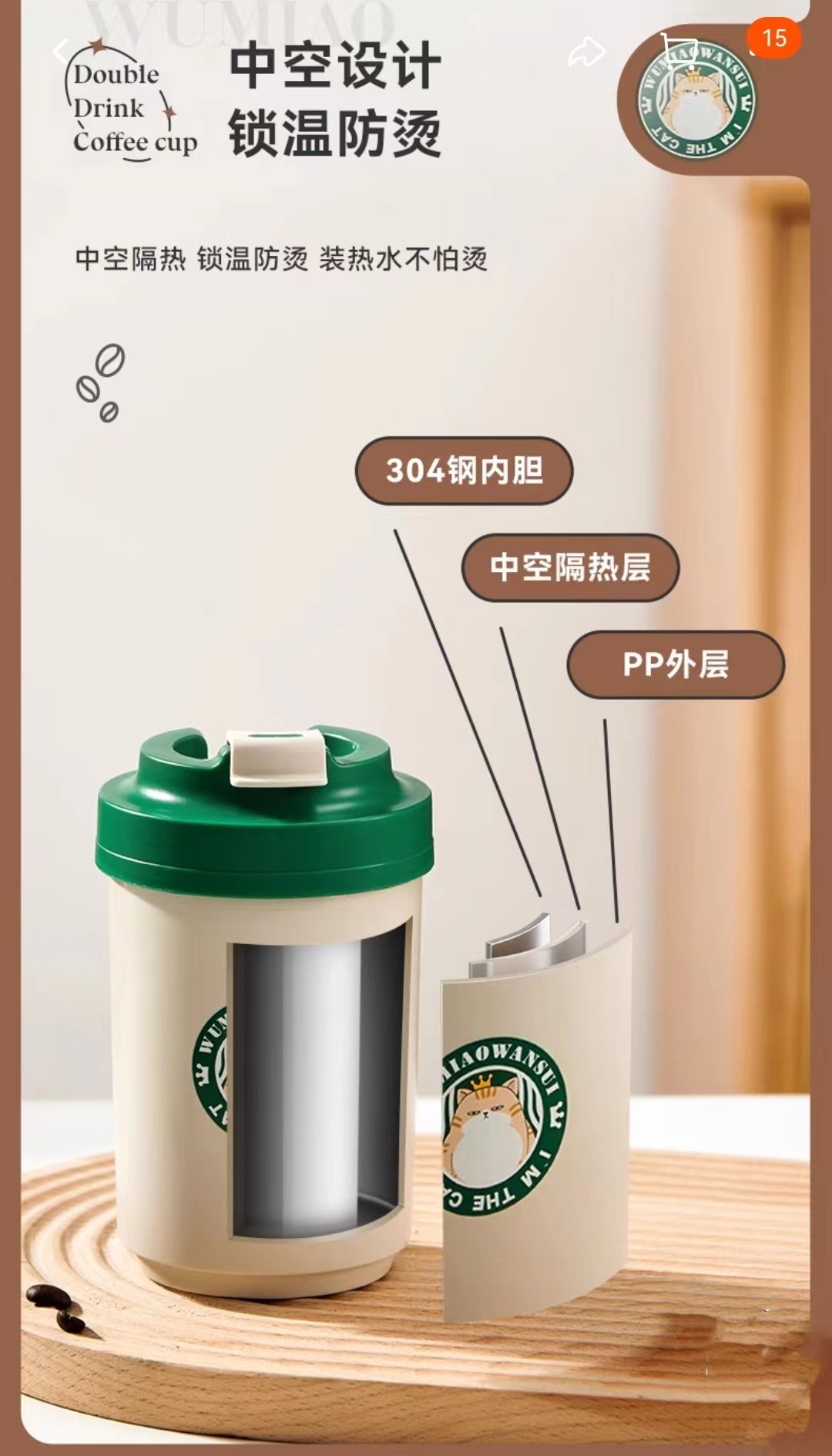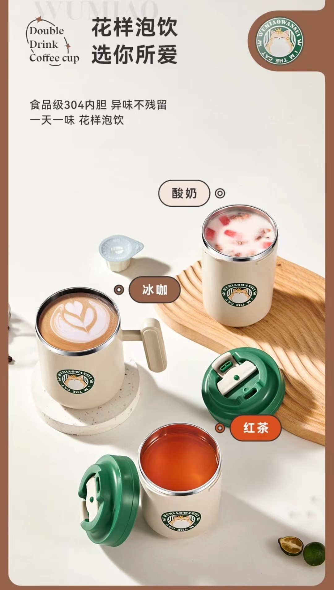 • 커피 컵 내 녹색 고양이 스테인레스 스틸 라이너 (480ML ..