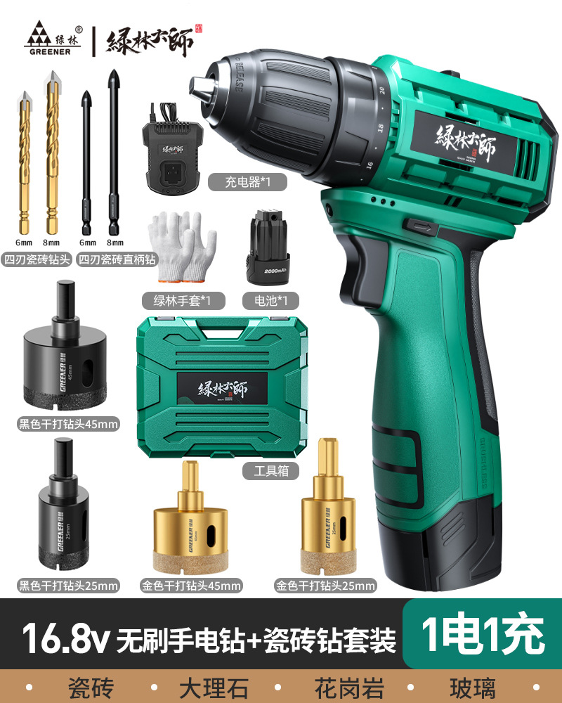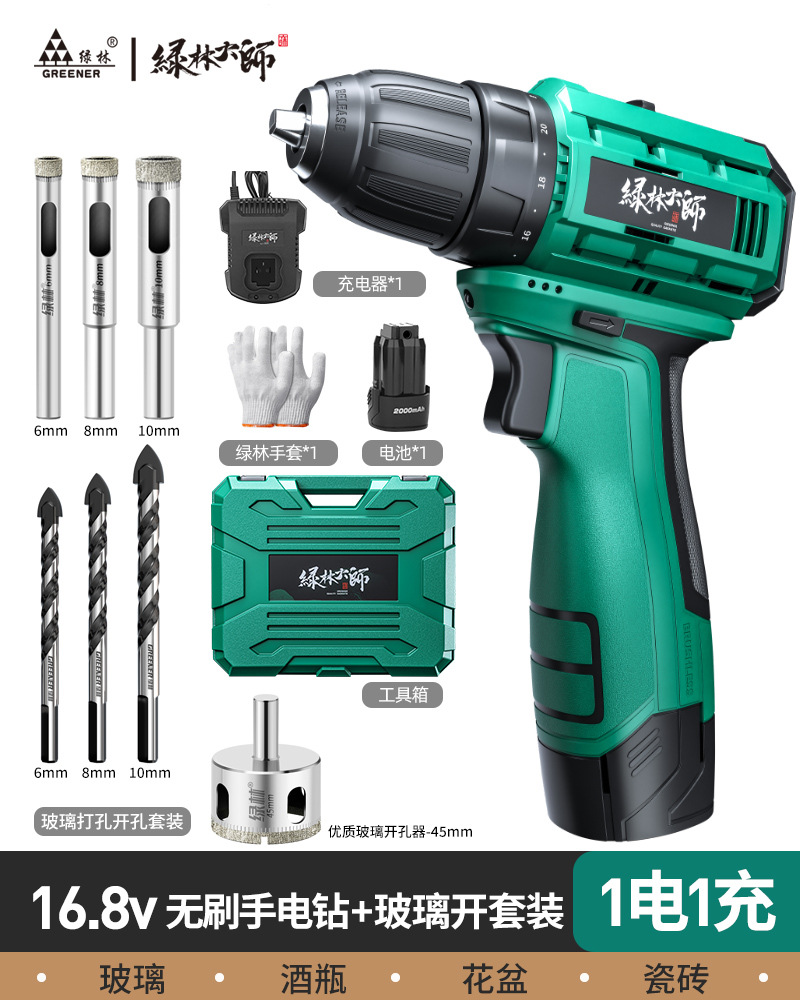 • 16.8V 브러시리스 손 전기 드릴 + 유리 개방 세트