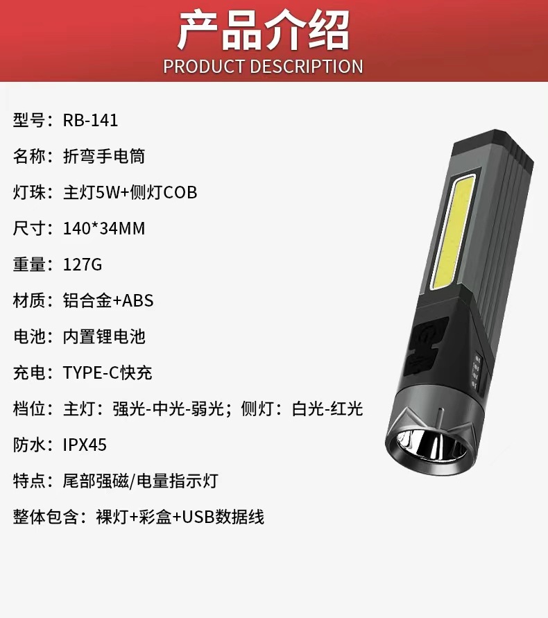 • RB-141 굽힘 손전등 표준 (베어 램프 + 데이터 라인 + 내장 1500 mA 리튬 배터리 + 컬러 박스)