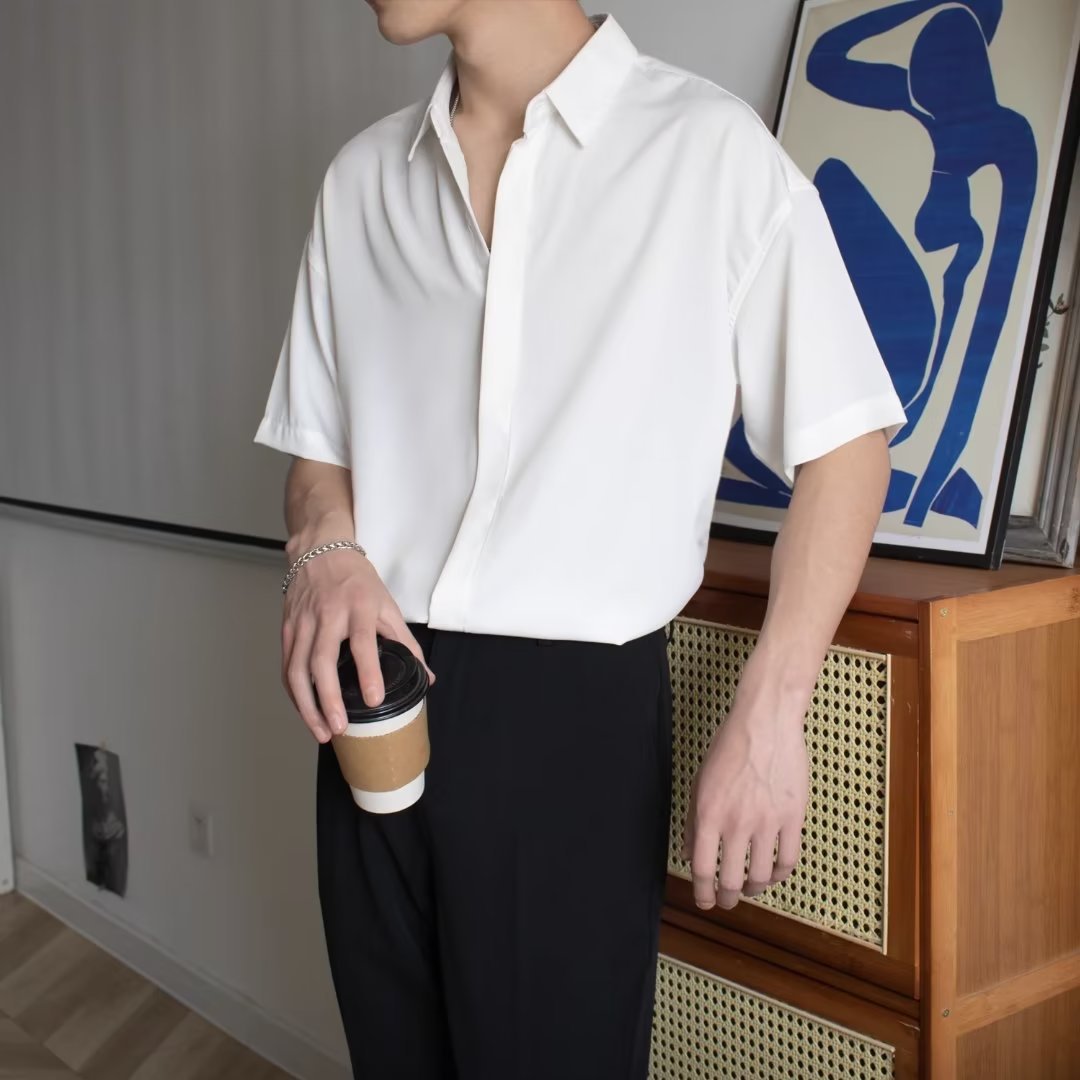 가벼운 성숙한 스타일 반팔 셔츠 남성용 여름 비 다림질 펜던트 단색 셔츠 남성 캐주얼 아이스 실크 탑 트렌디 통기성스토어 가기