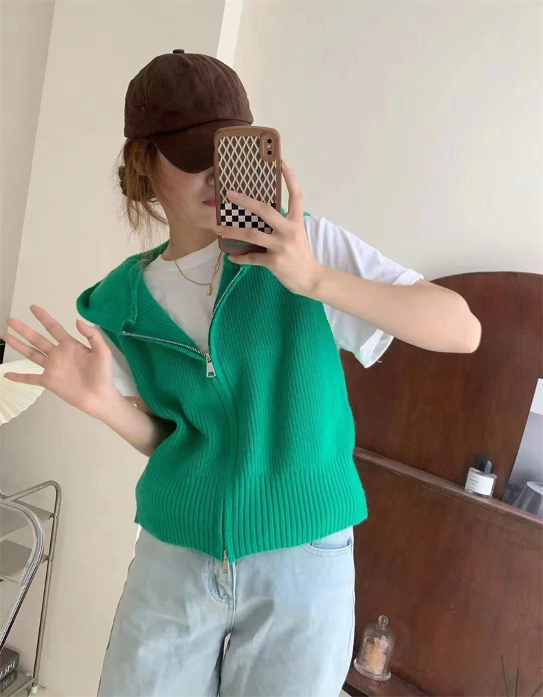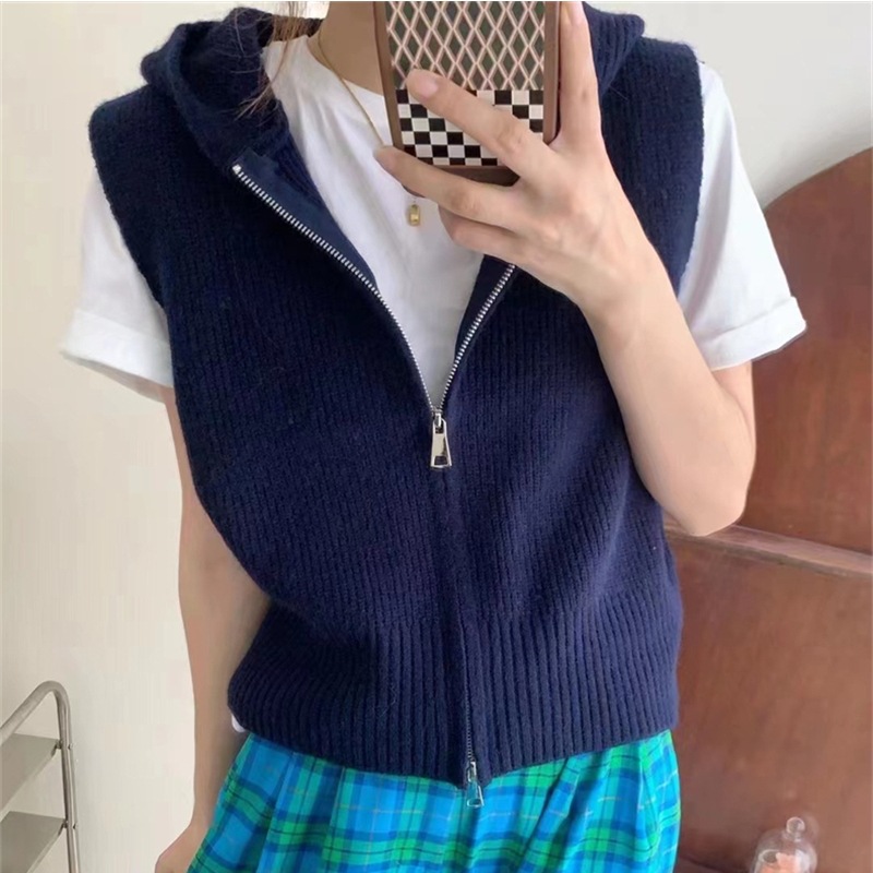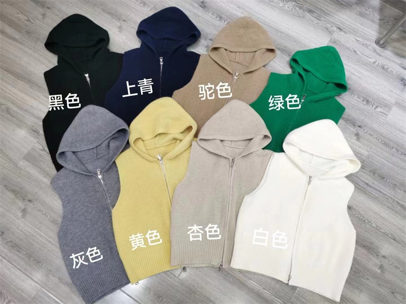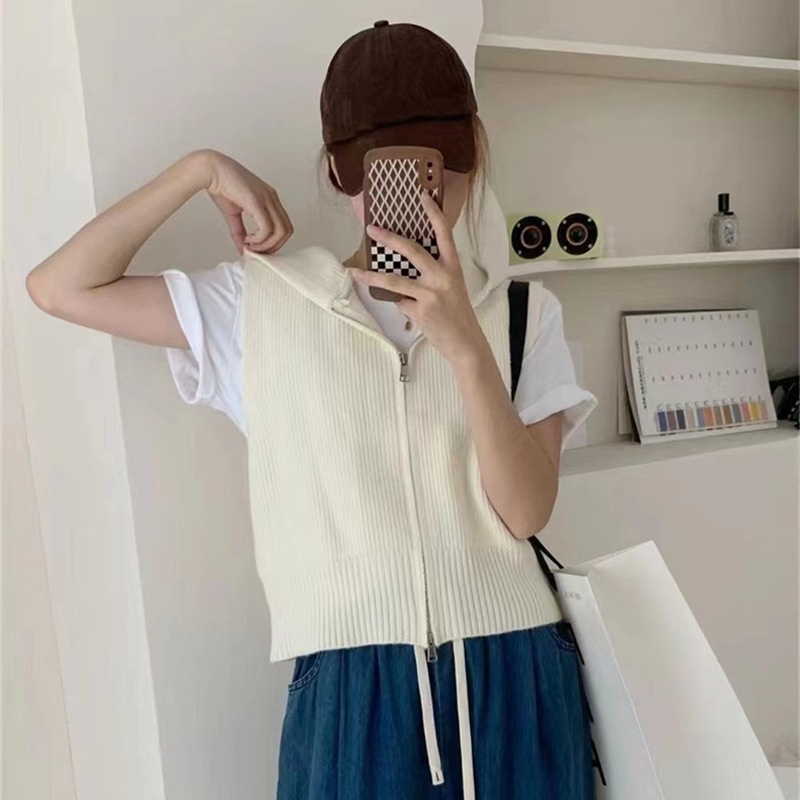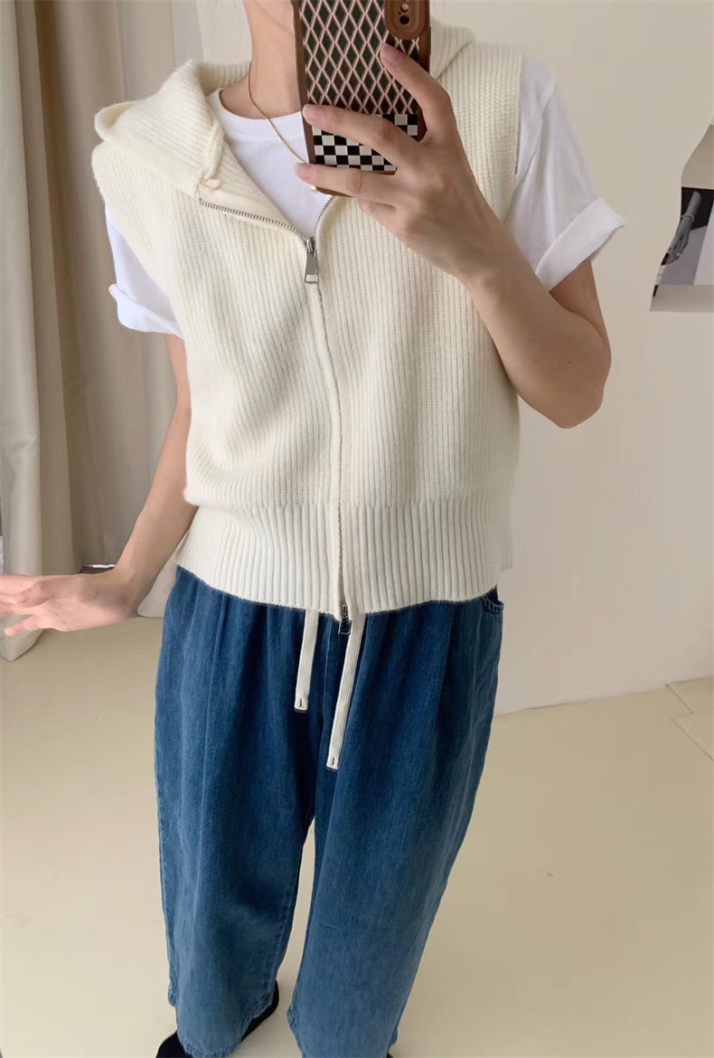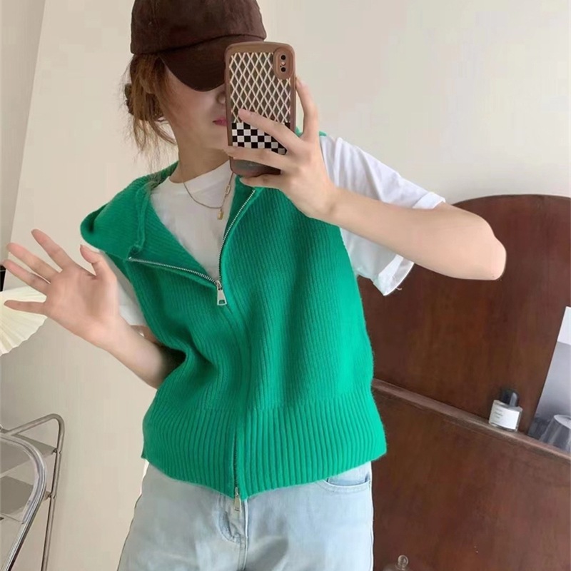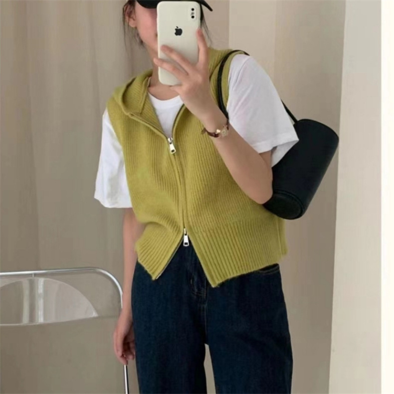 후드 니트 조끼 새로운 지퍼 카디건 여성의 짧은 겉옷 느슨한 웨이슬 민소매 스웨터 코트 탑 여성스토어 가기
