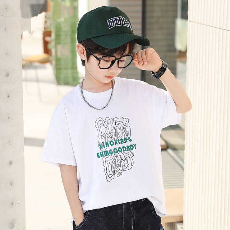 퓨어 코튼 탑 아동복 소년 반팔 티셔츠 2024 여름 새 어린이 화이트 티셔츠 중 · 대형 어린이 한국 스타일스토어 가기