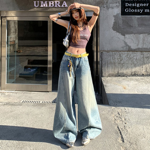 유럽 좁은 스트레이트 청바지 2023 새로운 디자인 감각 높은 허리 편지 모조 다이아몬드 구멍 데님 넓은 다리 바지 여성용