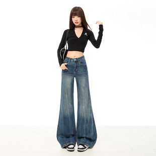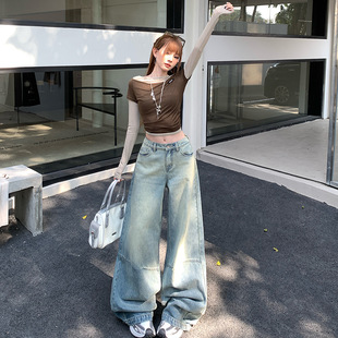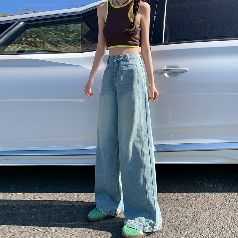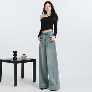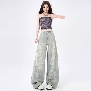 유럽 좁은 스트레이트 청바지 2023 새로운 디자인 감각 높은 허리 편지 모조 다이아몬드 구멍 데님 넓은 다리 바지 여성용스토어 가기
