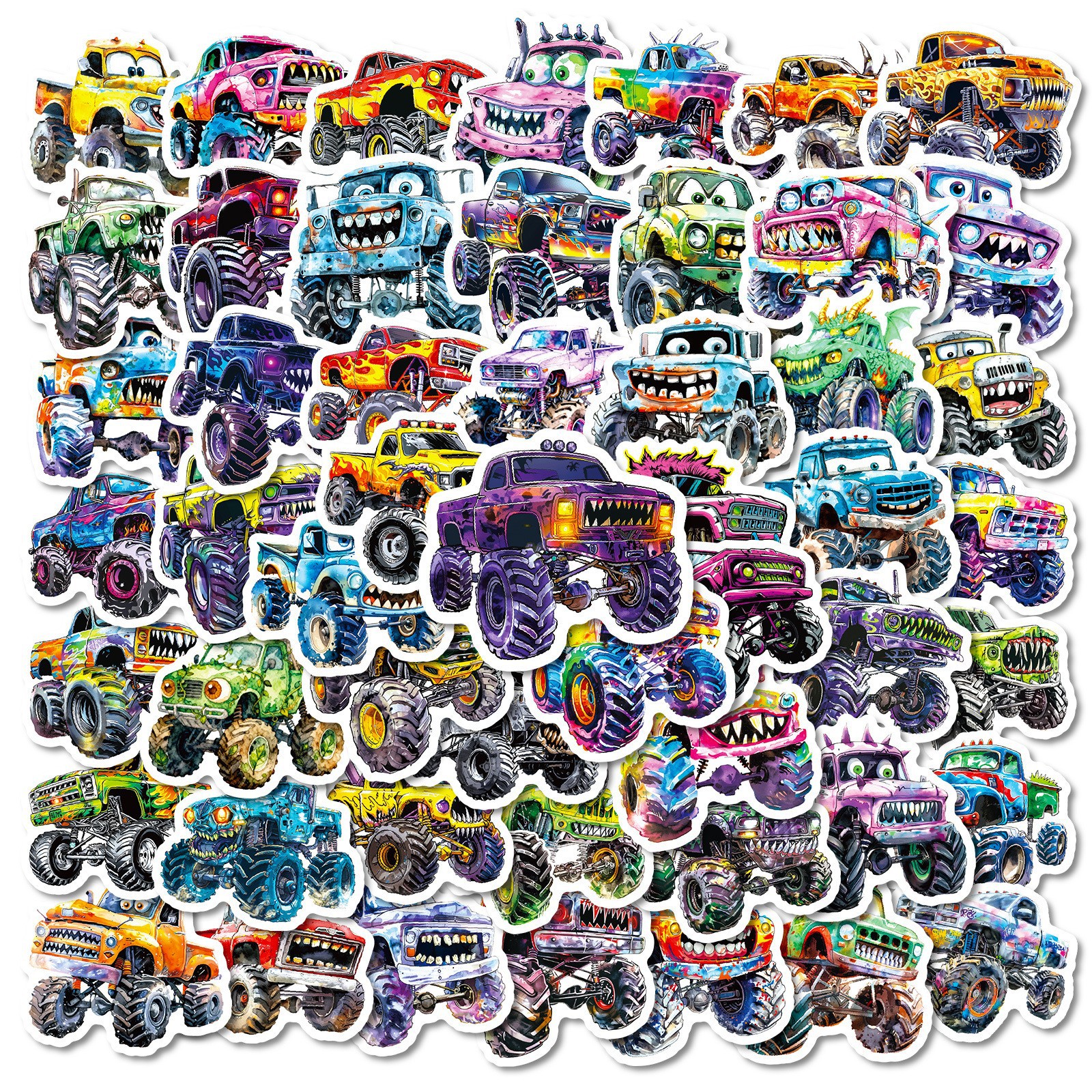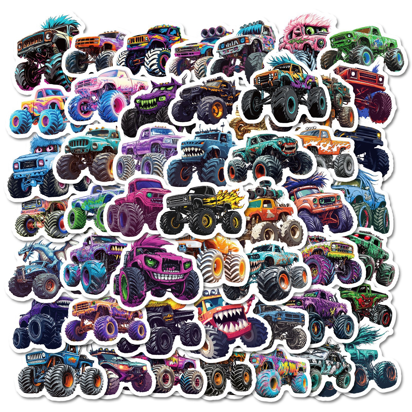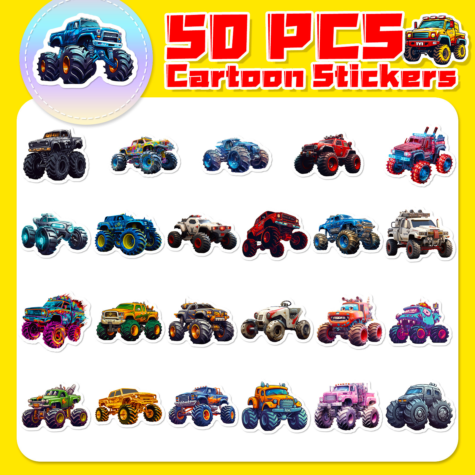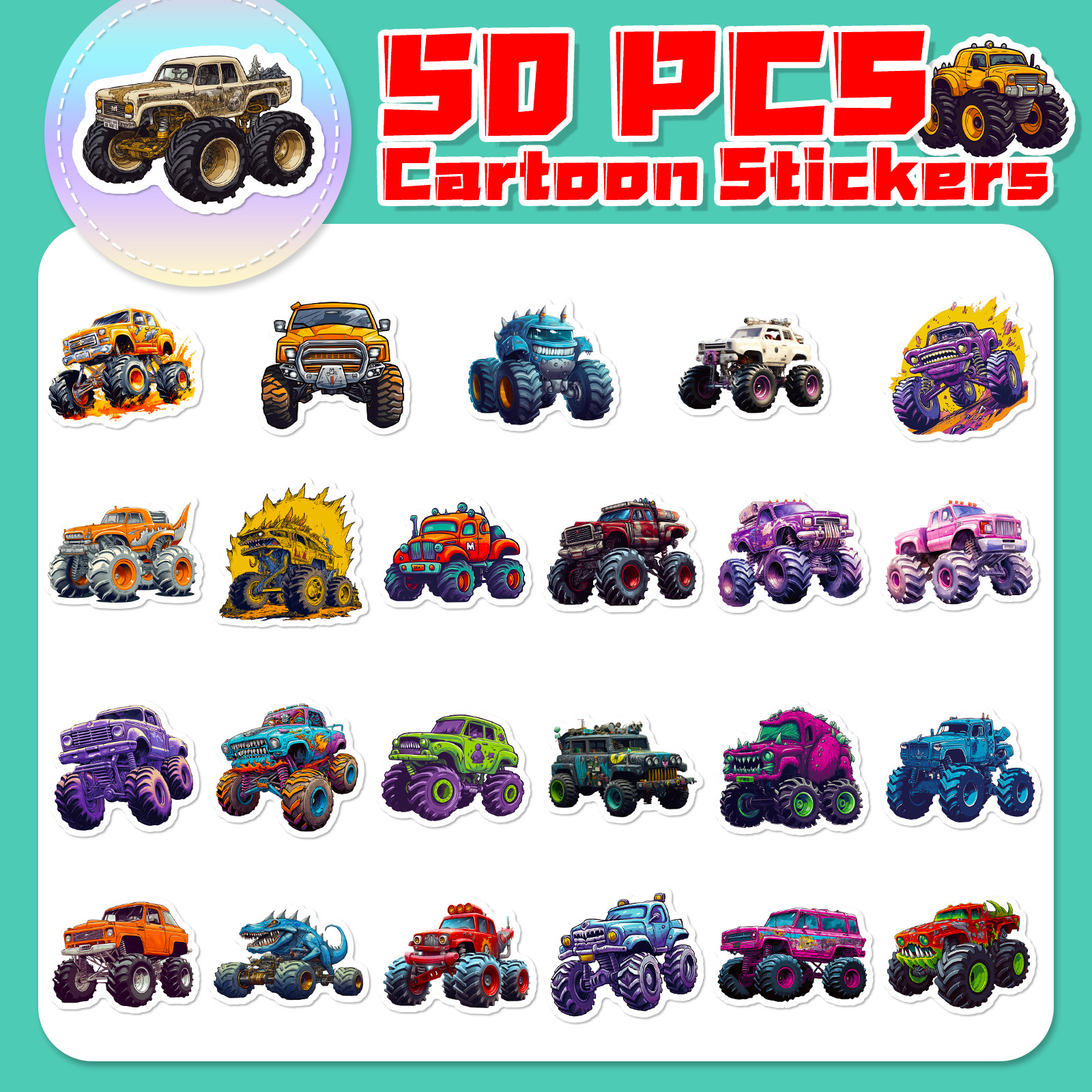50pcs 괴물 트럭 스티커 만화 자동차 빅풋 트럭 차량 낙서 멋진 장식 스티커스토어 가기