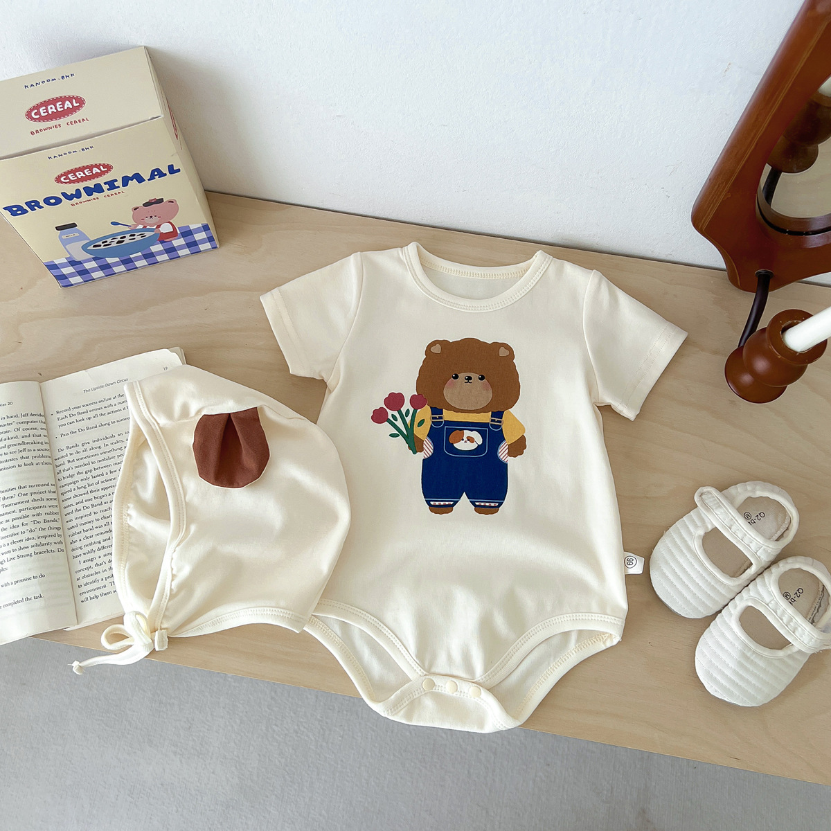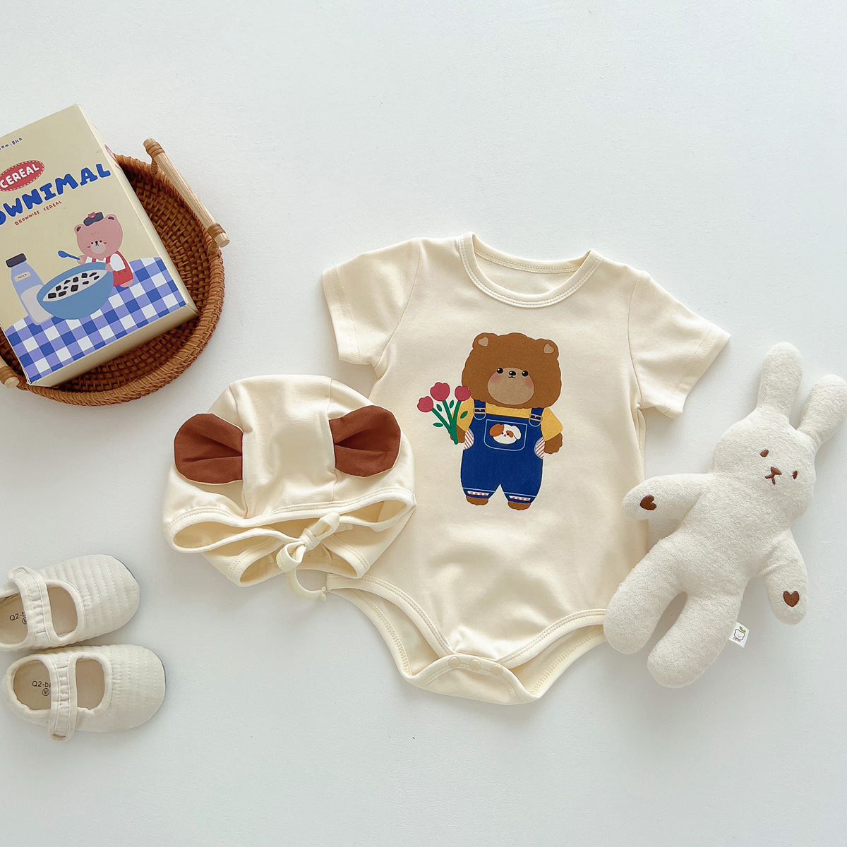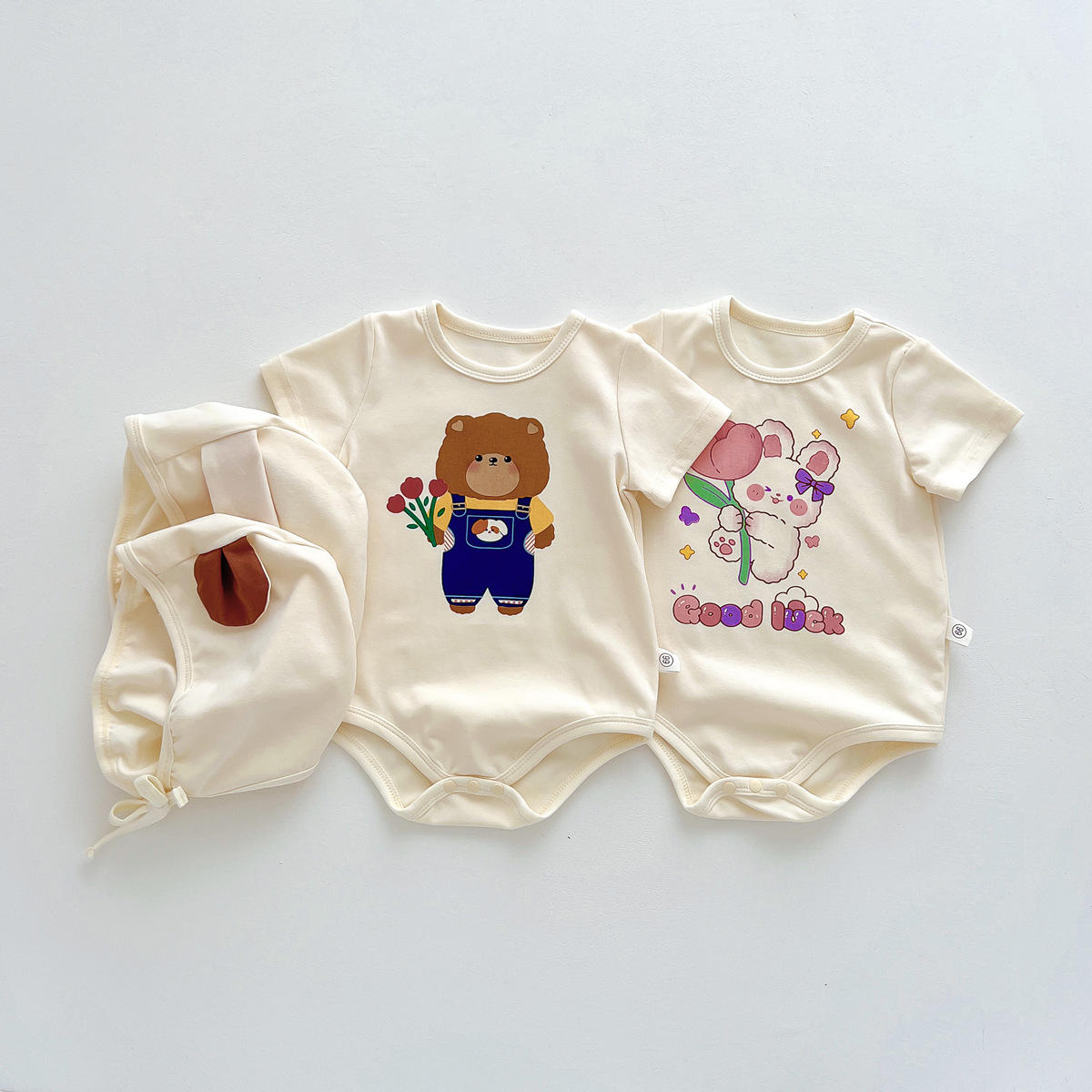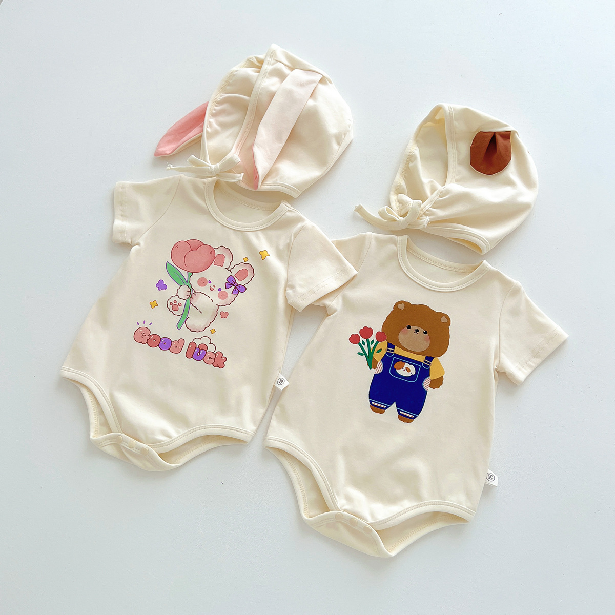 신생아 만화 모양의 가방 옷에 한국 스타일 아기 귀여운 곰 점프 슈트 아기 백일 사진 세트