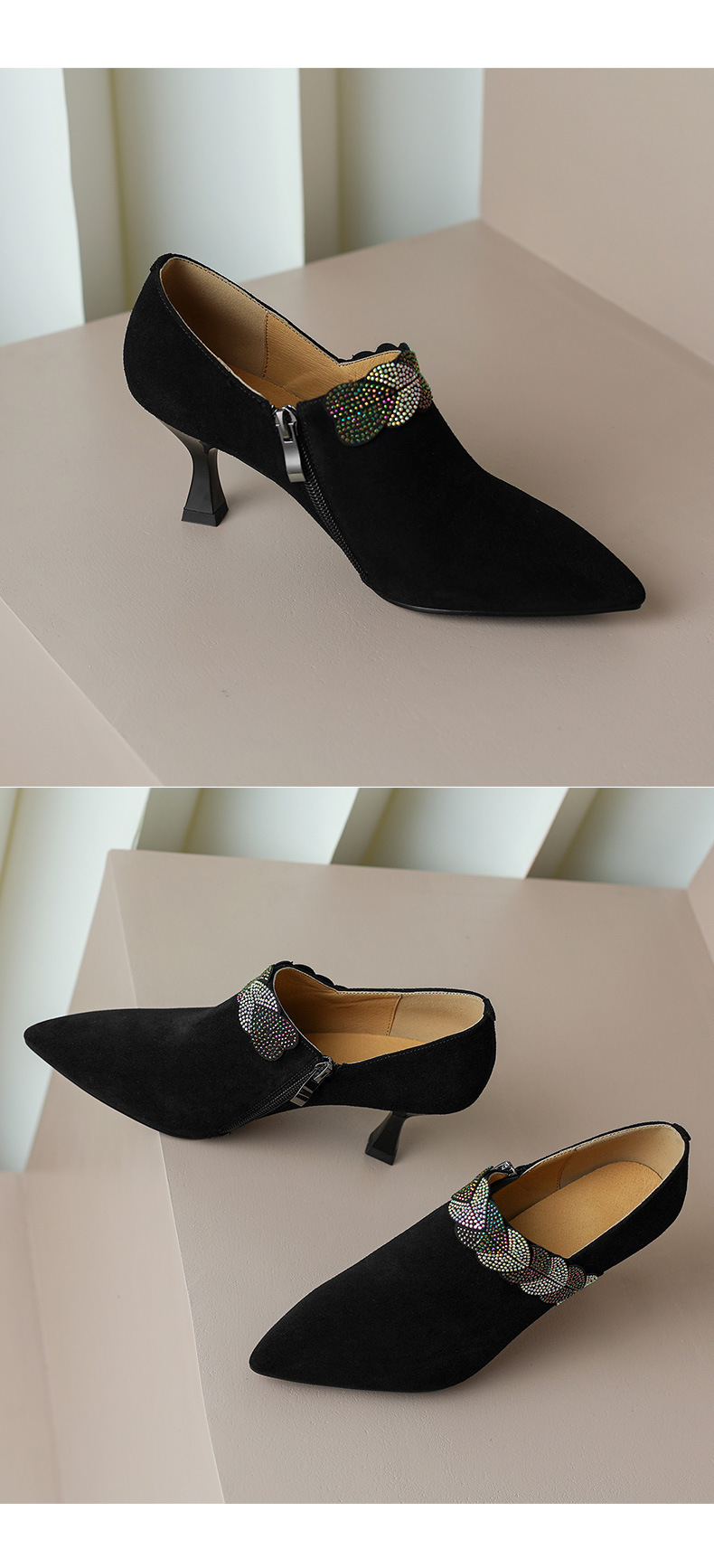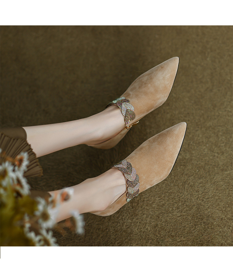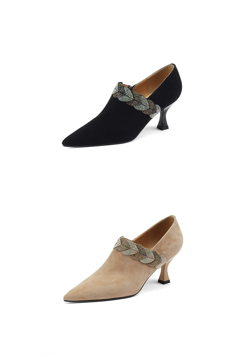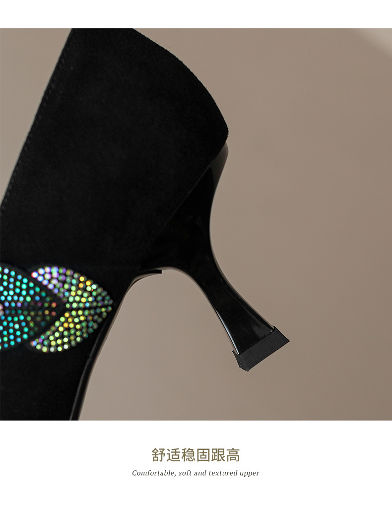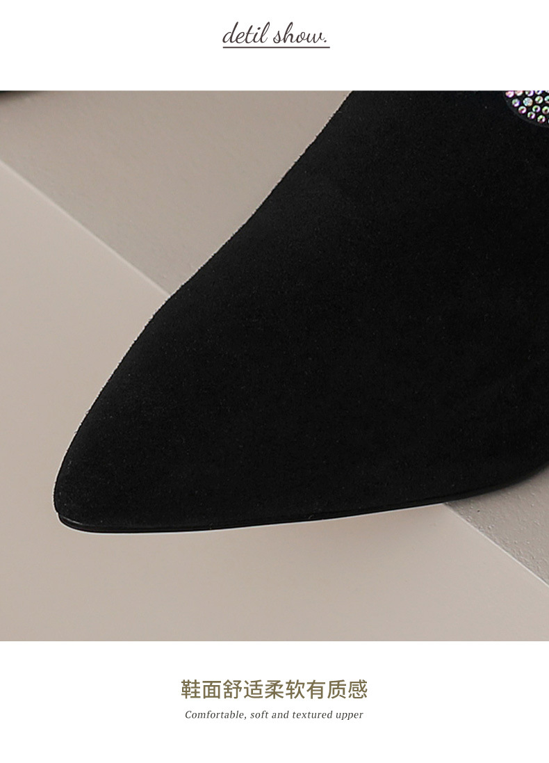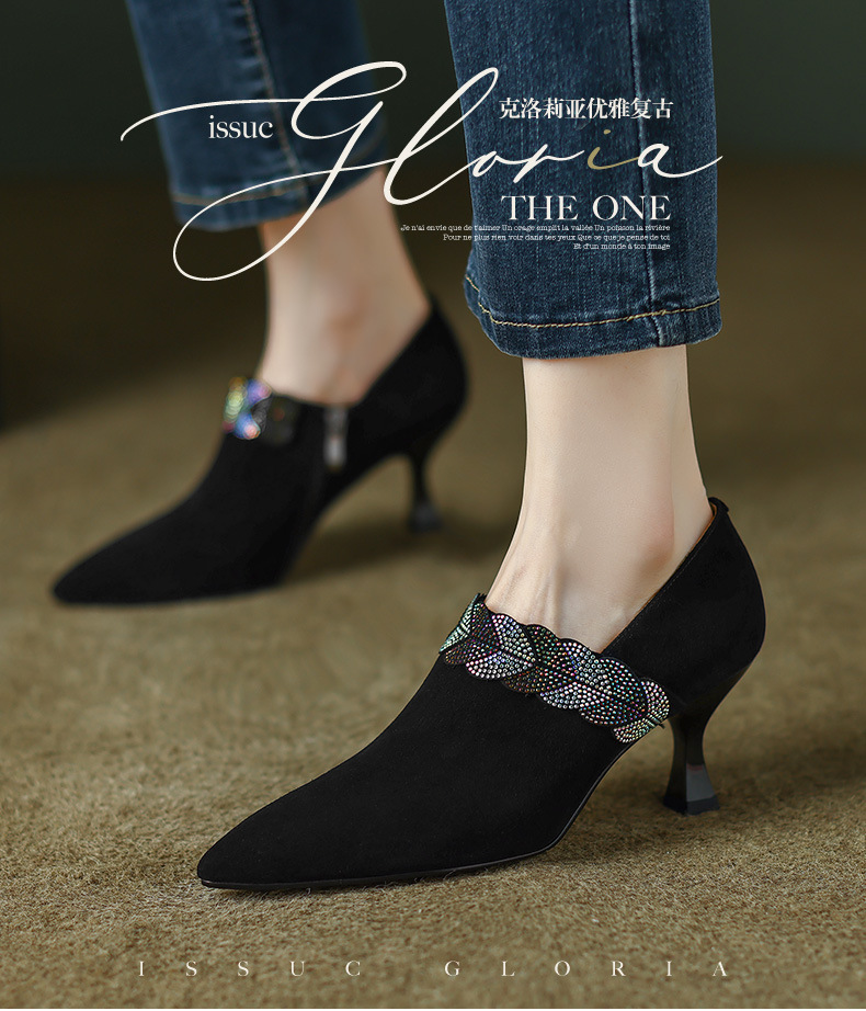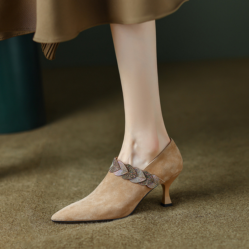 내부 및 외부 전체 가죽 스틸레토 뾰족한 발가락 옆 지퍼 모조 다이아몬드 양피 신발 한국식 빈티지 하이힐 소형 가죽 신발 트렌디 한 알몸 부츠스토어 가기