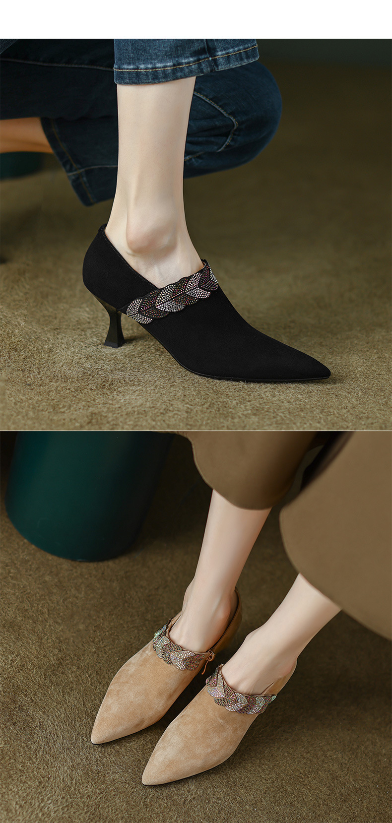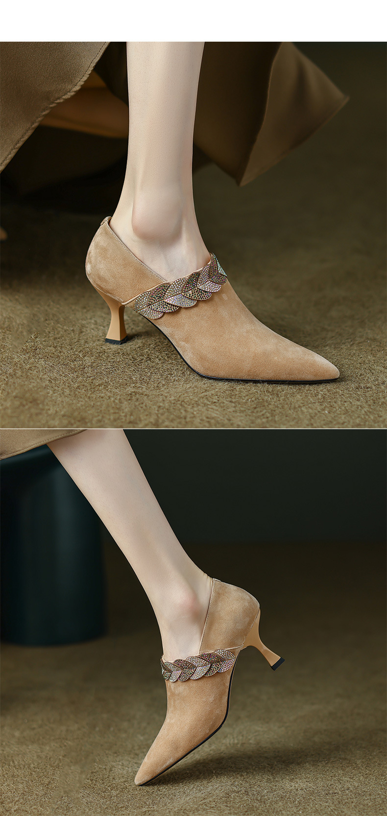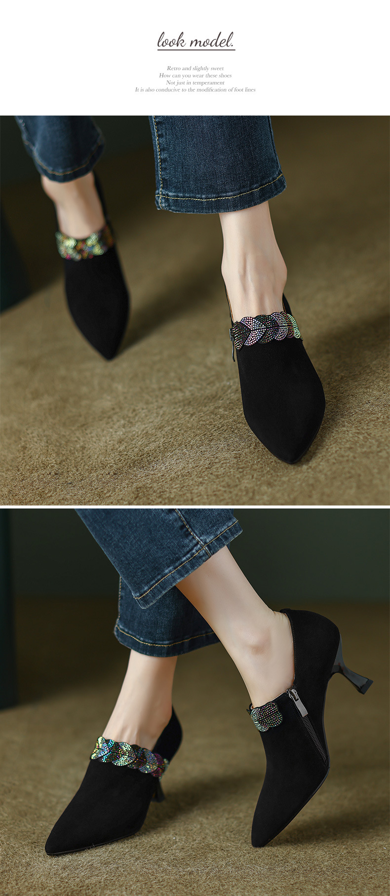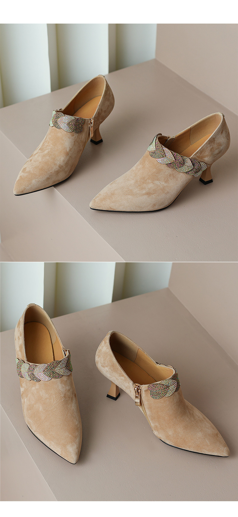 내부 및 외부 전체 가죽 스틸레토 뾰족한 발가락 옆 지퍼 모조 다이아몬드 양피 신발 한국식 빈티지 하이힐 소형 가죽 신발 트렌디 한 알몸 부츠스토어 가기