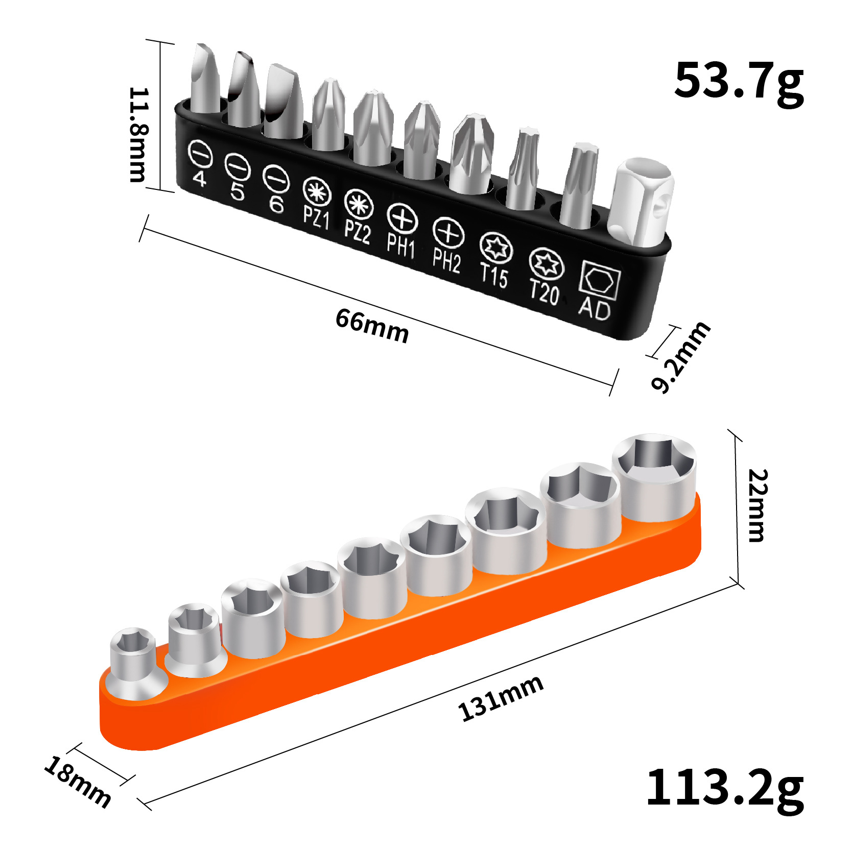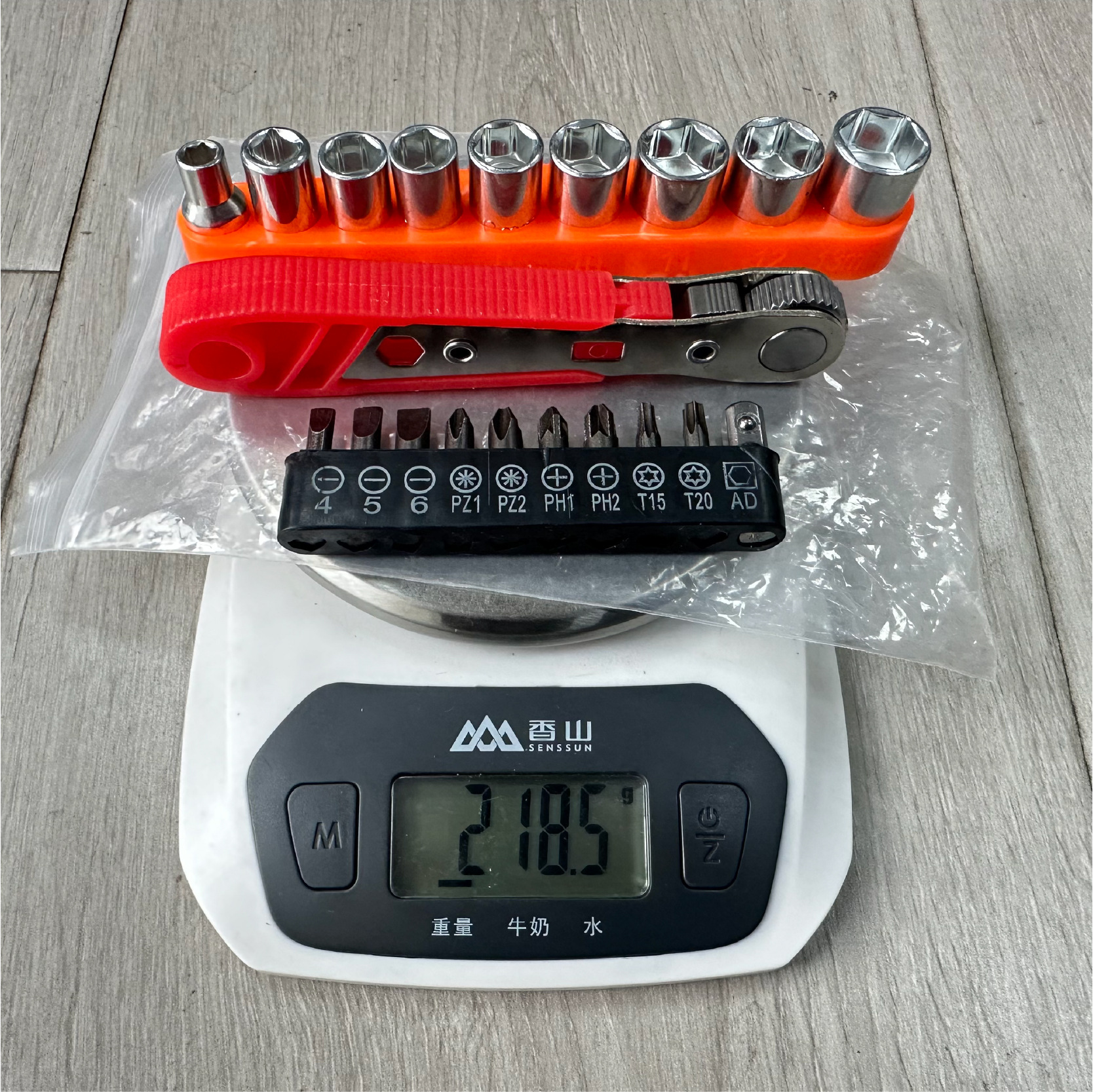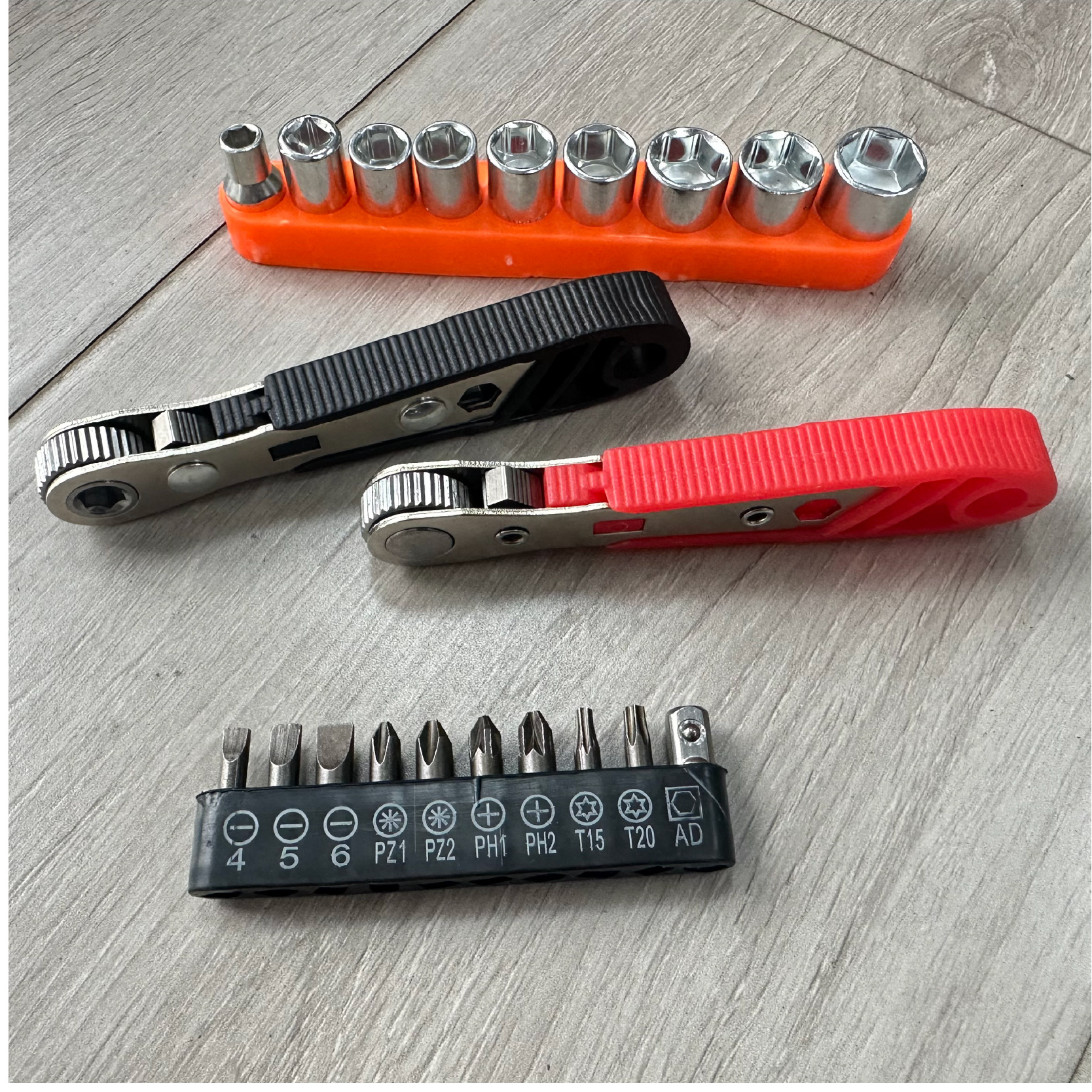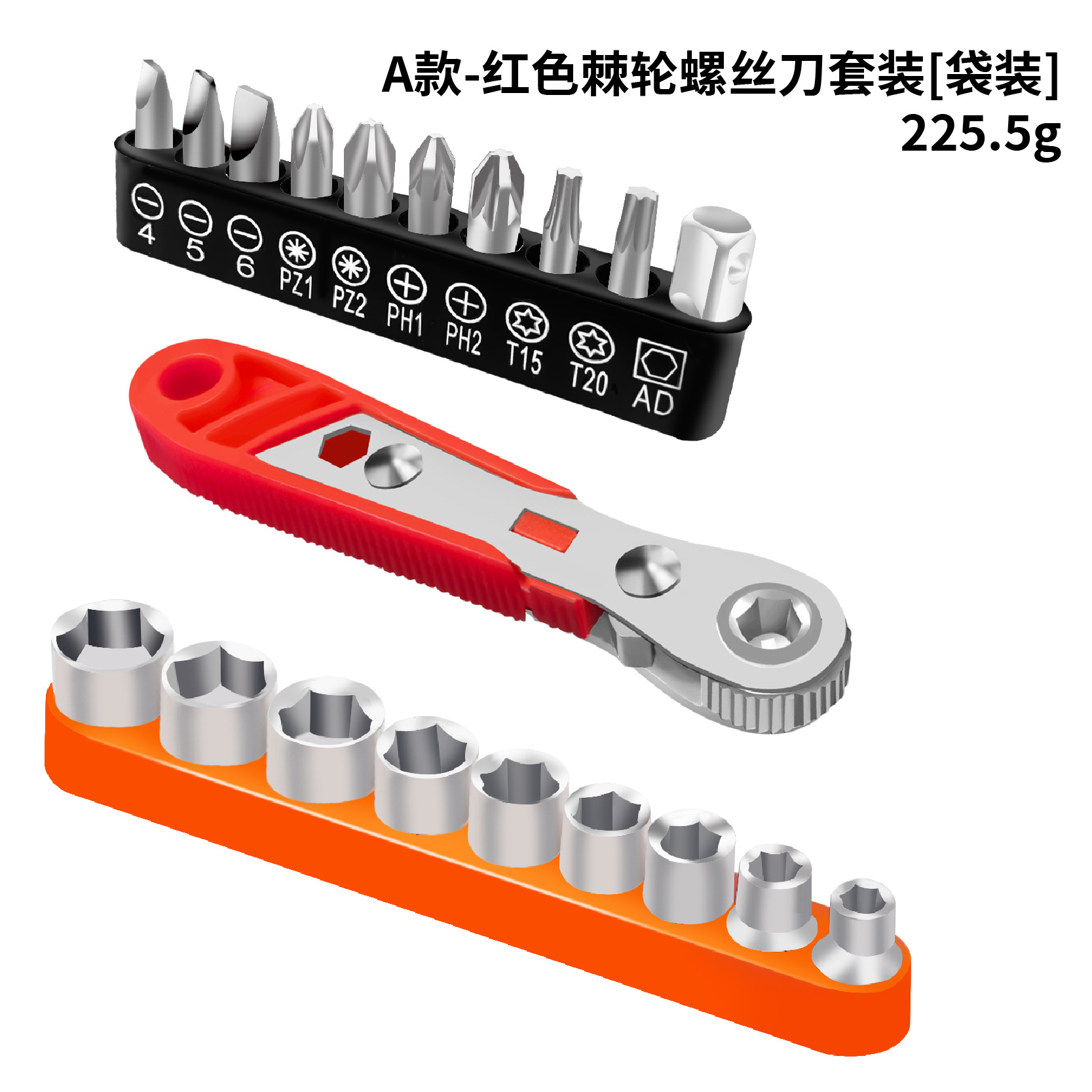 • A형 - 가로 주황색 래칫 드라이버 + 검정색 베이스(AD 10홀 비트 포함) + 주황색 9개 소켓 [가방] 225.5g